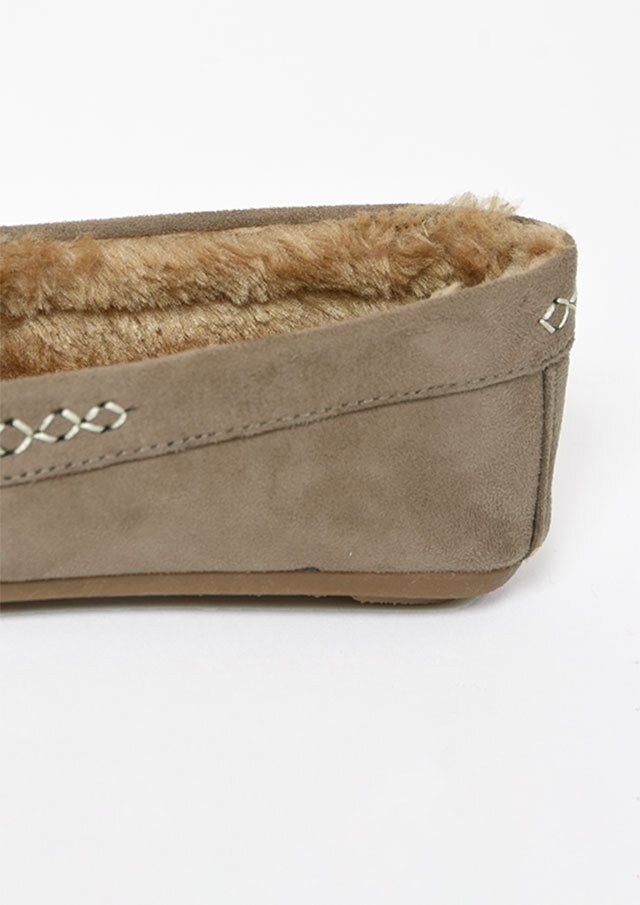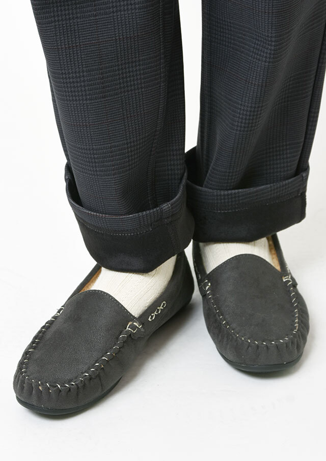 中側全体エコファー仕様でふわもこ暖かなモカシンシューズです。シンプルな中にサイドと踵側のステッチがポイント。シンプルな見た目で幅広いスタイリングに合わせて頂ける1足です。