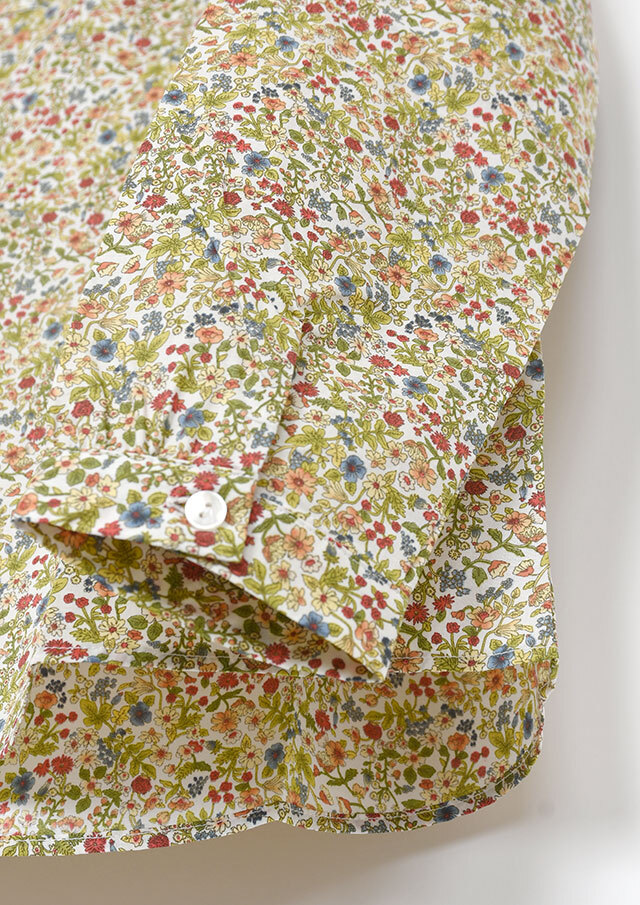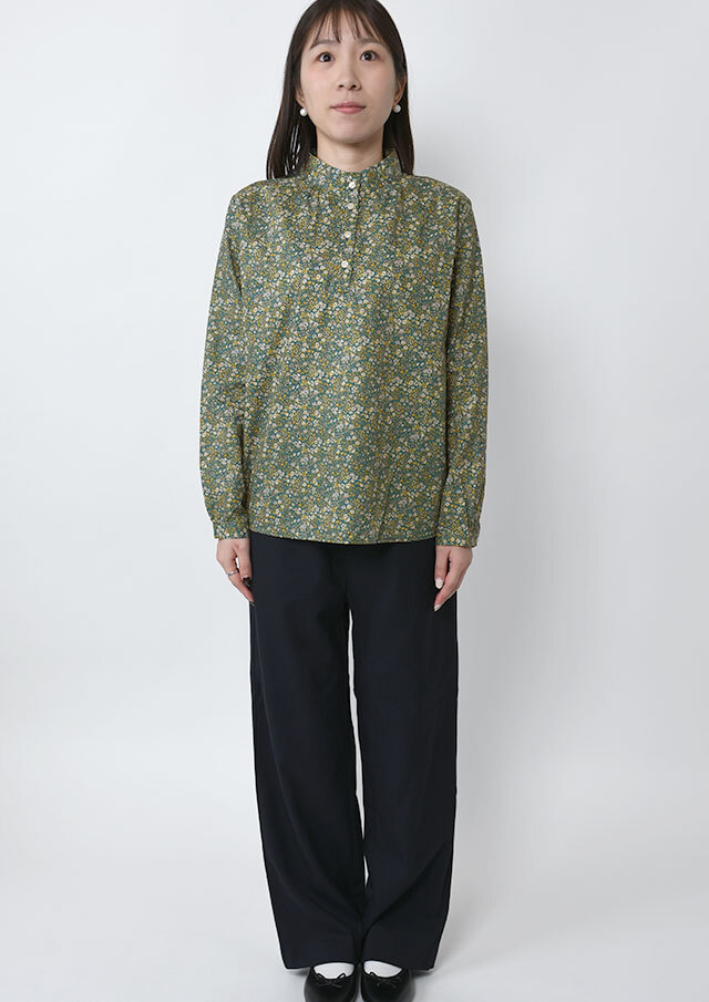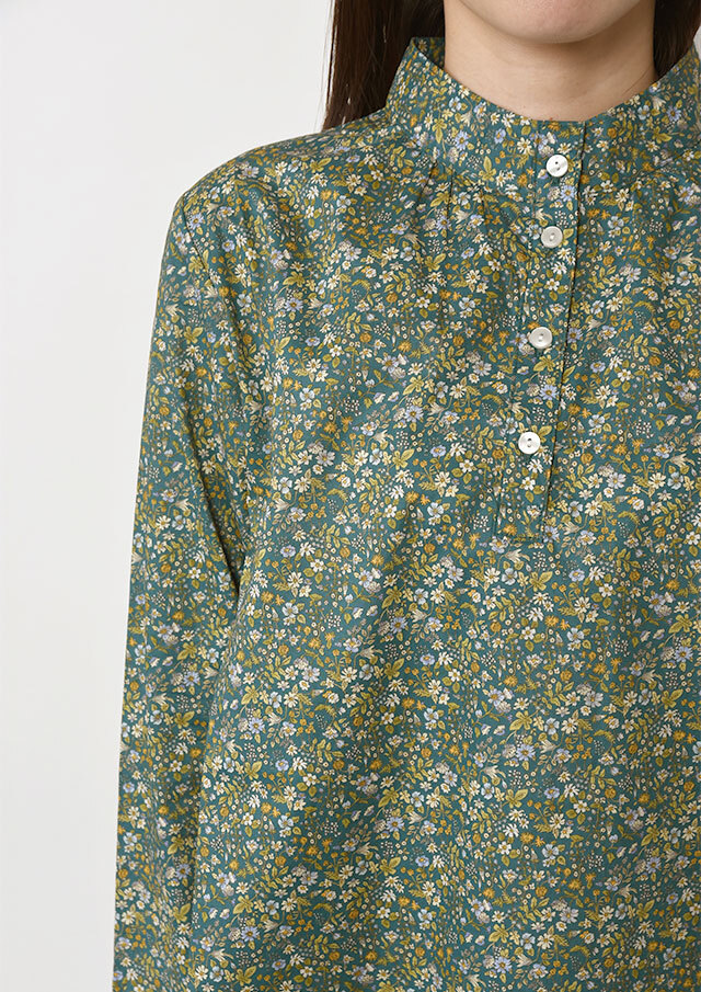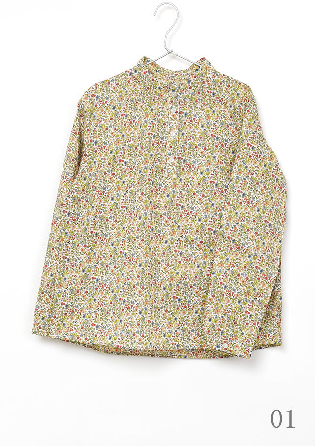 小花柄が上品に映える、さらりとした風合いのコットンローン生地のプルオーバーブラウス。軽やかで柔らかな生地感が、女性らしいシルエットを引き立てます。首元をすっきりと見せるハイネックデザインで、クラシカルな雰囲気に。一枚で着映えするのはもちろん、ジャケットやカーディガンのインにもおすすめです♪
