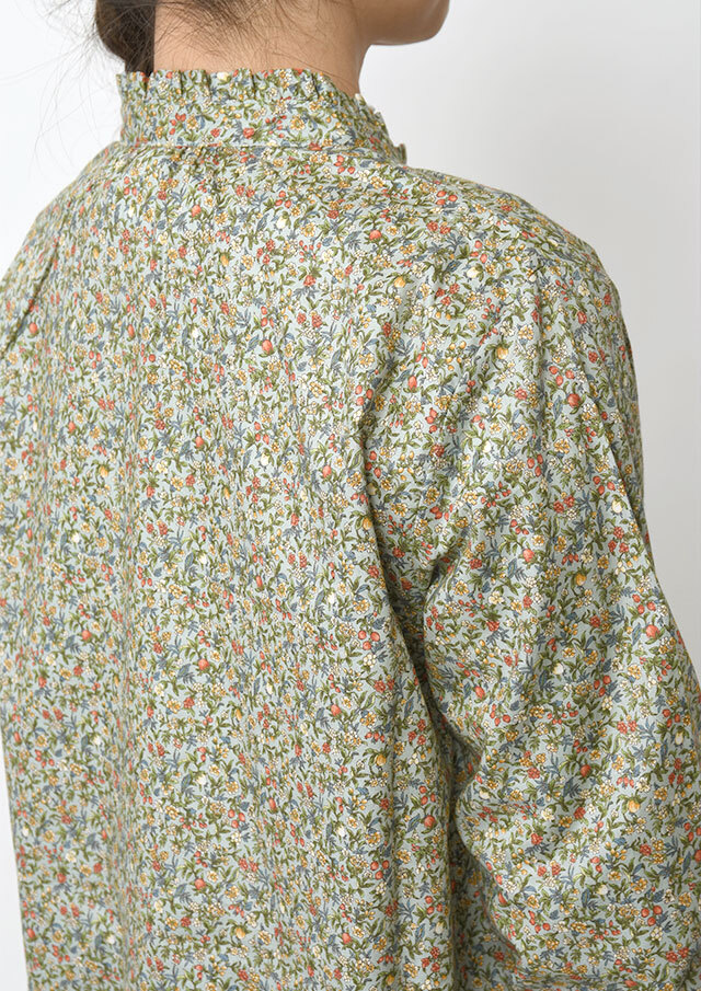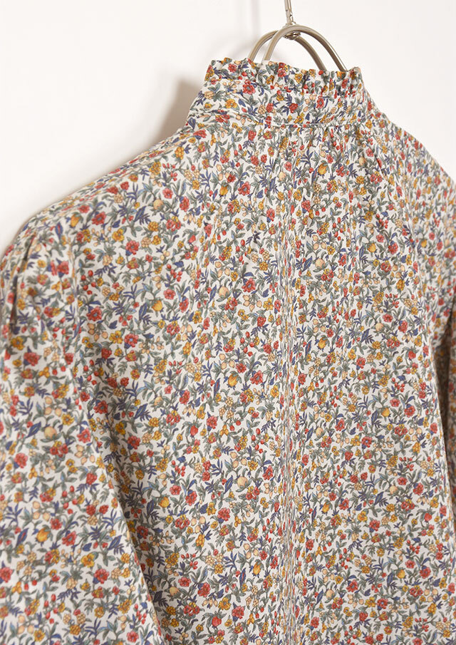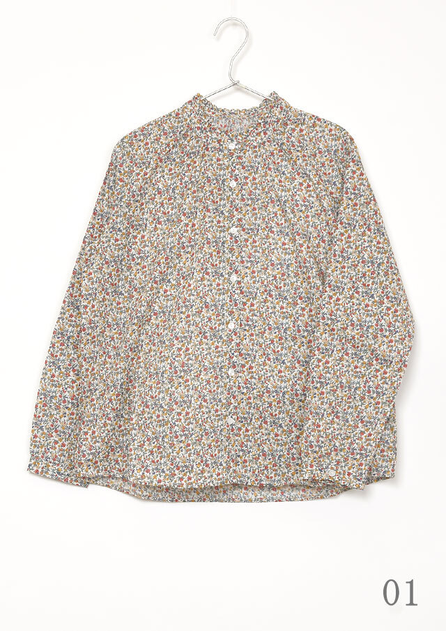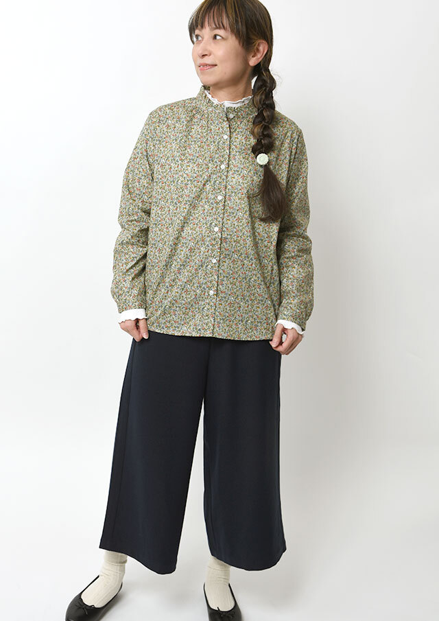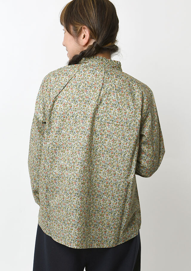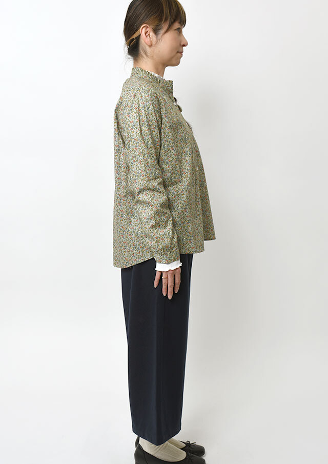 小花柄が目を惹く春らしいスタンドフリルブラウス。首元のフリルがさりげなく華やぎ、1枚でコーディネートの主役になるアイテムです。軽やかで上質感のある80ローン生地を使用し、さらっとした着心地に仕上げました。パンツからスカートまで幅広く合わせやすく、着映えトップスとして活躍します。