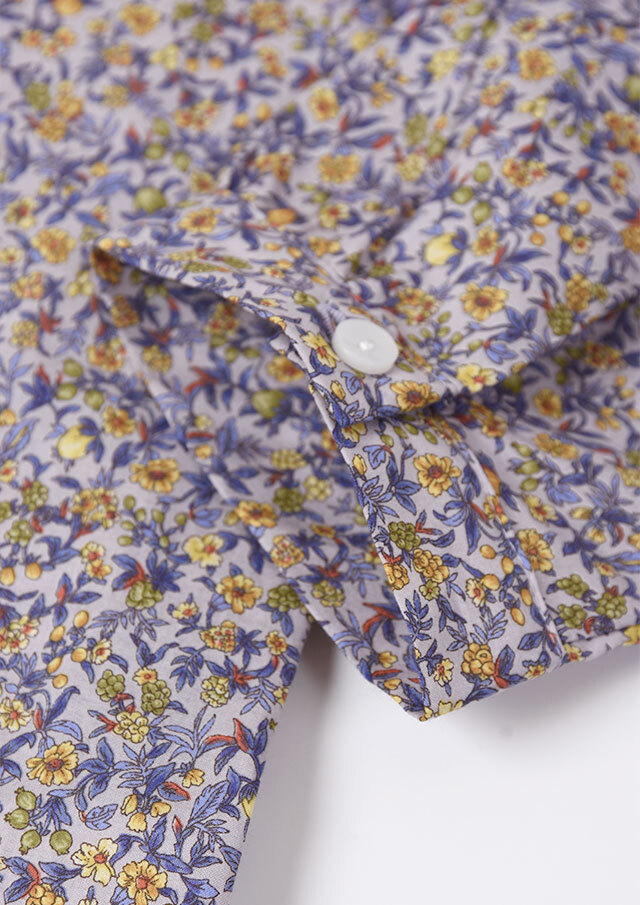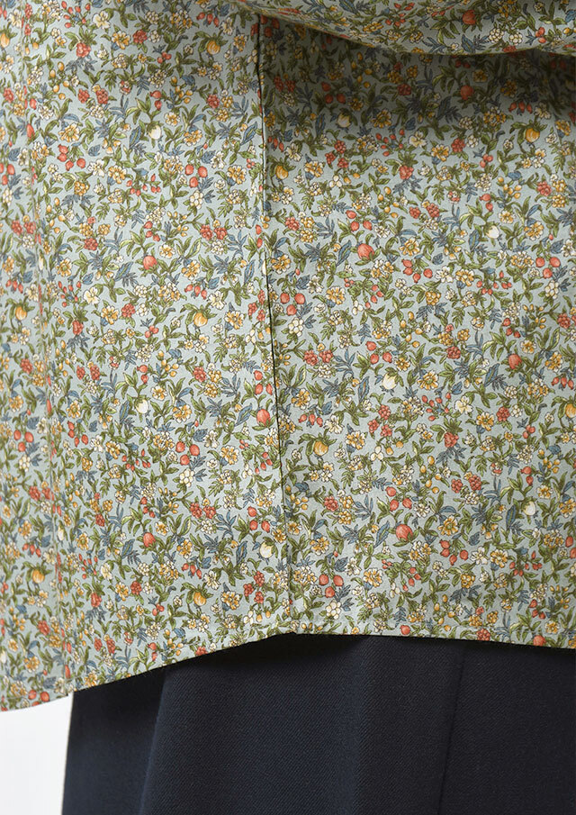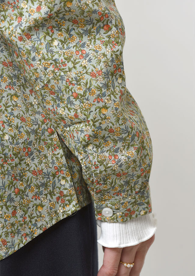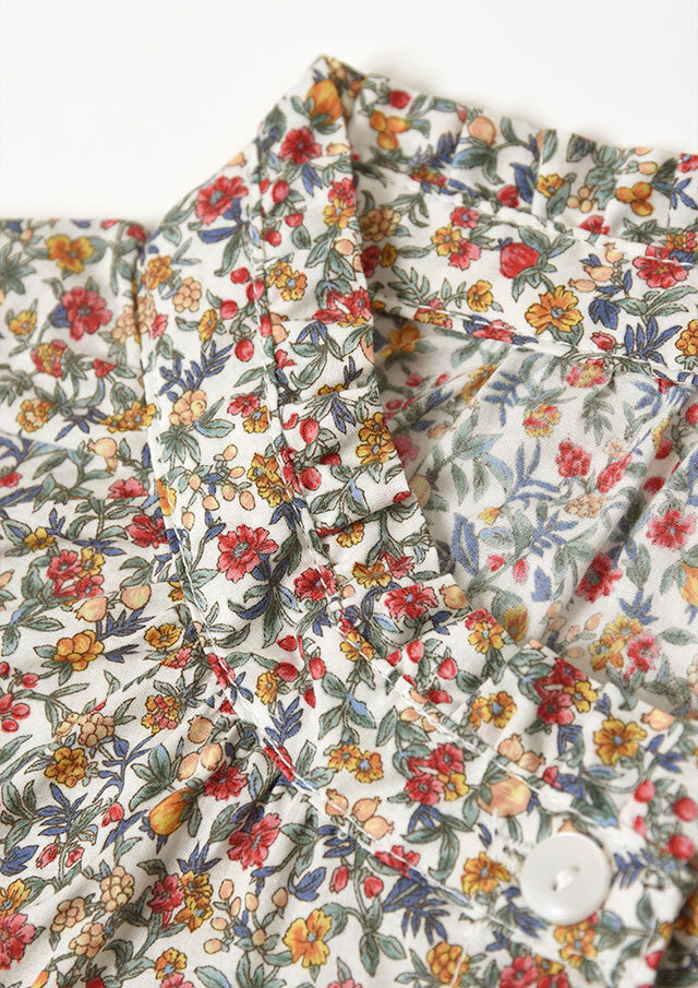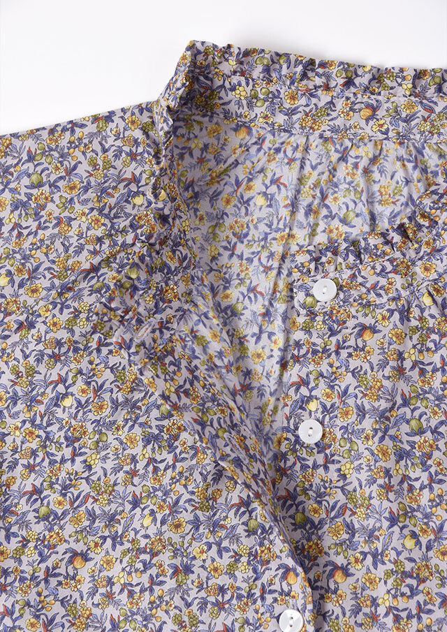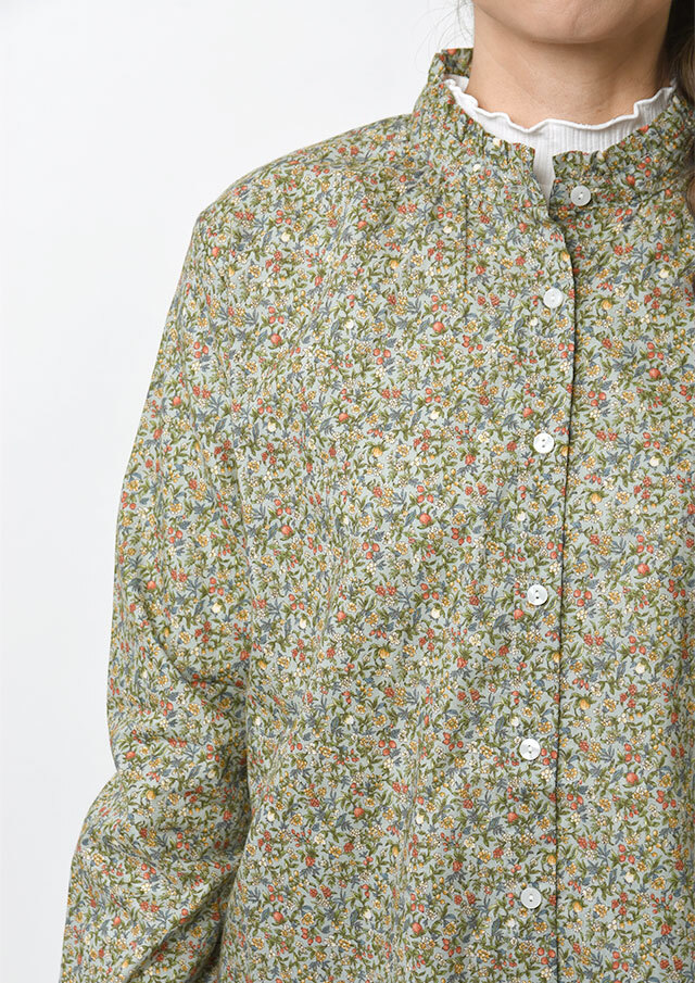 小花柄が目を惹く春らしいスタンドフリルブラウス。首元のフリルがさりげなく華やぎ、1枚でコーディネートの主役になるアイテムです。軽やかで上質感のある80ローン生地を使用し、さらっとした着心地に仕上げました。パンツからスカートまで幅広く合わせやすく、着映えトップスとして活躍します。