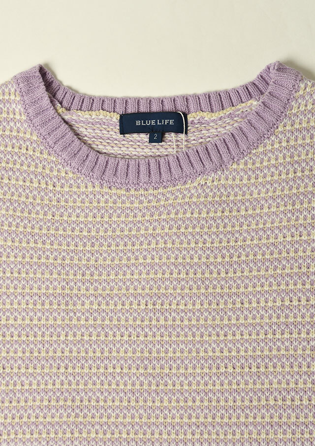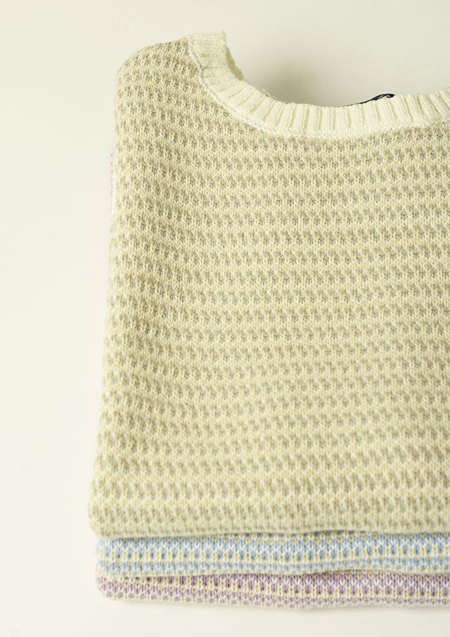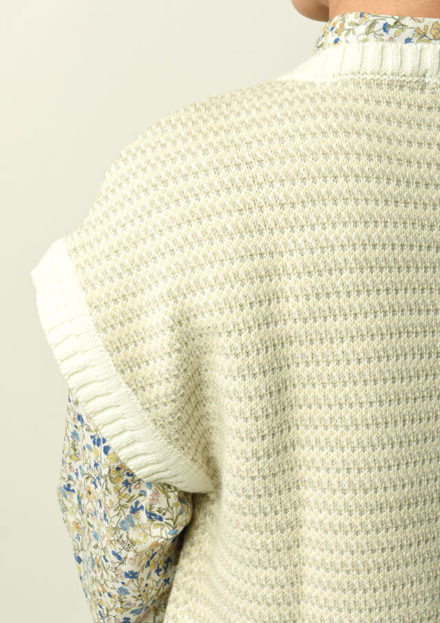 柔らかな色合いの配色で編み上げられた可愛らしい表情のニットベスト。サイドスリット入りでレイヤードスタイルもすっきり見え◎。カジュアルなカットソーからきちんとブラウスまでレイヤードするアイテムにより様々な着こなしを楽しめます。