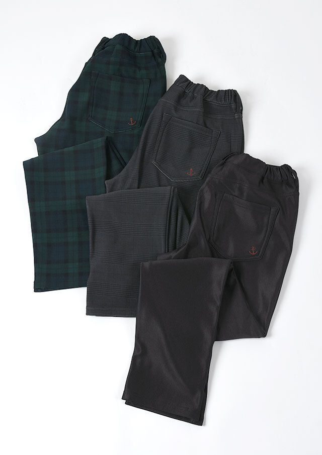 寒い季節に嬉しい、裏起毛生地を使用したパンツが登場。裏起毛が脚全体をやさしく包み込み、ぬくもりをキープ。落ち感とストレッチ性のある生地で動きやすく、ウエストはゴム仕様でストレスフリーなはき心地。シワになりにくく、お手入れも簡単なので、デイリー使いに最適◎カラーは光沢感のあるヘリンボーン、チェック系のグレンチェックとブラックウォッチの3種類。柄物ながらシックな色合いで、様々なトップスにも合わせやすく、きれいめにもカジュアルにも着回し自在です。後ポケットにワンポイントのイカリ刺繍入り。