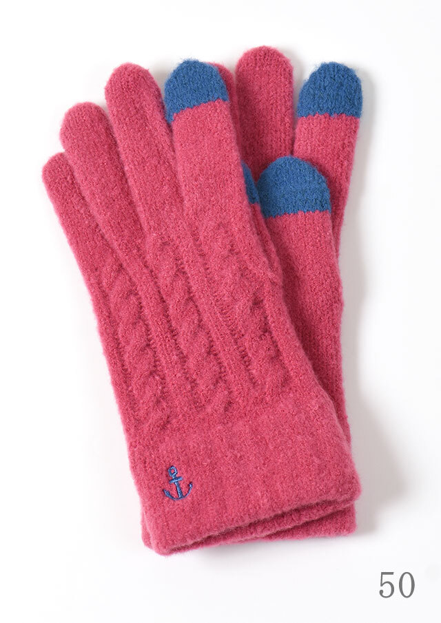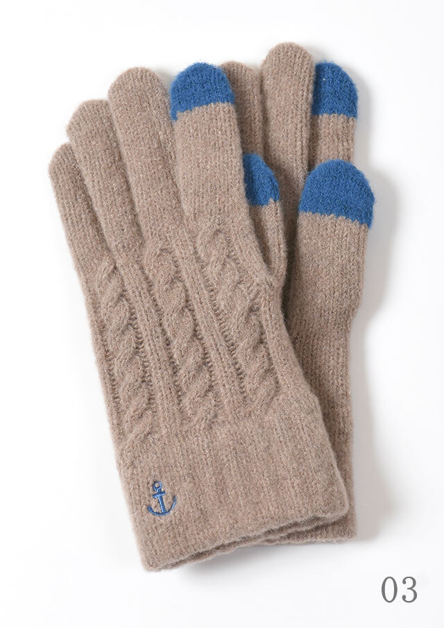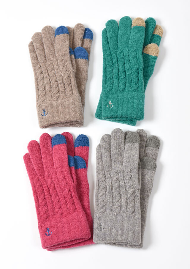 あたたかみのあるケーブル編みニットグローブ。手首のイカリ刺繍もポイントです。