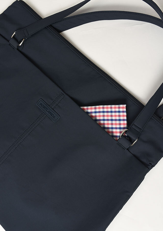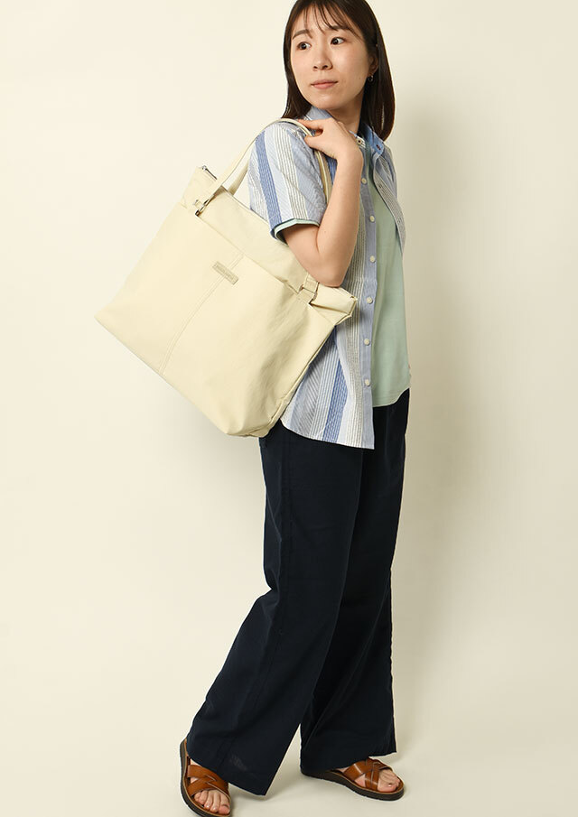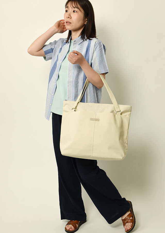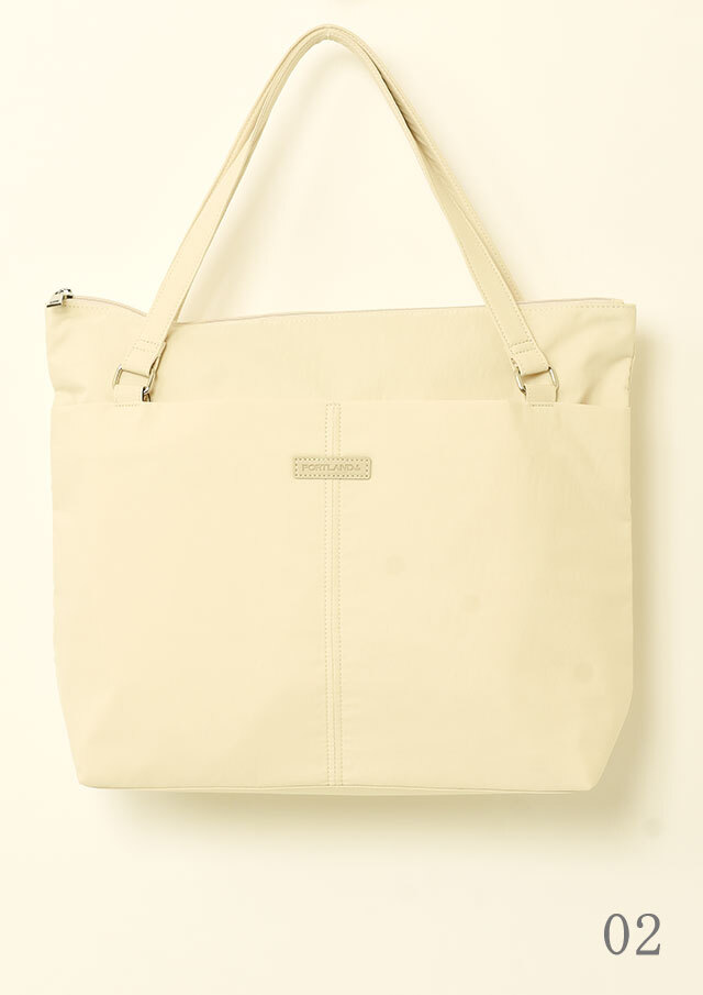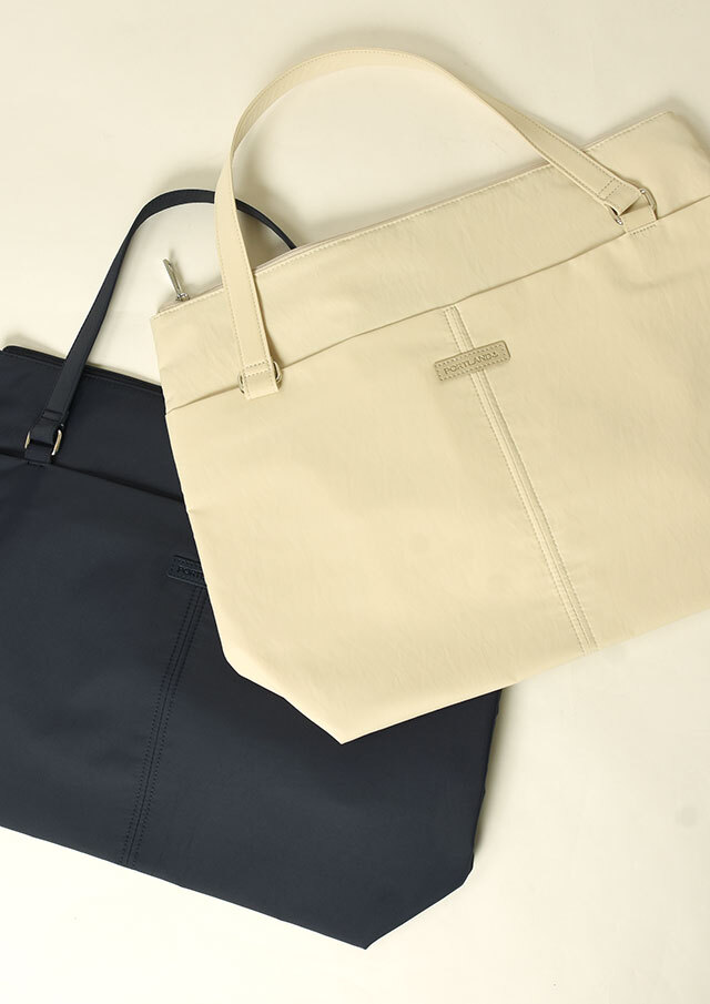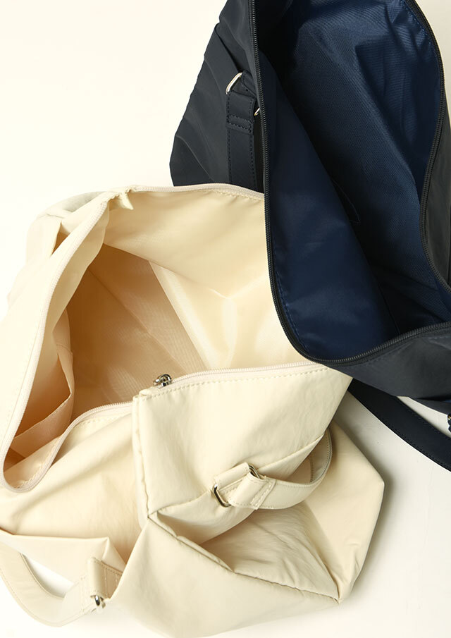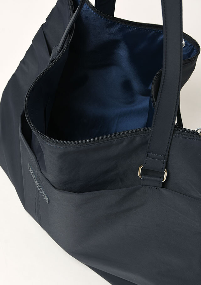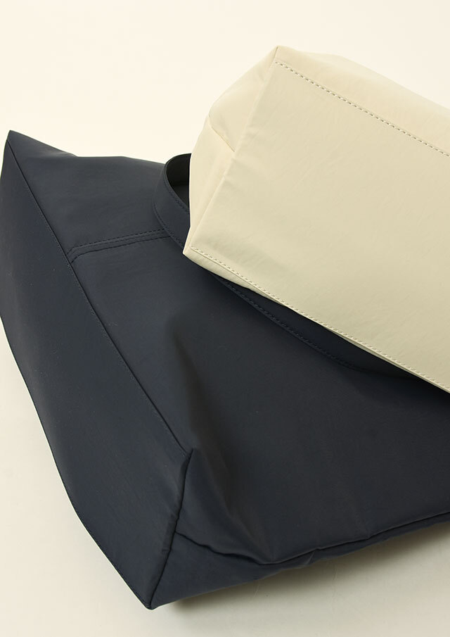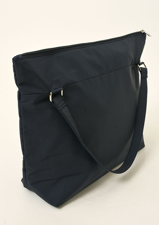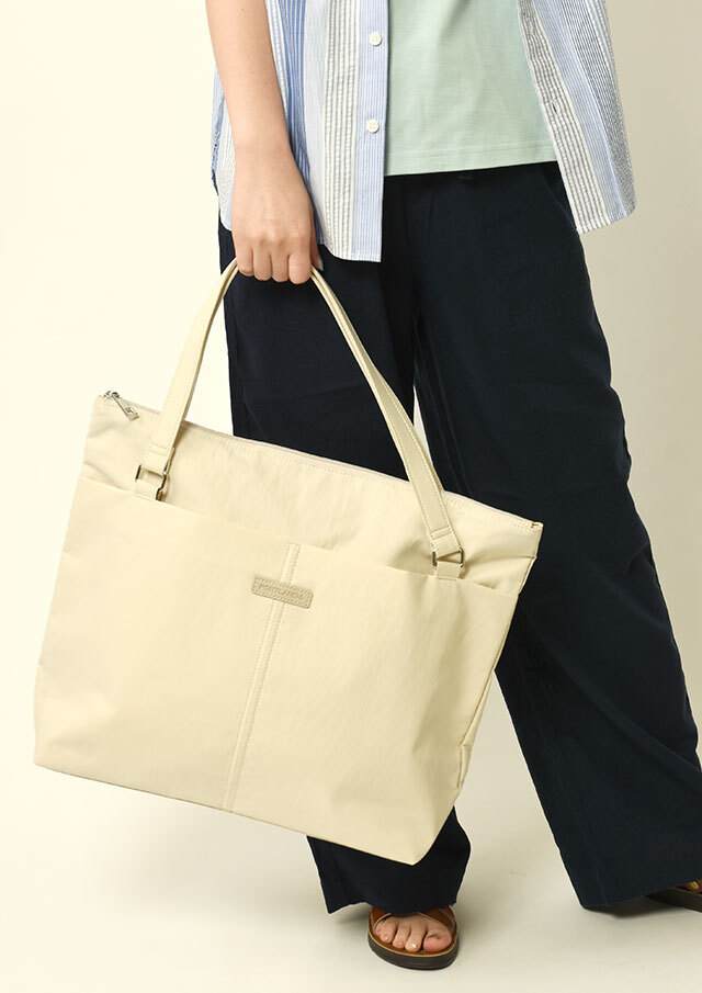 荷物がたっぷり入るビッグトートは軽量のナイロン素材で季節や流行を問わないシンプルデザイン。フロントにはオープンポケット2つと内装にも小物ポケットが2つ備わっています。メイン収納はファスナー仕様です。
