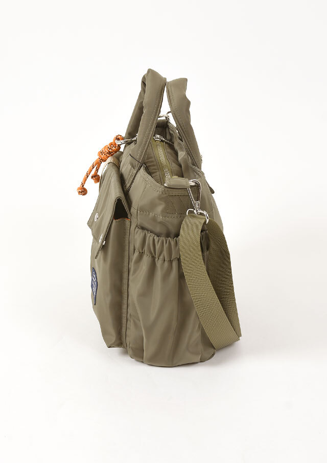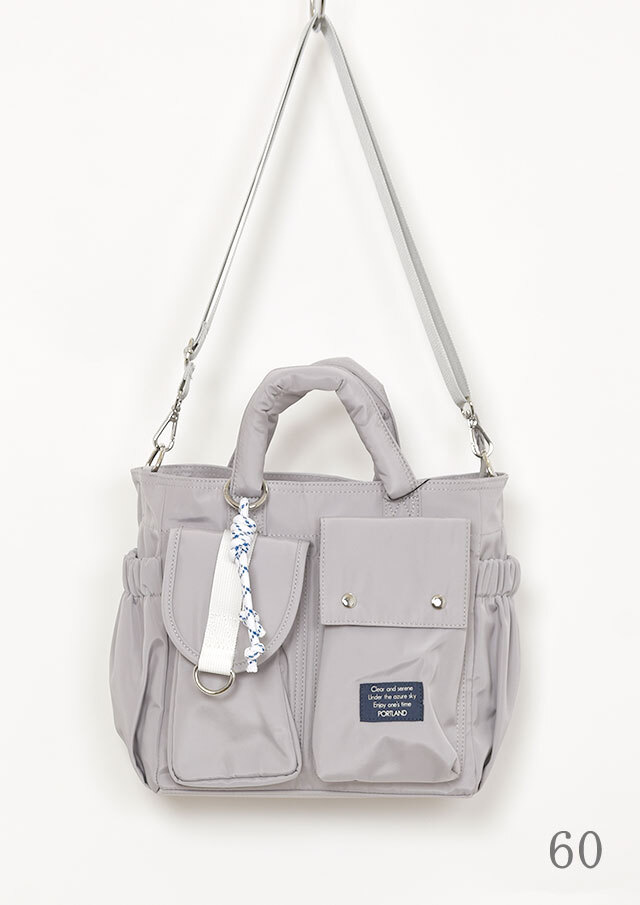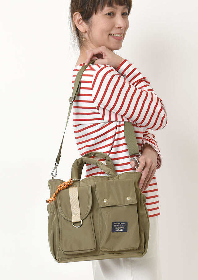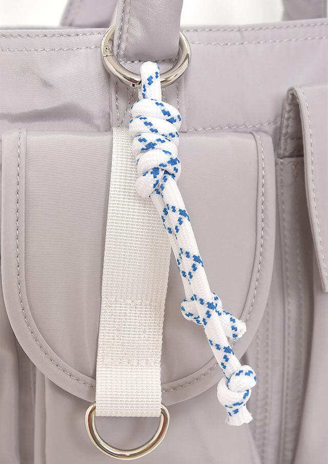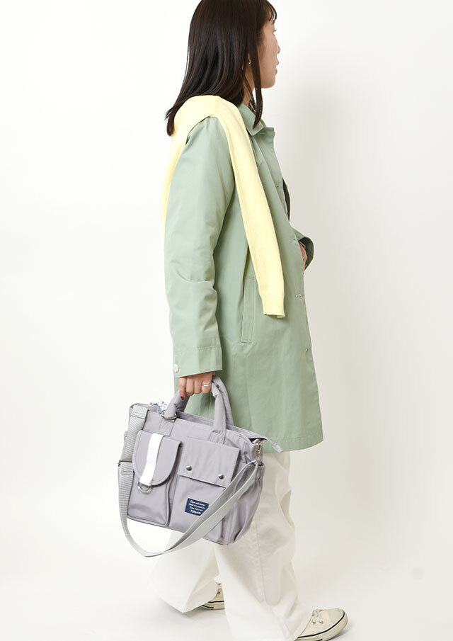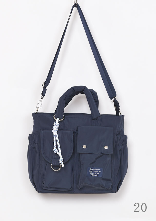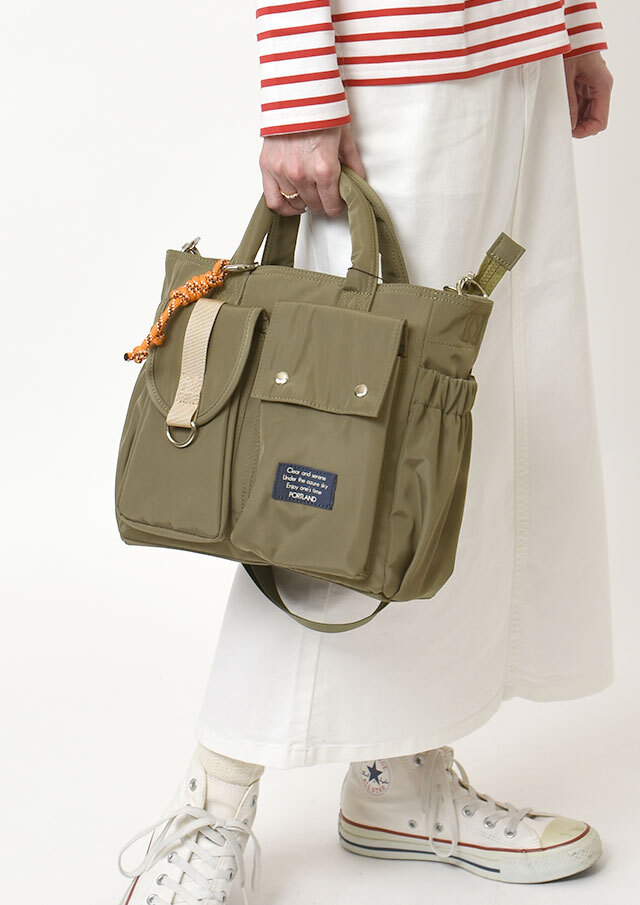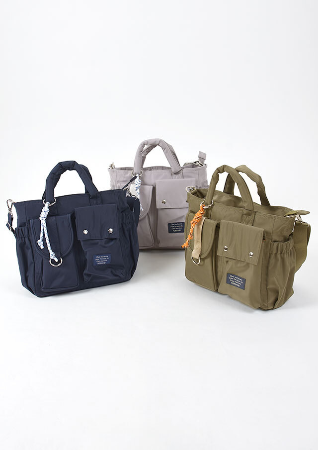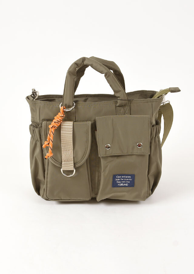 フロントフラップ付きのポケットがポイントになったトートバッグ。全部で6箇所のポケット付きで小物が散らかりません。ショルダーベルトも付属しているので用途や気分に合わせて2WAYで使えるのもうれしいポイント!オールシーズンOKのナイロン地で取り外しのできるパラコードチャーム付きです。