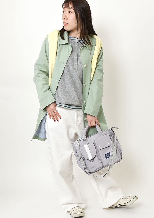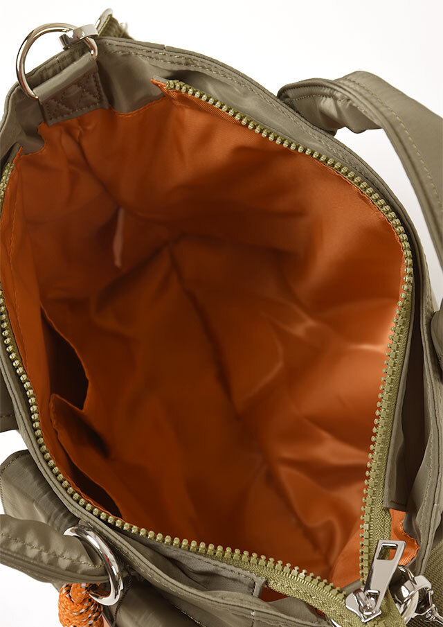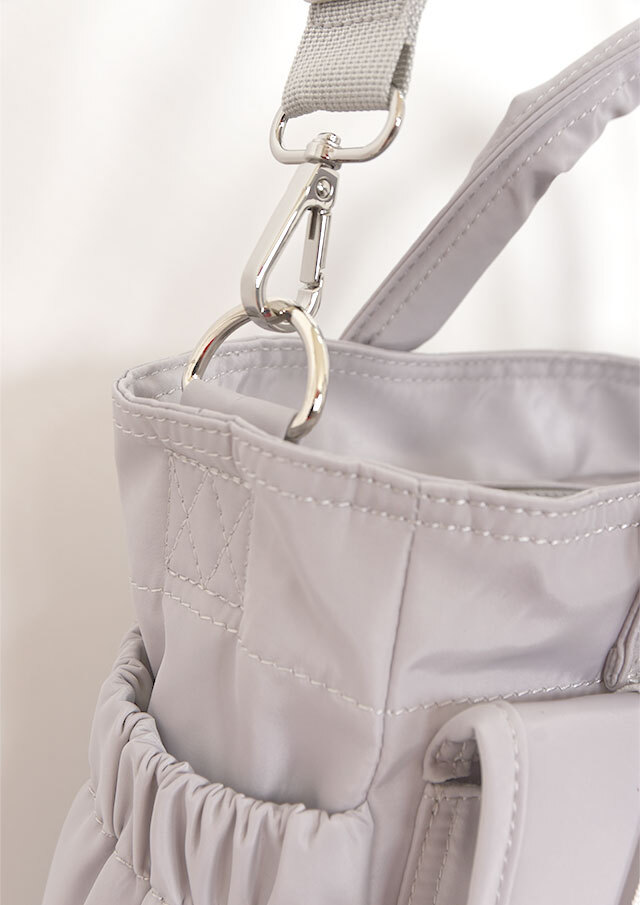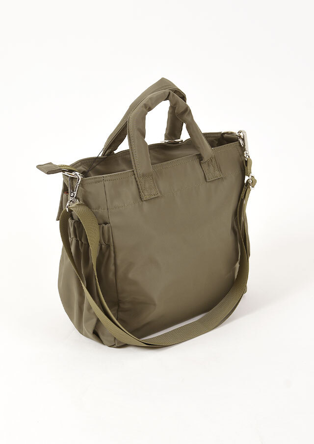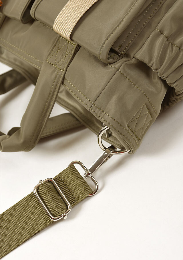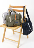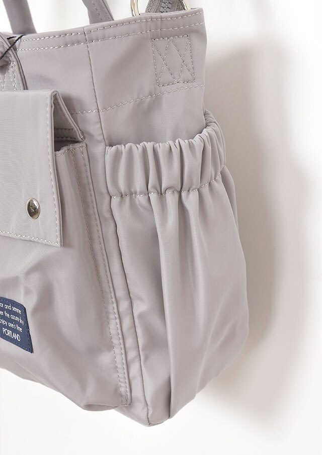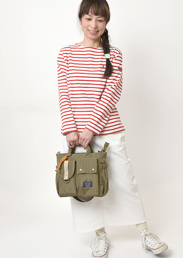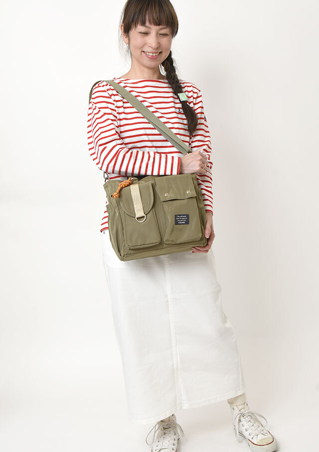 フロントフラップ付きのポケットがポイントになったトートバッグ。全部で6箇所のポケット付きで小物が散らかりません。ショルダーベルトも付属しているので用途や気分に合わせて2WAYで使えるのもうれしいポイント!オールシーズンOKのナイロン地で取り外しのできるパラコードチャーム付きです。
