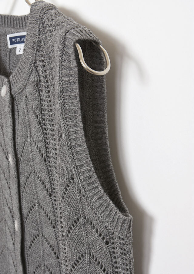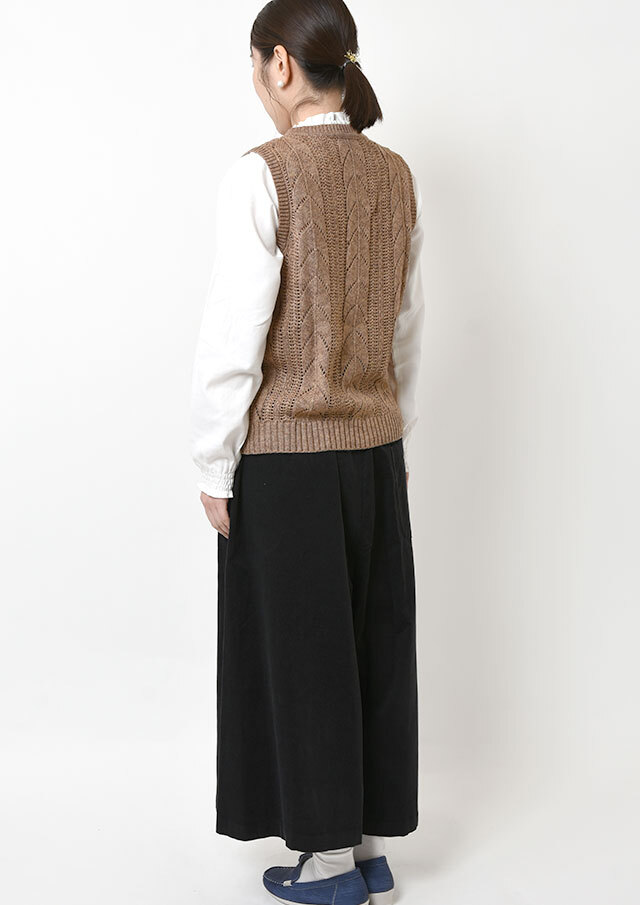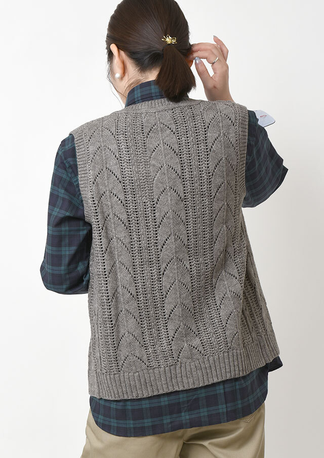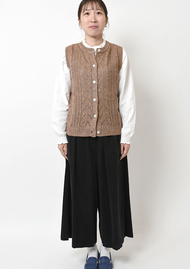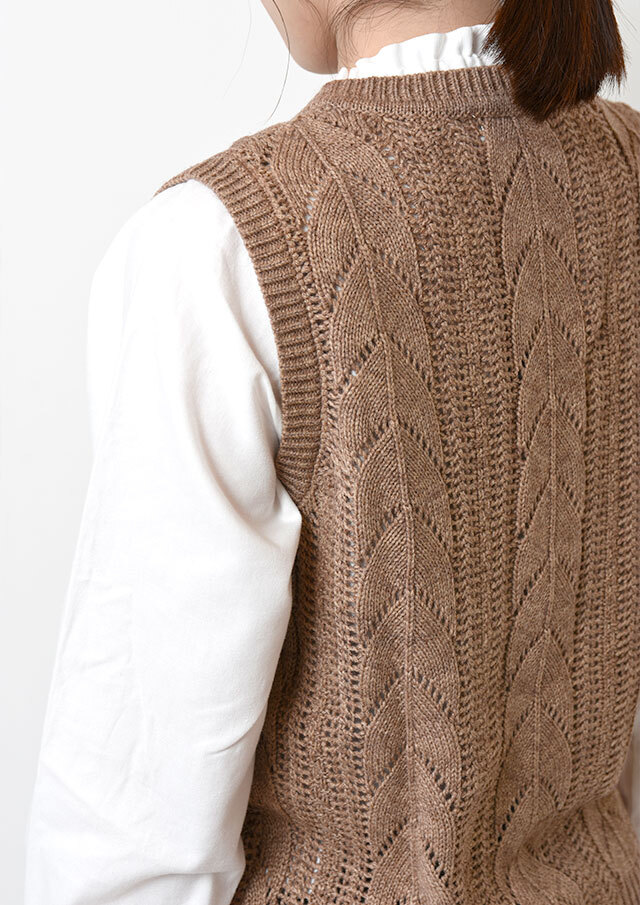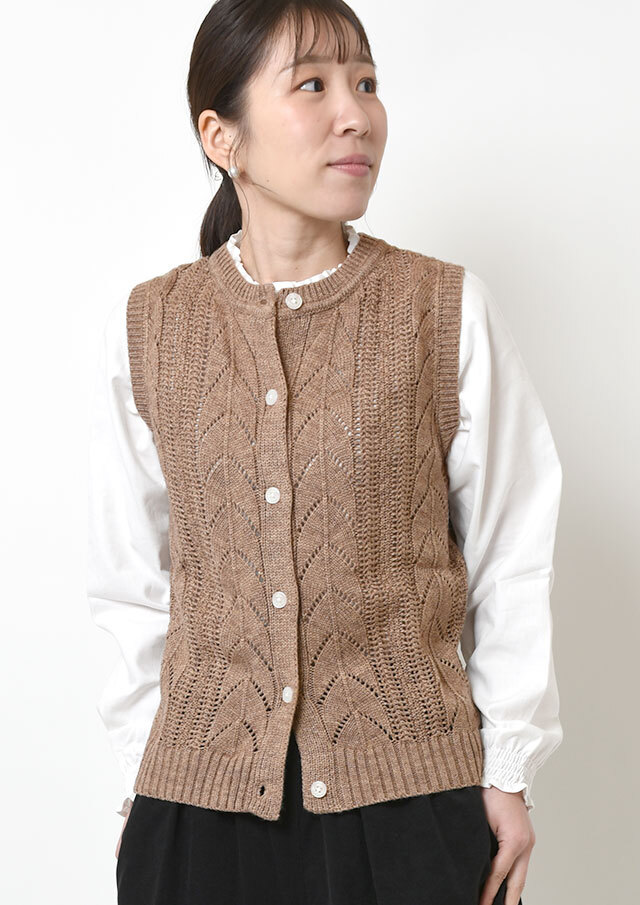 透かし編みを施した、表情豊かなニットベスト。ブラウスやカットソーの上に重ねるのはもちろん、ボタンを開けて羽織るスタイルもおすすめ。ややコンパクトなサイズ感で、すっきりとした印象に仕上がります。アクリル×毛素材で、軽さとあたたかさを両立。秋口の軽めの羽織として、冬にはアウターのインにと、長く活躍してくれる一枚です。