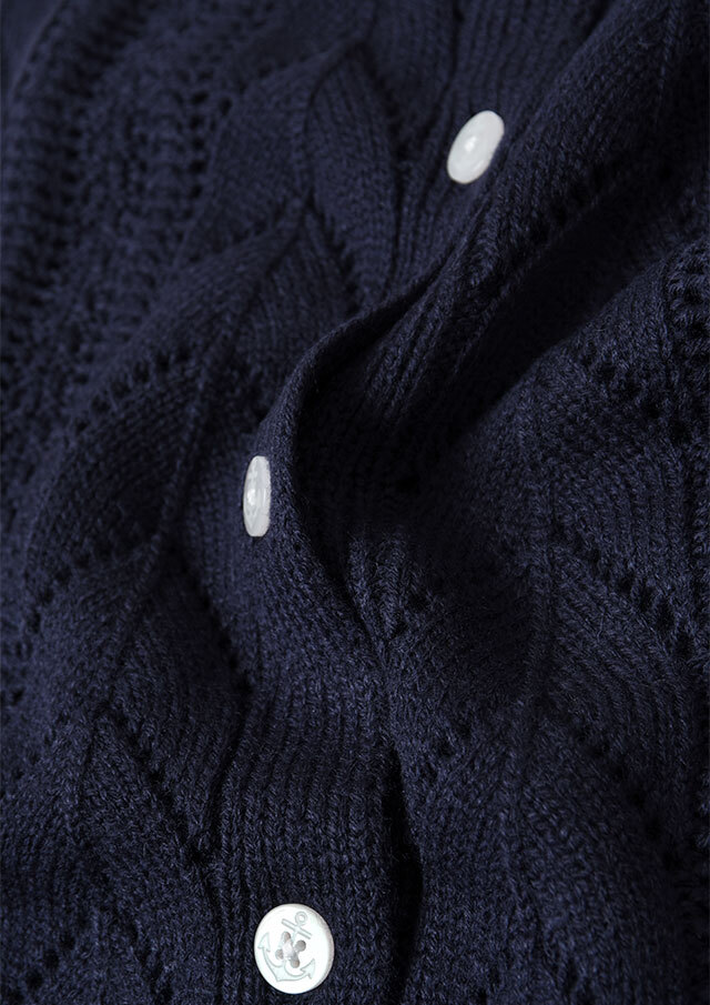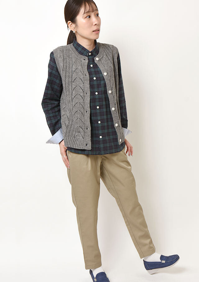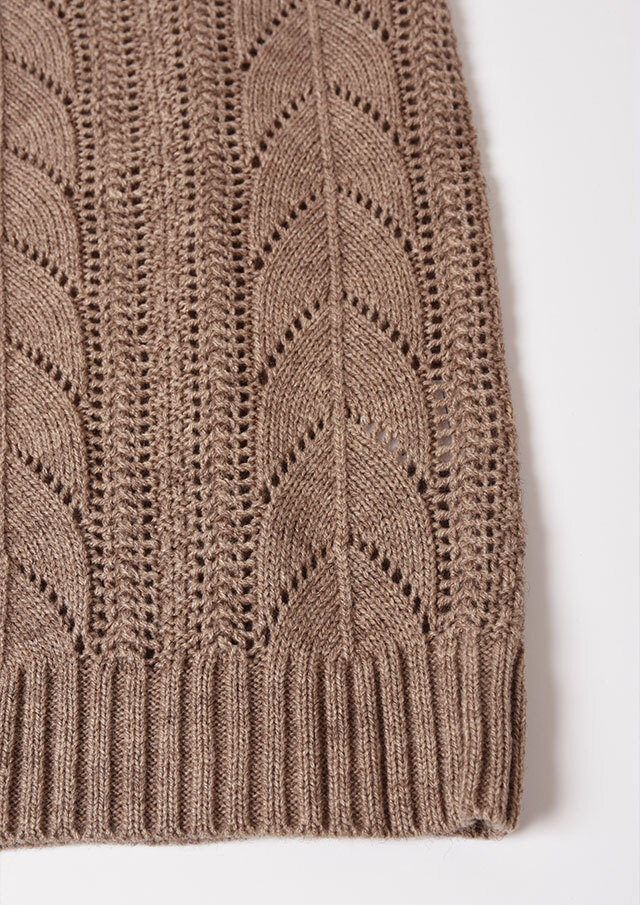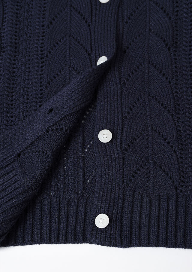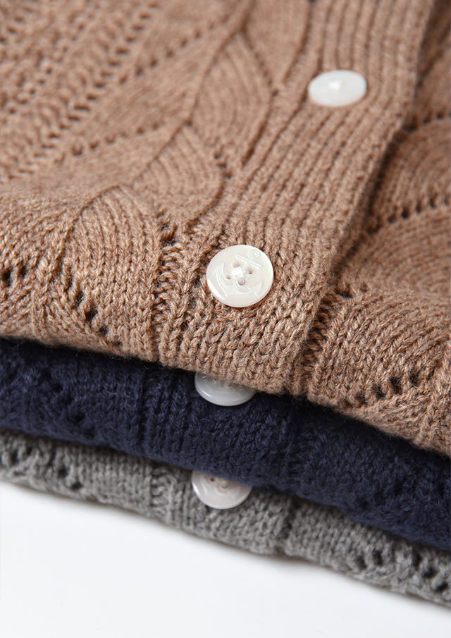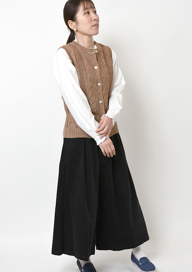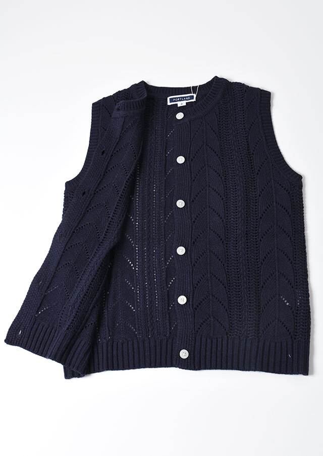 透かし編みを施した、表情豊かなニットベスト。ブラウスやカットソーの上に重ねるのはもちろん、ボタンを開けて羽織るスタイルもおすすめ。ややコンパクトなサイズ感で、すっきりとした印象に仕上がります。アクリル×毛素材で、軽さとあたたかさを両立。秋口の軽めの羽織として、冬にはアウターのインにと、長く活躍してくれる一枚です。
