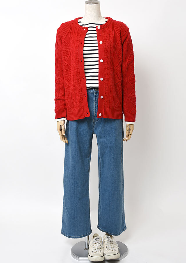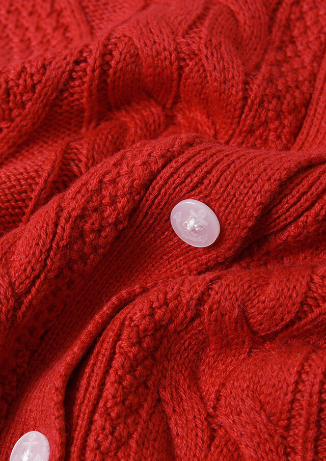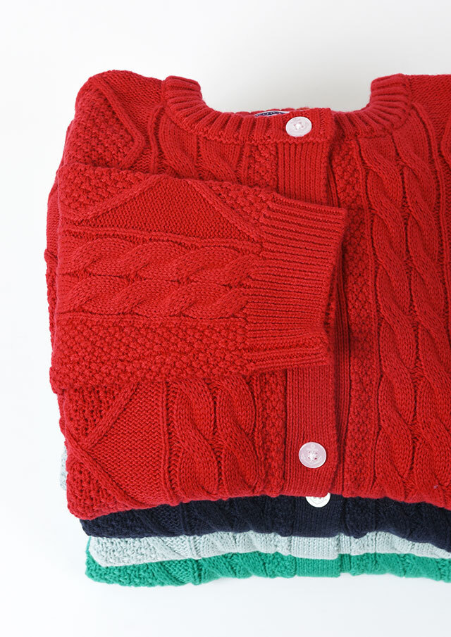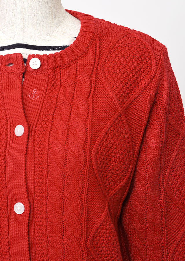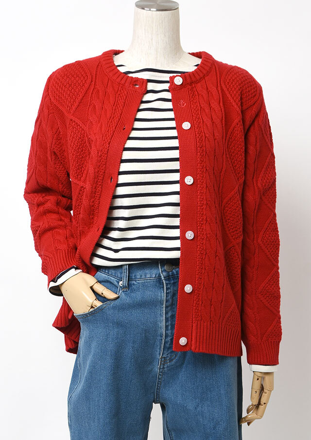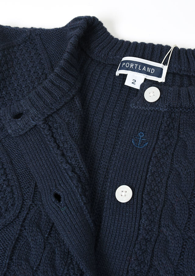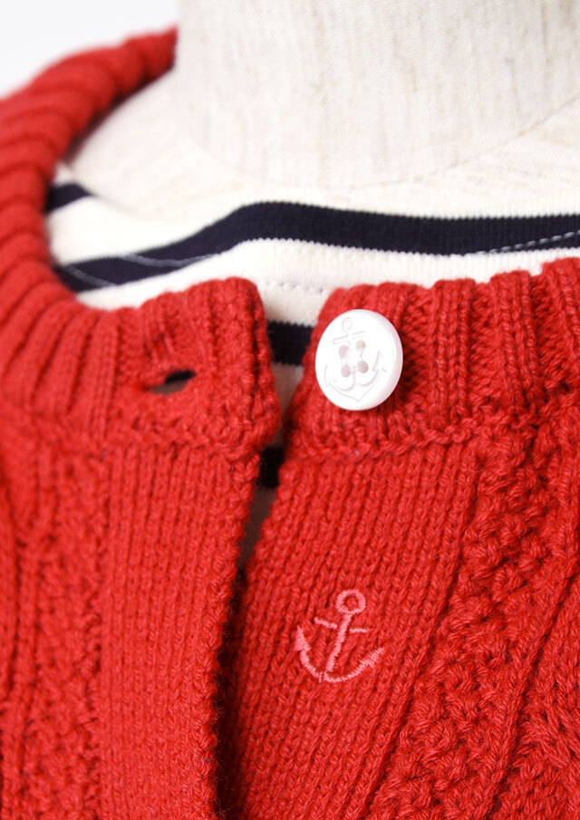 程良い肉感のニットに、フロントのケーブル編みが映えるあったかカーディガン。前立て部分には、第一ボタンと第二ボタンの間にイカリ刺繍を施し、ボタンを開けて着るとイカリがほんのりと見える、遊び心のあるアクセントとなっています。カットソーやシャツ合わせはもちろん、ボタンを留めてトップス感覚で着るのもおすすめ。ボトムスを選ばず、編み柄の立体感がコーデに程よいアクセントをプラスします。