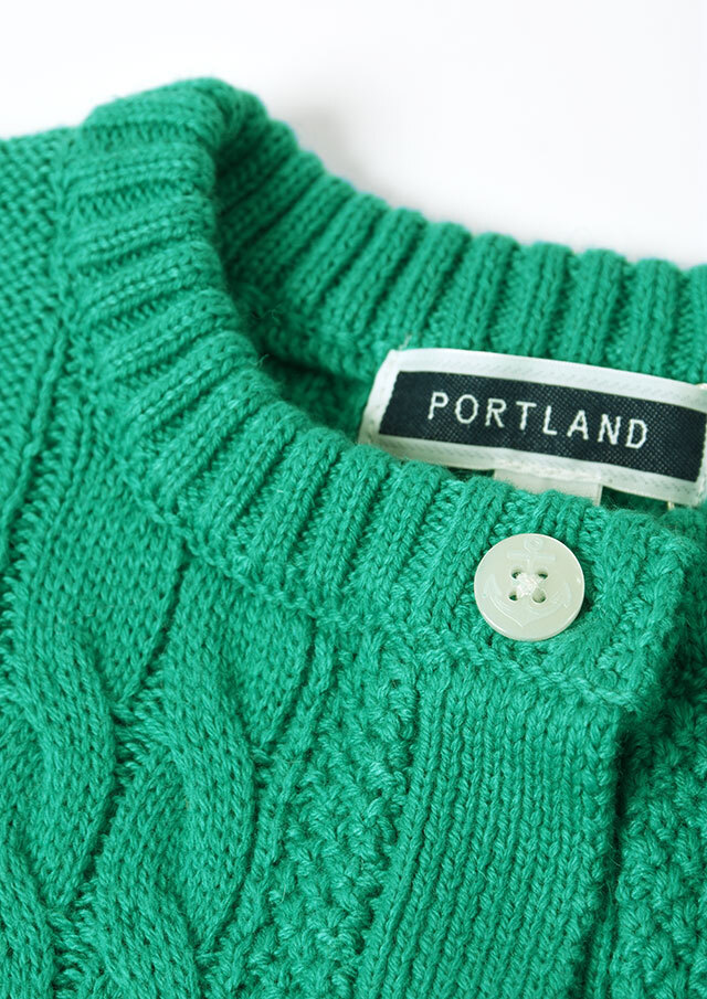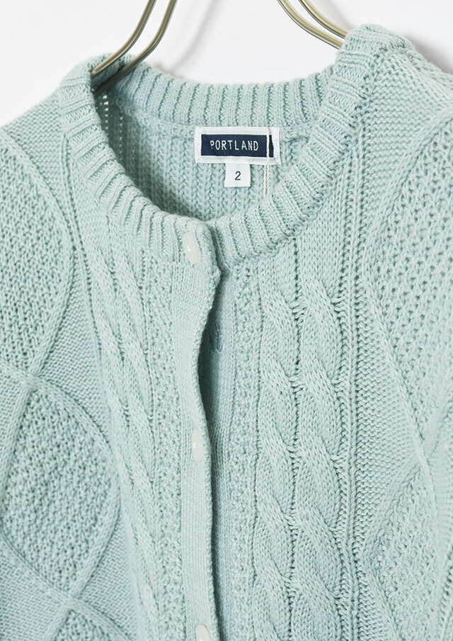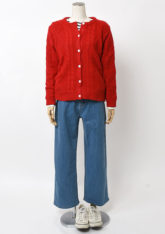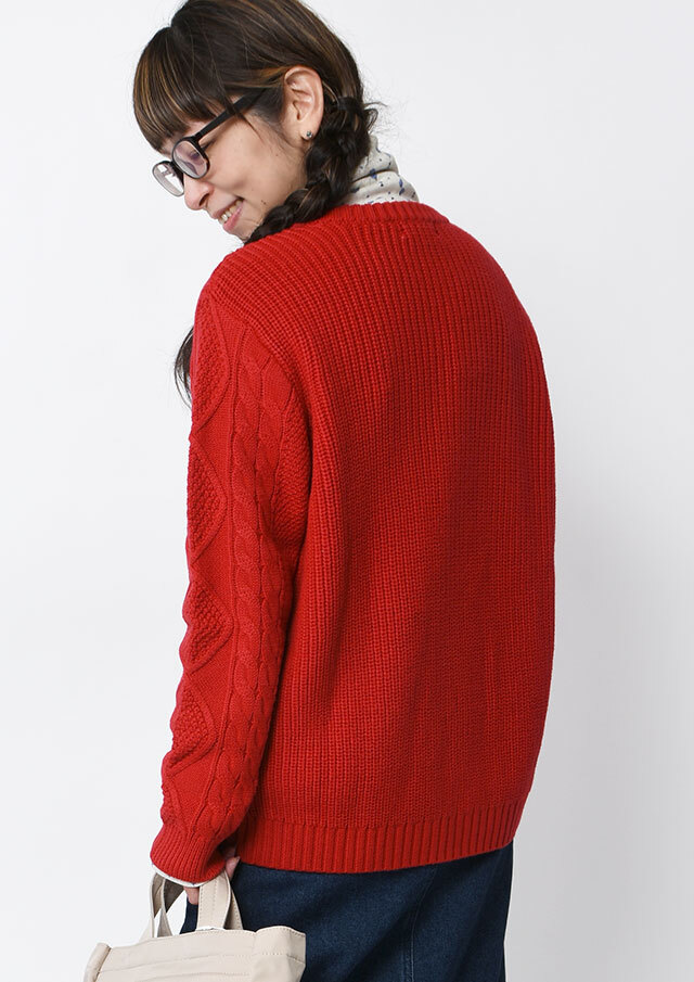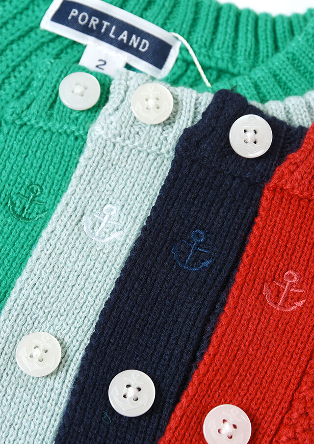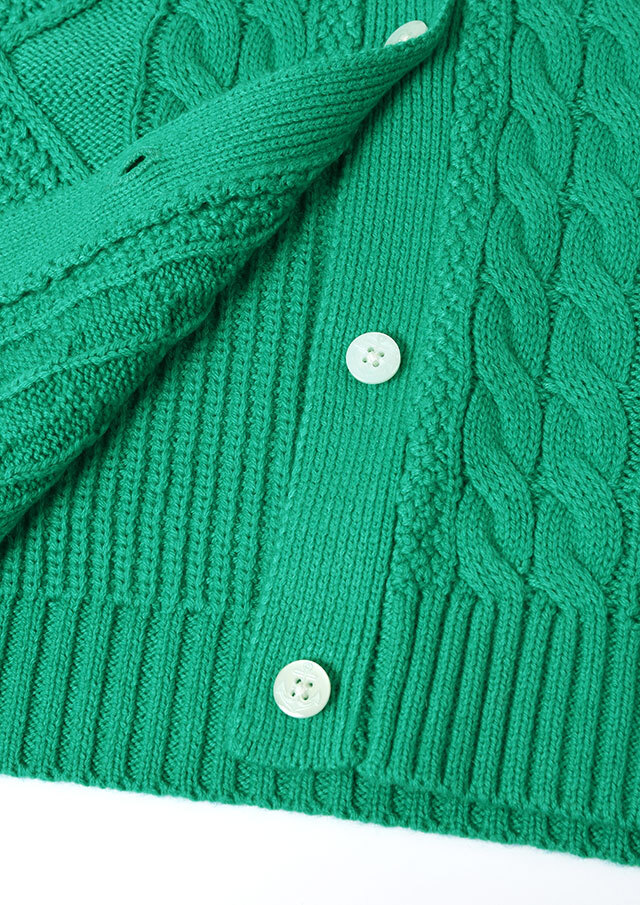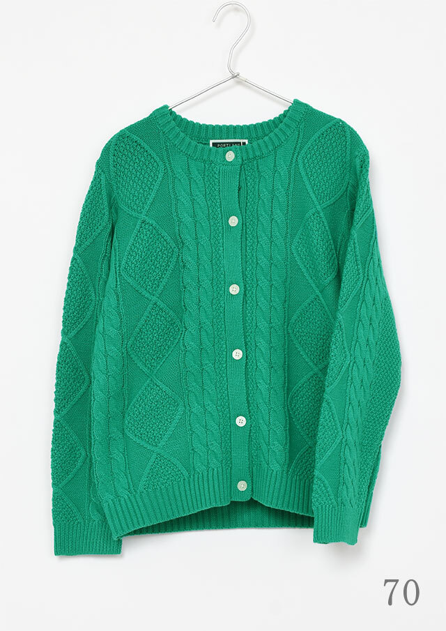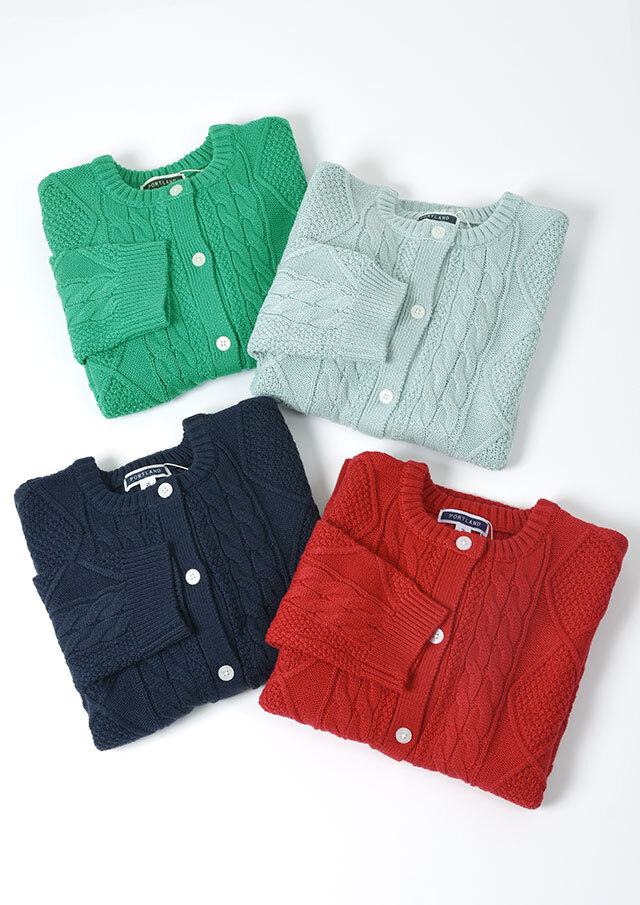 程良い肉感のニットに、フロントのケーブル編みが映えるあったかカーディガン。前立て部分には、第一ボタンと第二ボタンの間にイカリ刺繍を施し、ボタンを開けて着るとイカリがほんのりと見える、遊び心のあるアクセントとなっています。カットソーやシャツ合わせはもちろん、ボタンを留めてトップス感覚で着るのもおすすめ。ボトムスを選ばず、編み柄の立体感がコーデに程よいアクセントをプラスします。