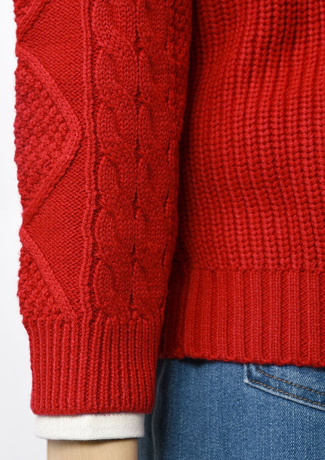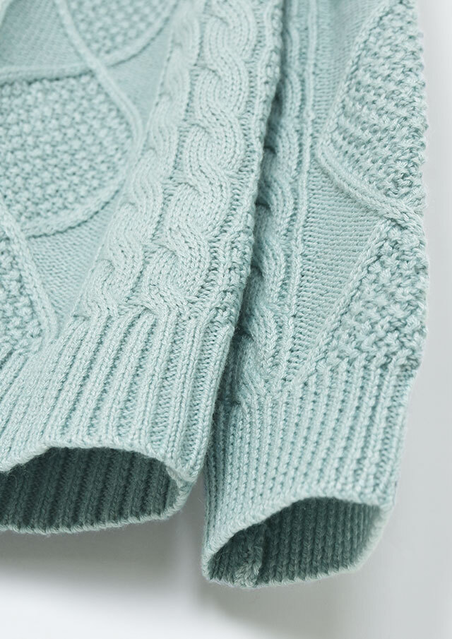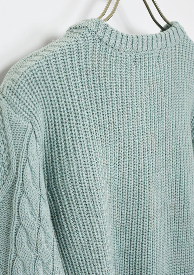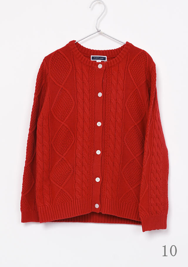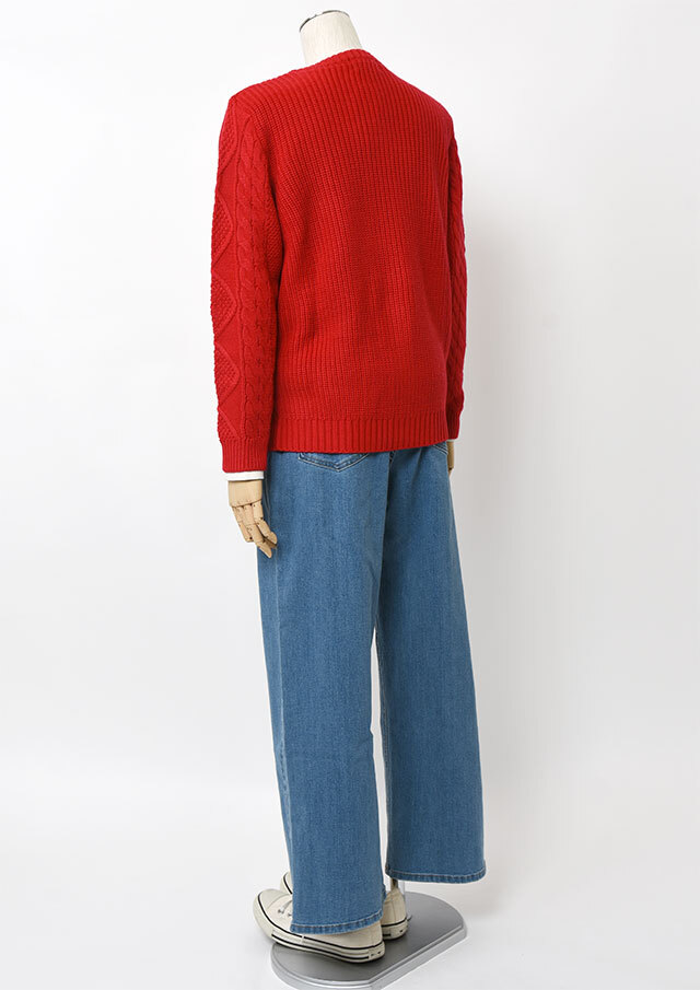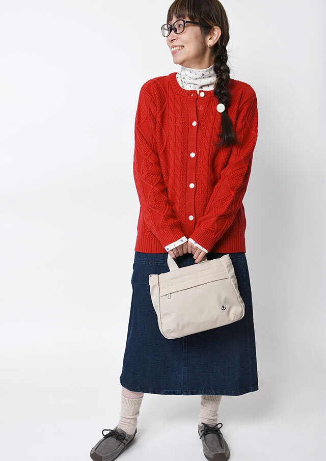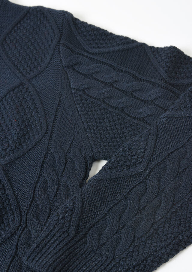 程良い肉感のニットに、フロントのケーブル編みが映えるあったかカーディガン。前立て部分には、第一ボタンと第二ボタンの間にイカリ刺繍を施し、ボタンを開けて着るとイカリがほんのりと見える、遊び心のあるアクセントとなっています。カットソーやシャツ合わせはもちろん、ボタンを留めてトップス感覚で着るのもおすすめ。ボトムスを選ばず、編み柄の立体感がコーデに程よいアクセントをプラスします。