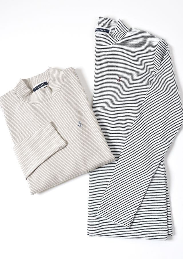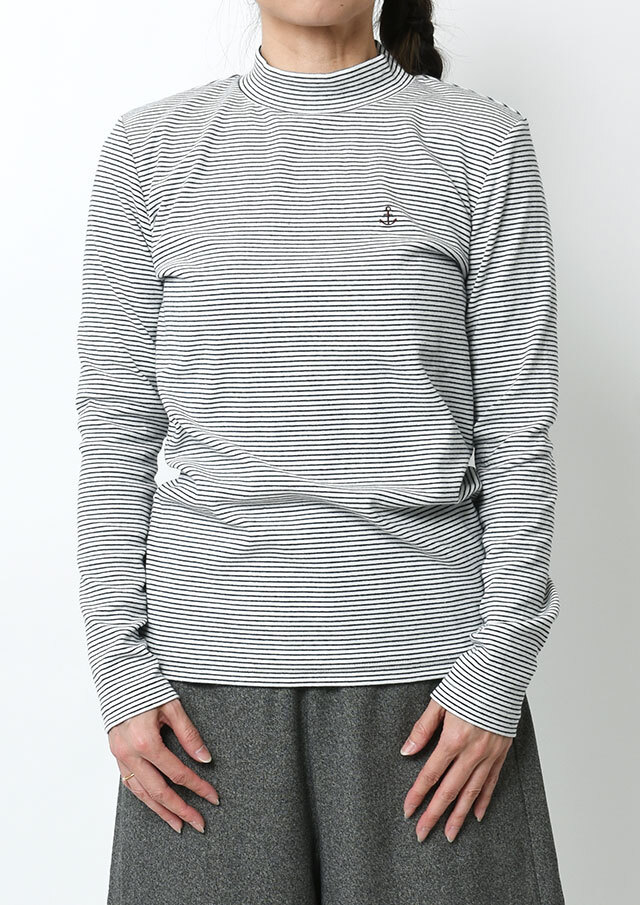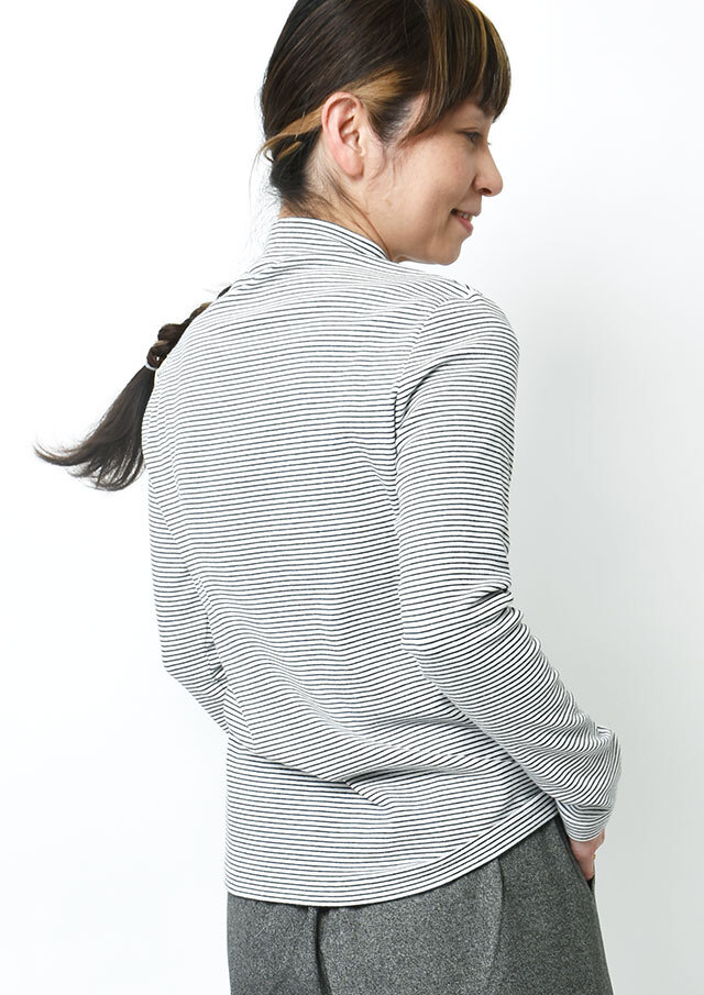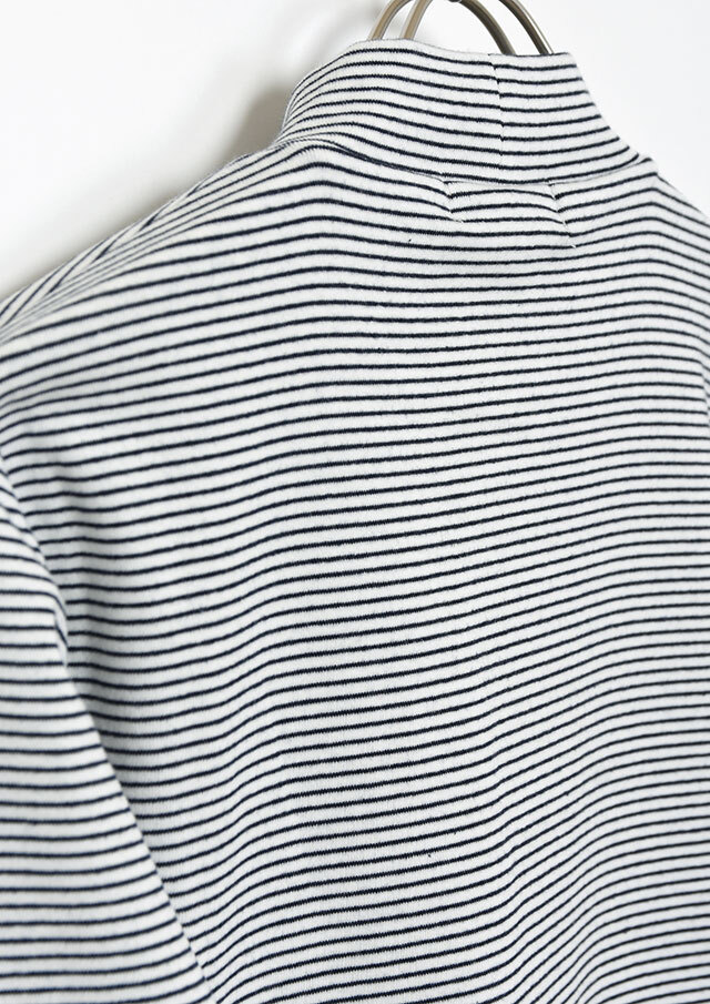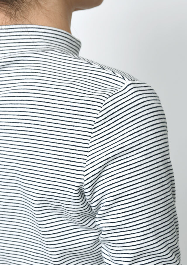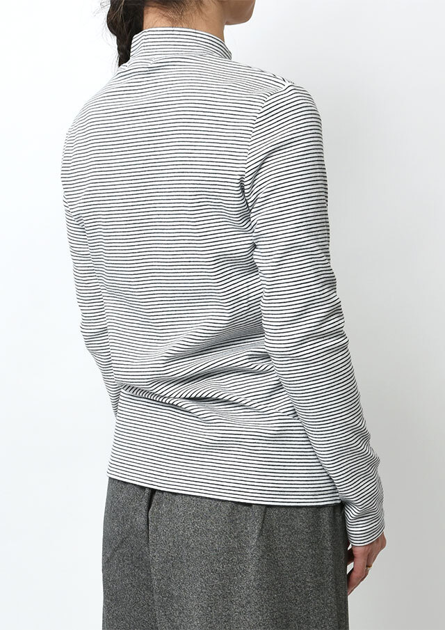 細ボーダーがアクセントになったハイネックカットソー。ポリウレタンが編み込まれたストレッチ性のあるベア天竺素材で、身体にやさしくフィットします。ロングシーズン着られる素材感なので、デイリーに気軽に取り入れられる、持っておくと頼れるベーシックトップスです◎