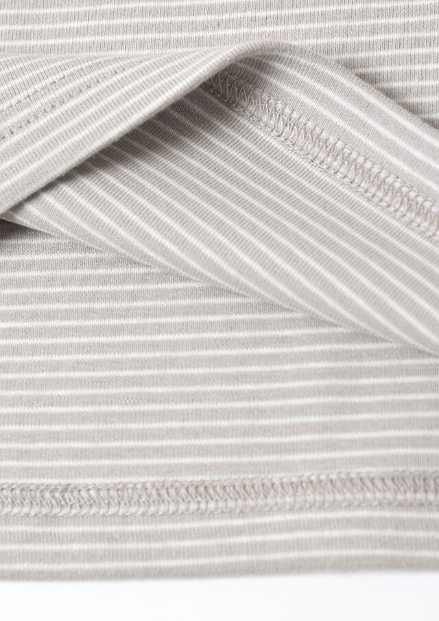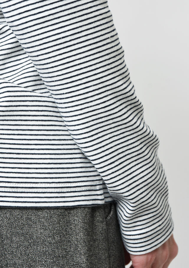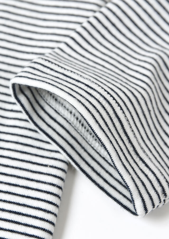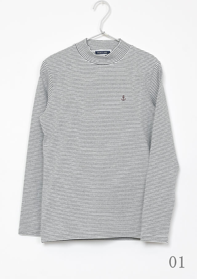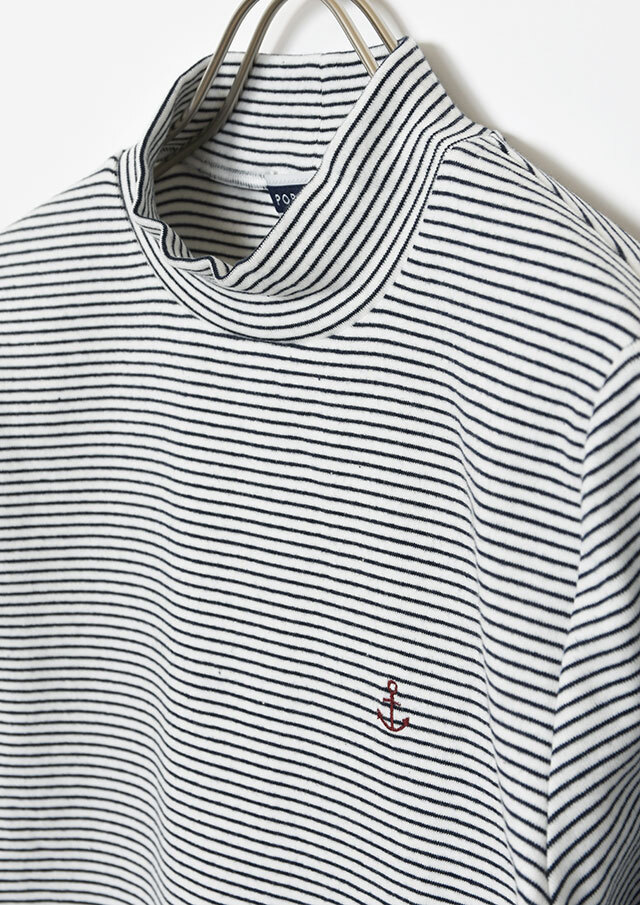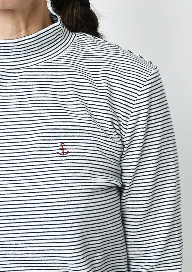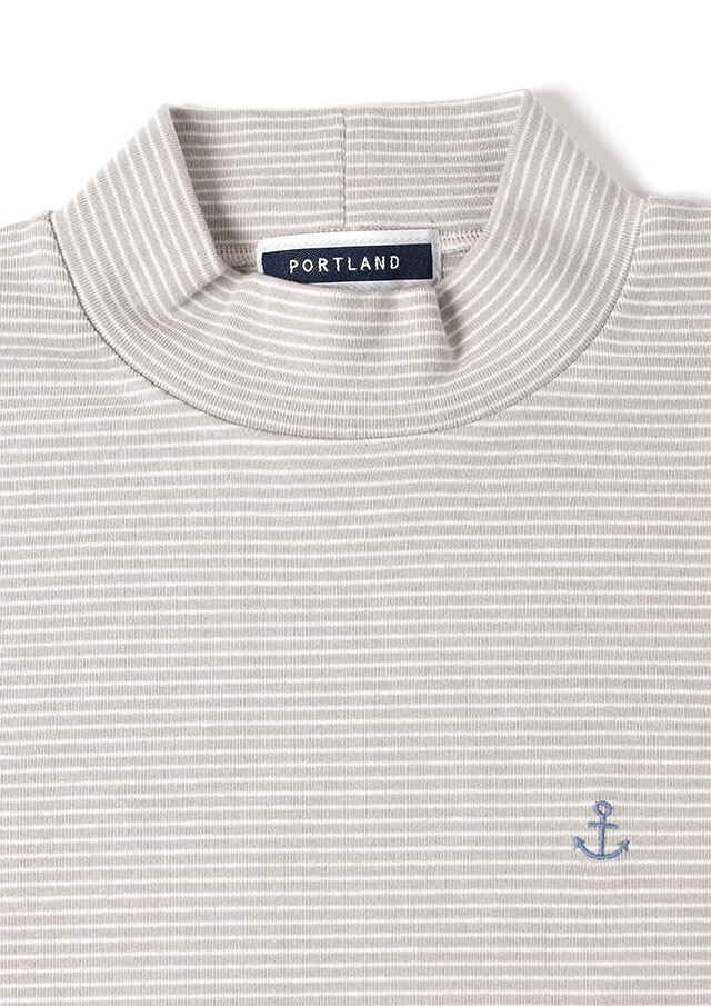 細ボーダーがアクセントになったハイネックカットソー。ポリウレタンが編み込まれたストレッチ性のあるベア天竺素材で、身体にやさしくフィットします。ロングシーズン着られる素材感なので、デイリーに気軽に取り入れられる、持っておくと頼れるベーシックトップスです◎