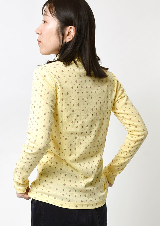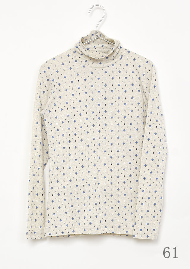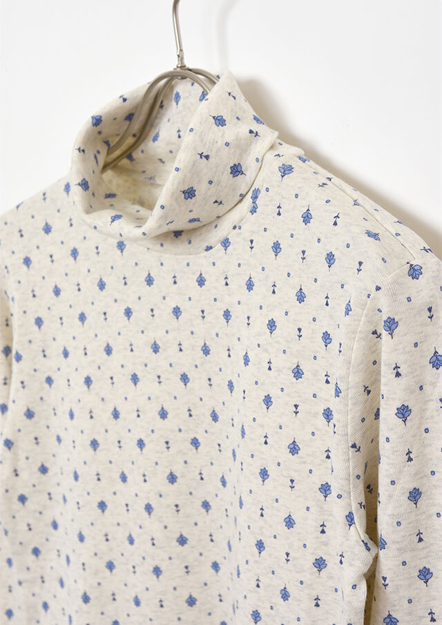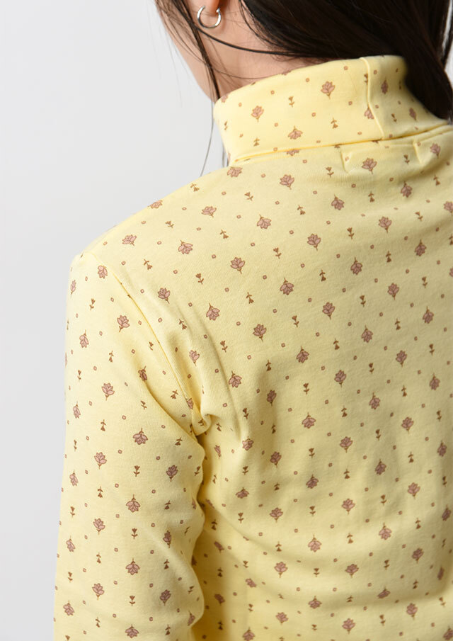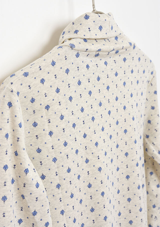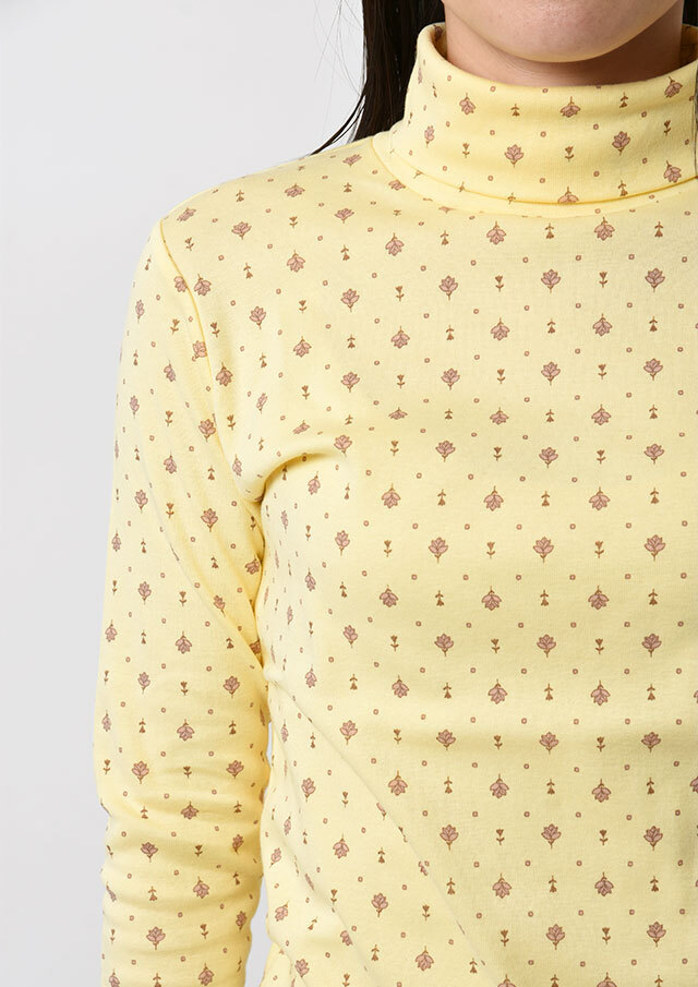 綿100%のフライス生地を使用した小紋柄のタートルネックカットソー。伸縮性があり柔らかいので、長時間の着用もストレスフリーな着心地。真冬はアウターが重く暗くなりがちですが、首元からのぞく小紋柄と明るいカラーでコーディネートに明るさをプラスできます。