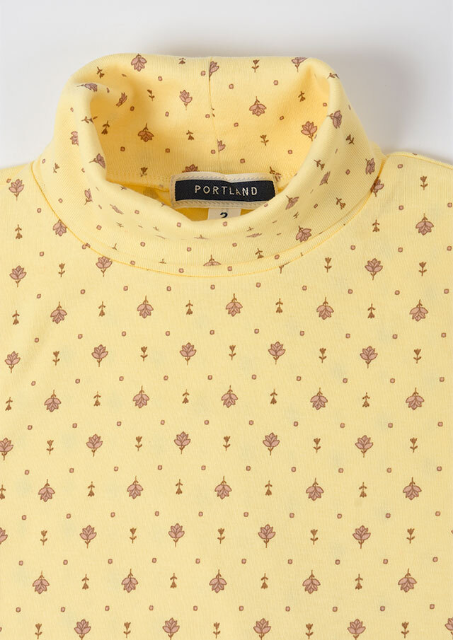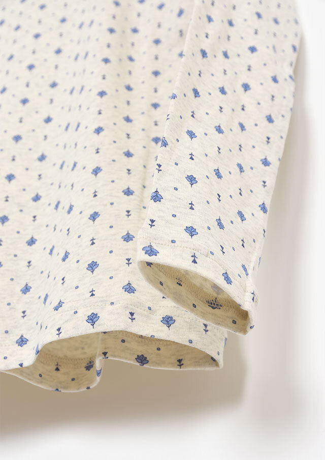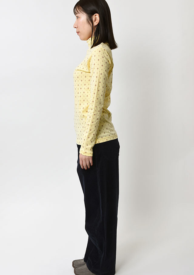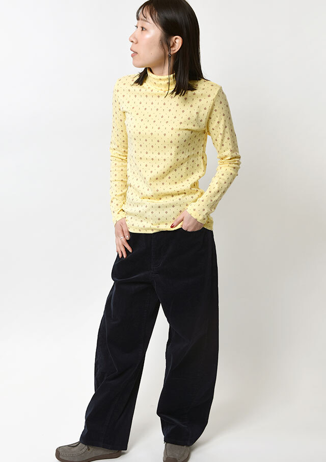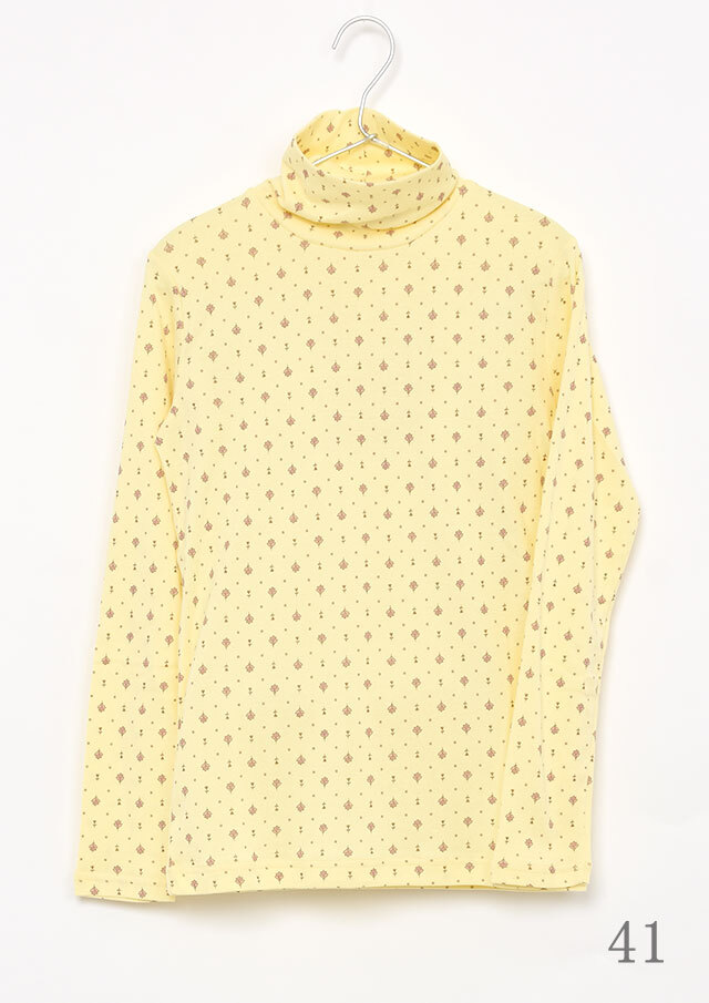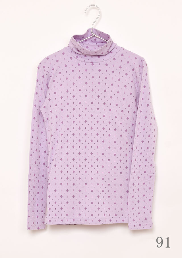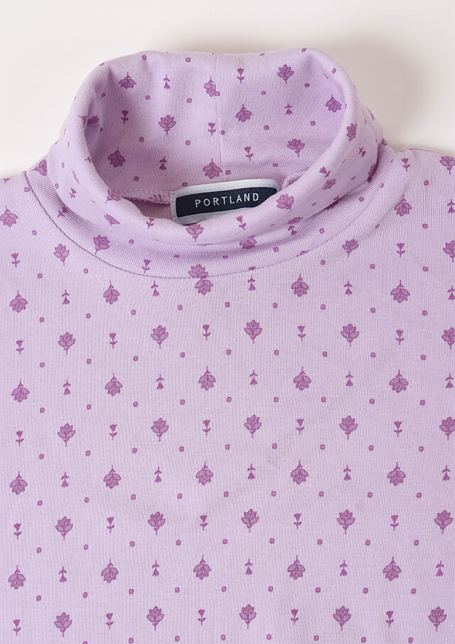 綿100%のフライス生地を使用した小紋柄のタートルネックカットソー。伸縮性があり柔らかいので、長時間の着用もストレスフリーな着心地。真冬はアウターが重く暗くなりがちですが、首元からのぞく小紋柄と明るいカラーでコーディネートに明るさをプラスできます。