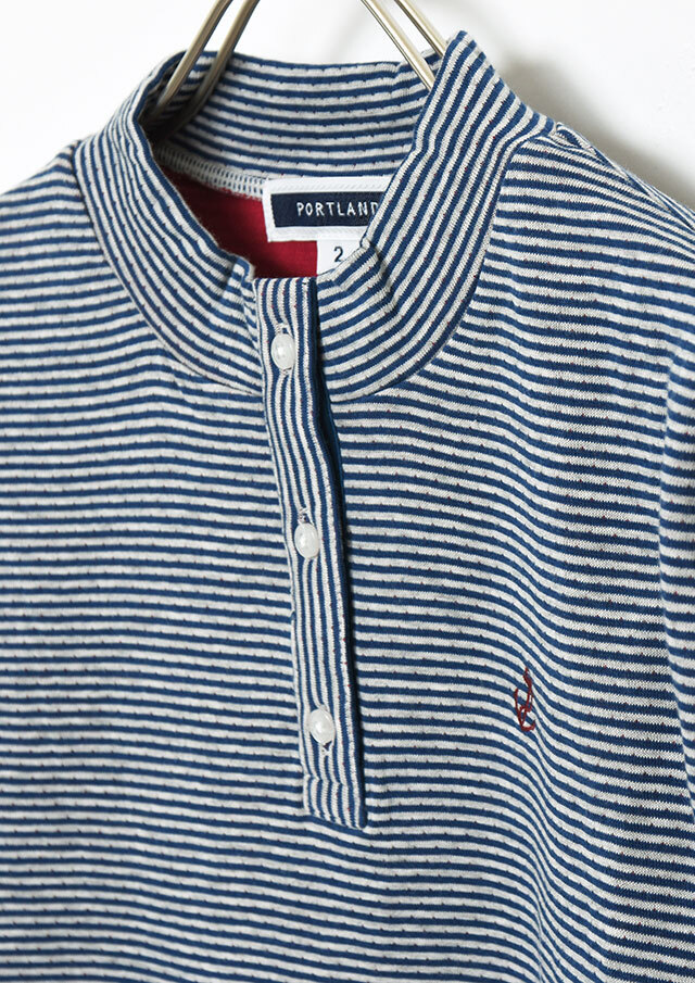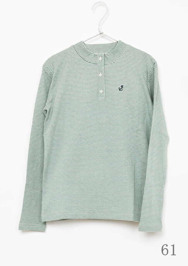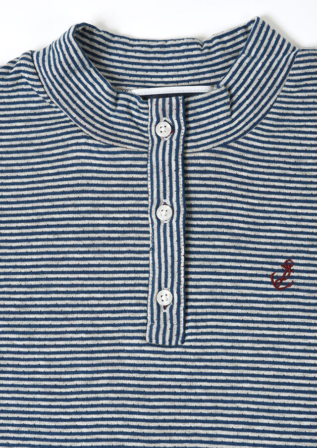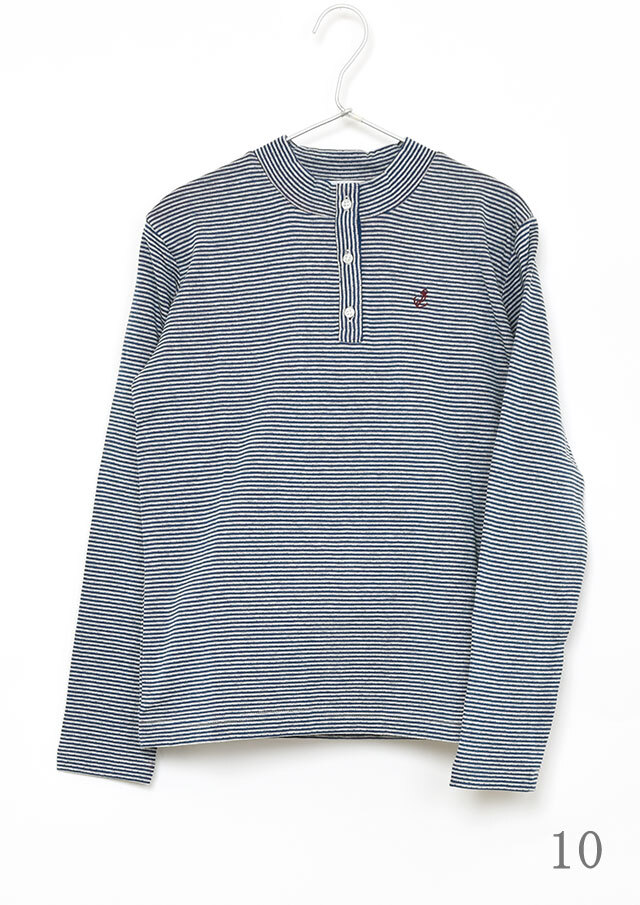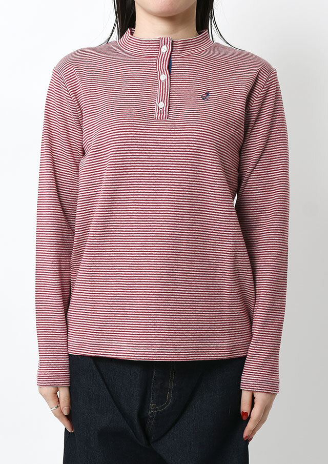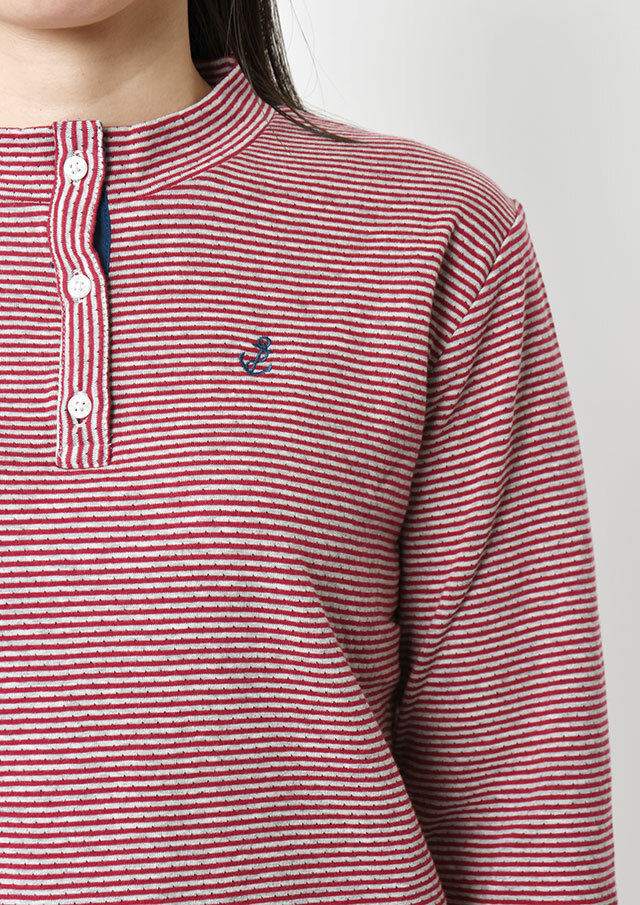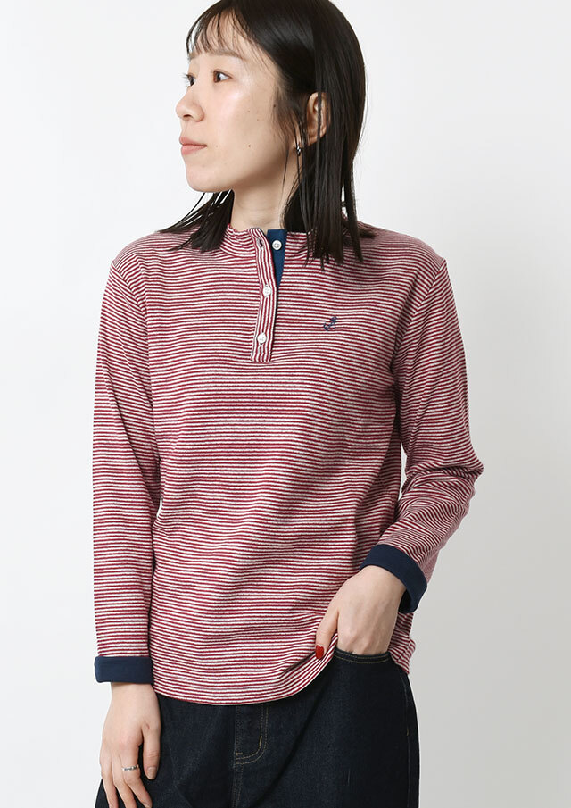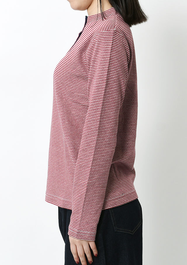 ヘンリーネック風のデザインがアクセントになった接結ボーダーカットソー。ボタンの裏面には無地の別布を使用しており、ボタンを開けて着たときにさりげなく見えるのがポイント。綿100%の接結素材の優しい肌触りも魅力的な毎日使えるボーダートップスです。