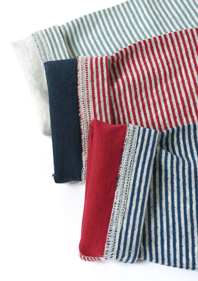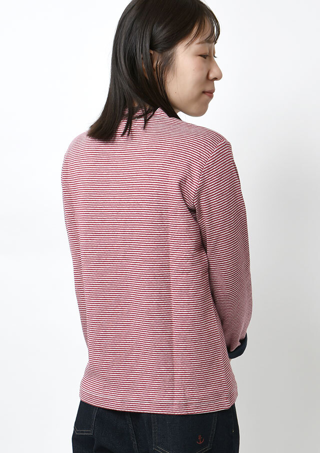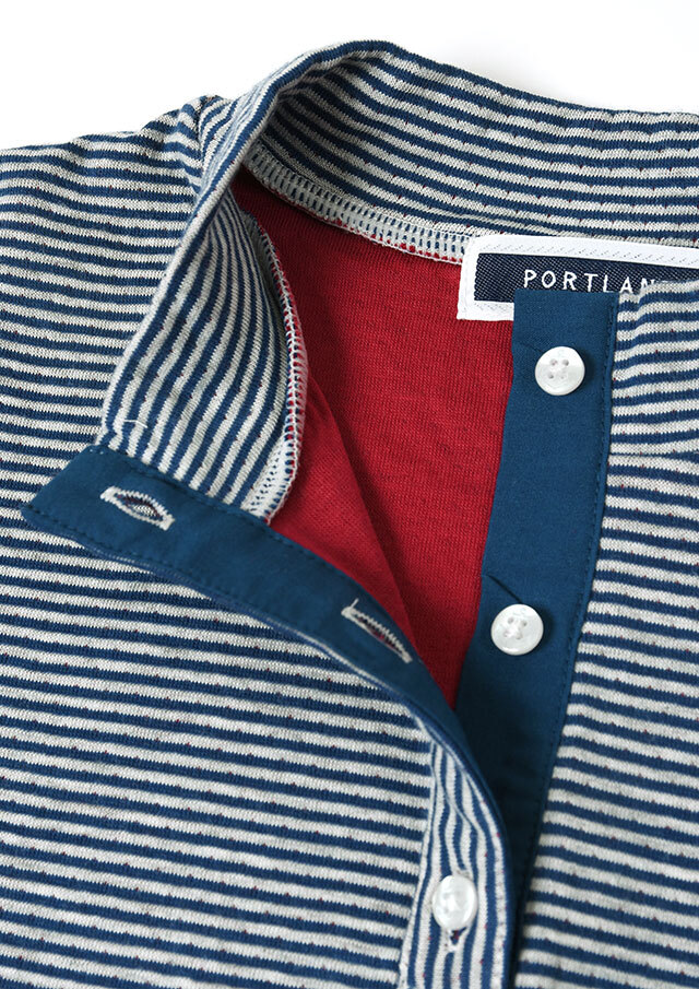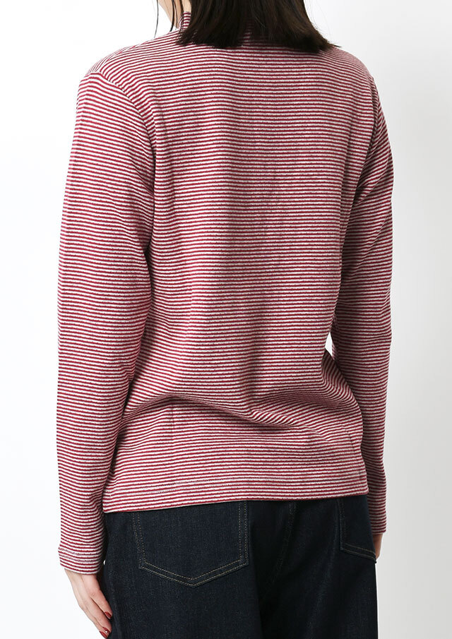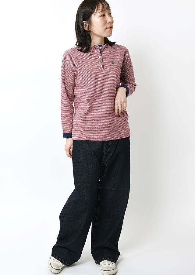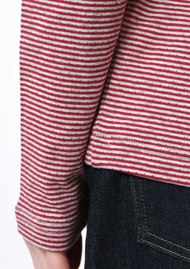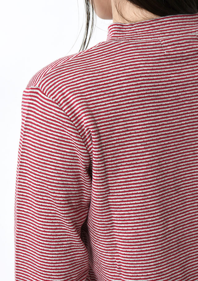 ヘンリーネック風のデザインがアクセントになった接結ボーダーカットソー。ボタンの裏面には無地の別布を使用しており、ボタンを開けて着たときにさりげなく見えるのがポイント。綿100%の接結素材の優しい肌触りも魅力的な毎日使えるボーダートップスです。