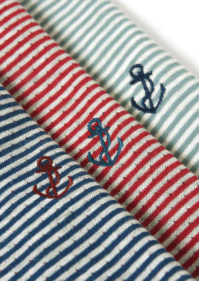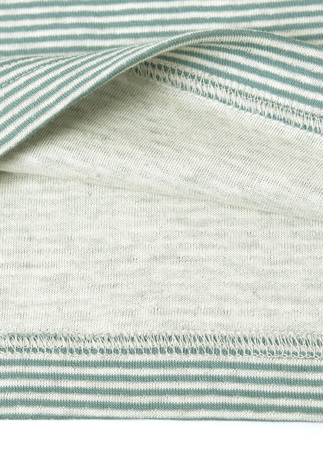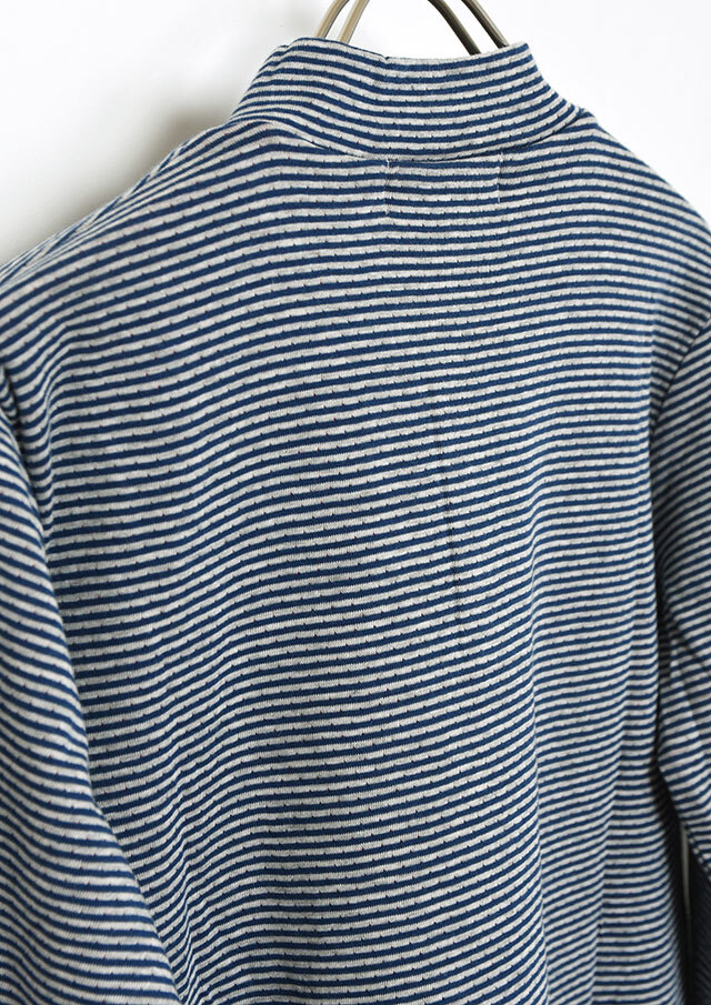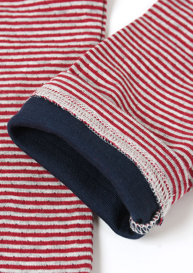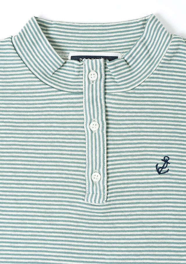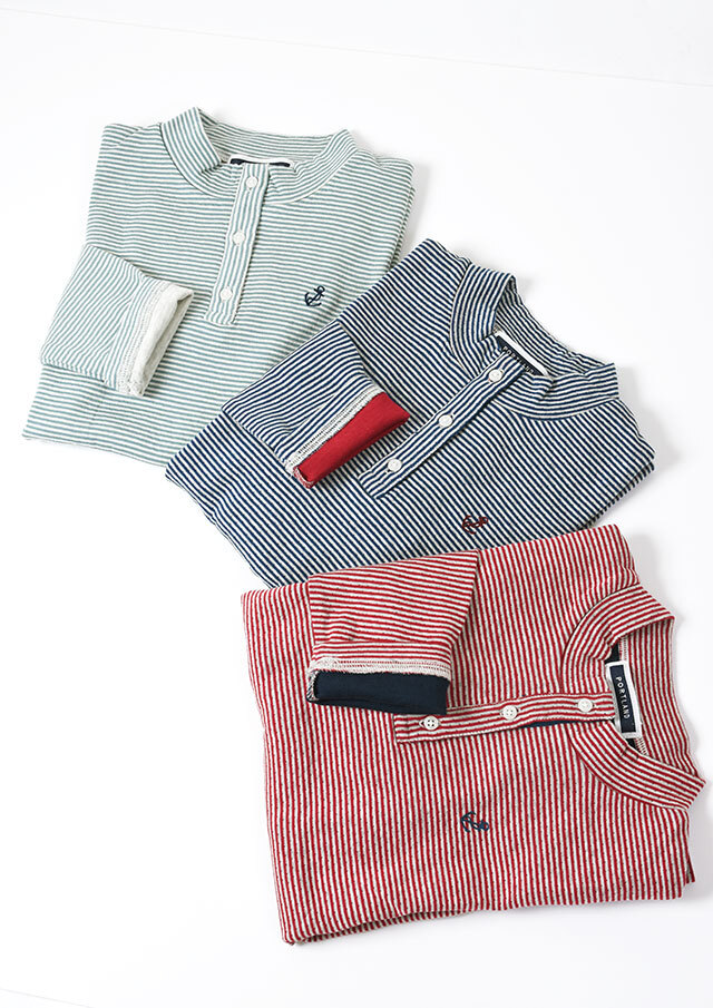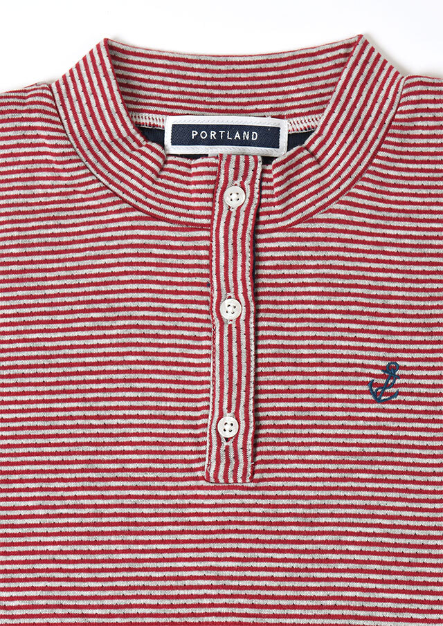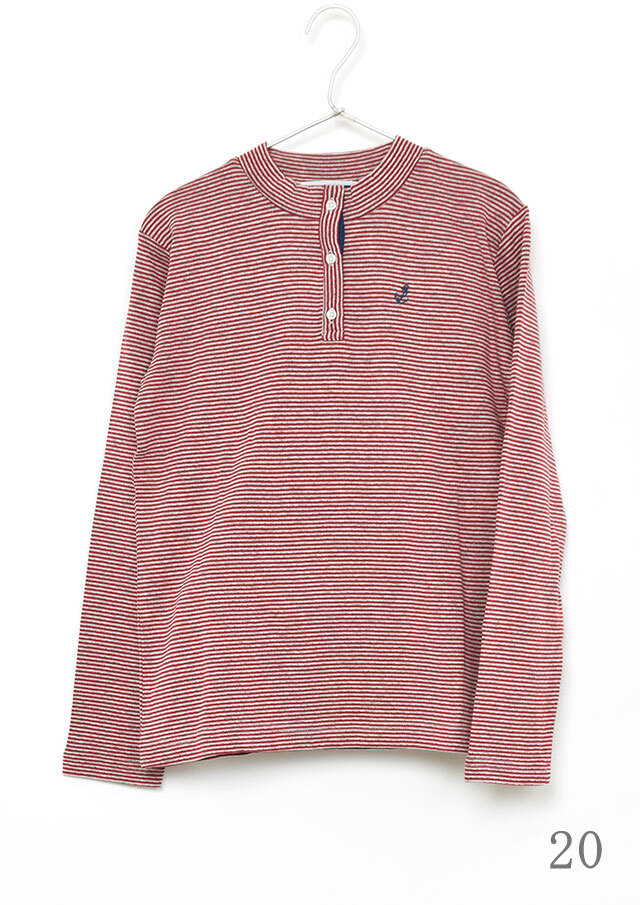 ヘンリーネック風のデザインがアクセントになった接結ボーダーカットソー。ボタンの裏面には無地の別布を使用しており、ボタンを開けて着たときにさりげなく見えるのがポイント。綿100%の接結素材の優しい肌触りも魅力的な毎日使えるボーダートップスです。