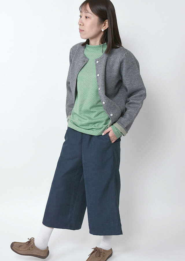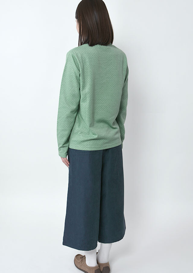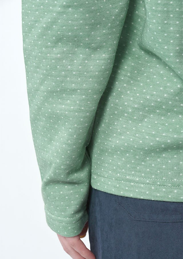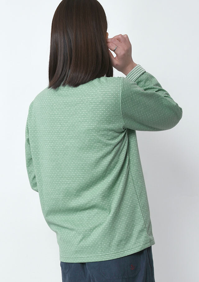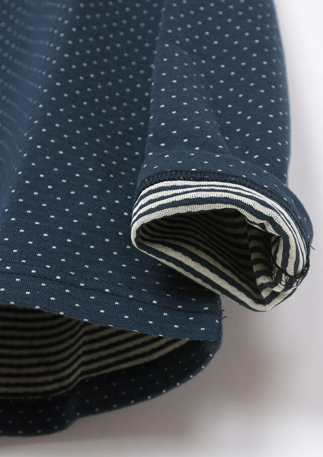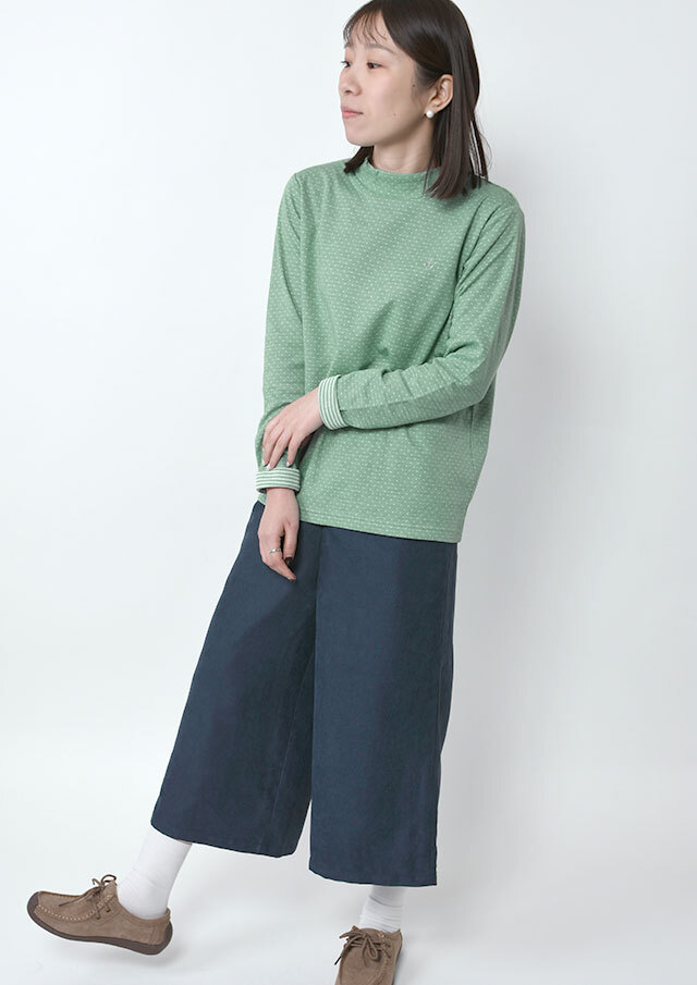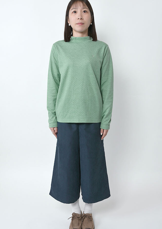 ドット柄が可愛いカットソーはポリエステルと綿を混紡した接結素材の1着。ほどよくフィットする着心地と短めのネックで首が詰まりすぎずスッキリと着れるハイネックデザインです。柔らかで2重組織の温かみのある風合いとメランジ風のカラーが優しい印象です。