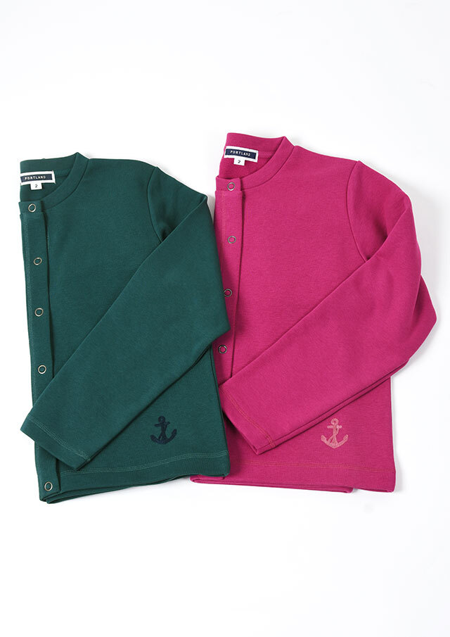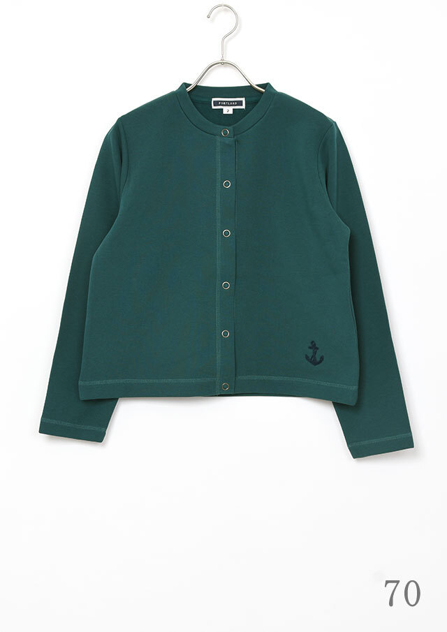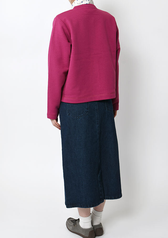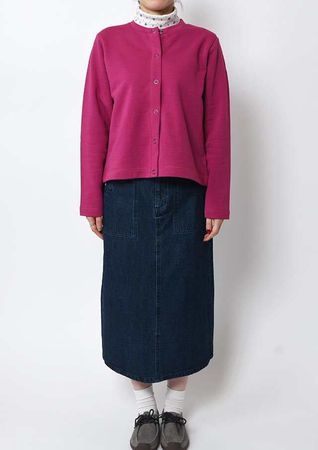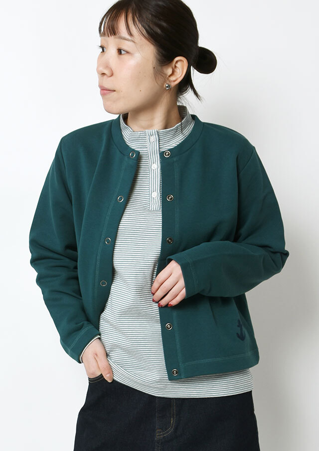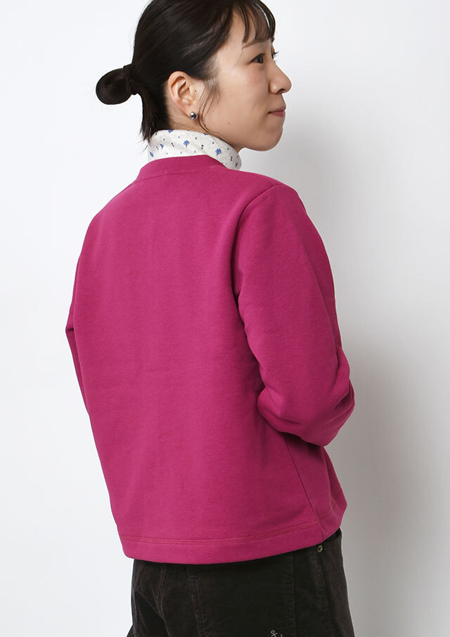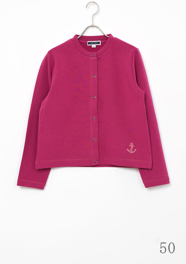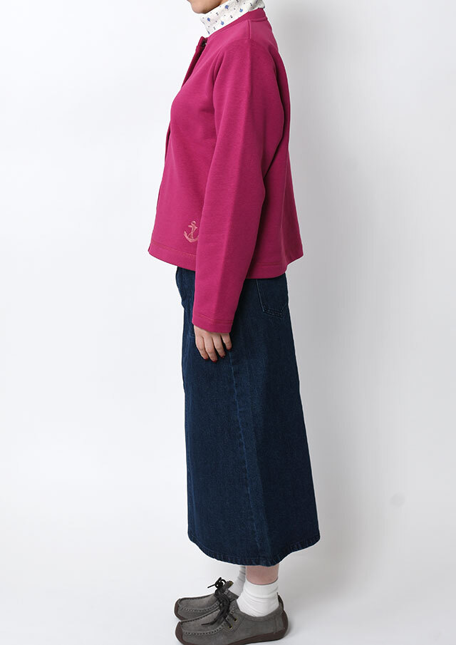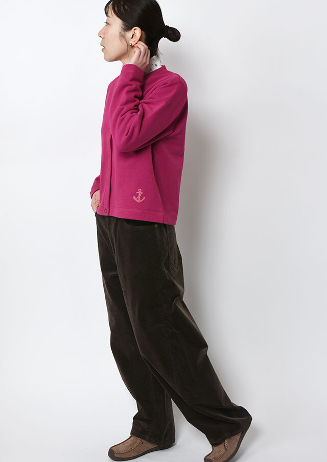 裏起毛素材のあたたかな着心地が魅力のスナップカーディガン。すっきりとしたショート丈でスカートやボリュームのあるボトムとも好相性。季節の気分を高めるビビッドなマゼンタ系と、落ち着きのあるグリーン系の2色をご用意しました。前身裾にはチェーンステッチで施した“イカリモチーフ”の刺繍を添えて、さりげないアクセントに。