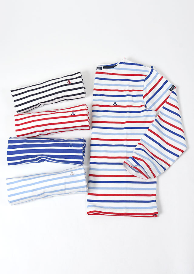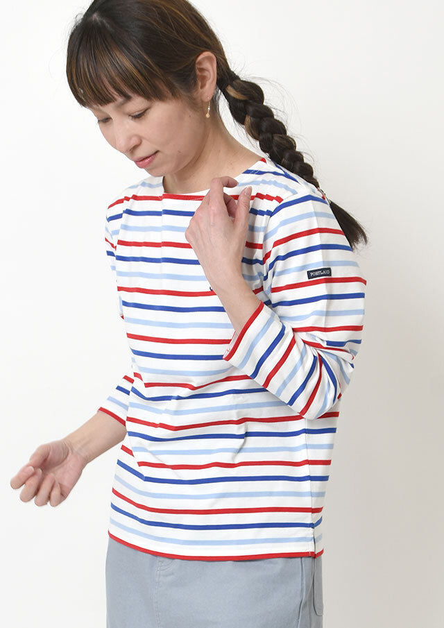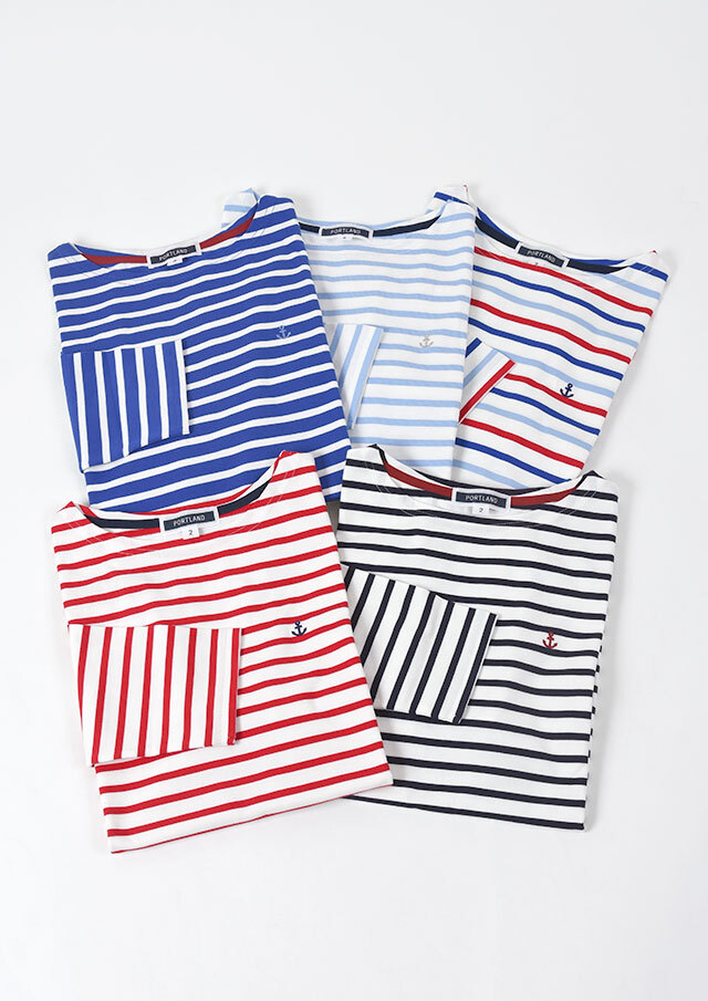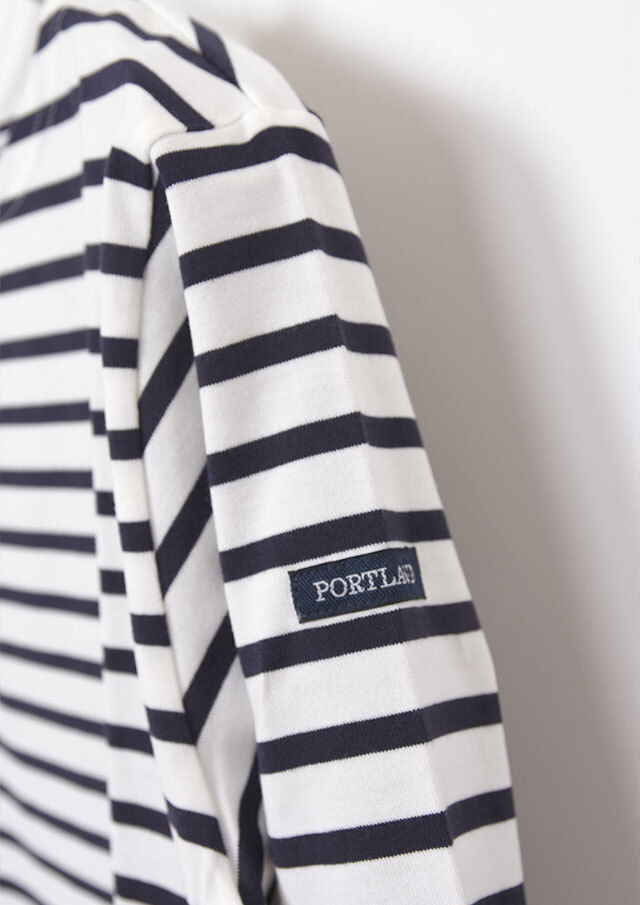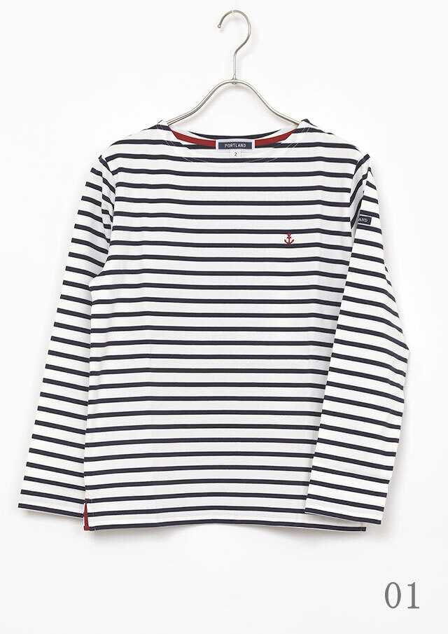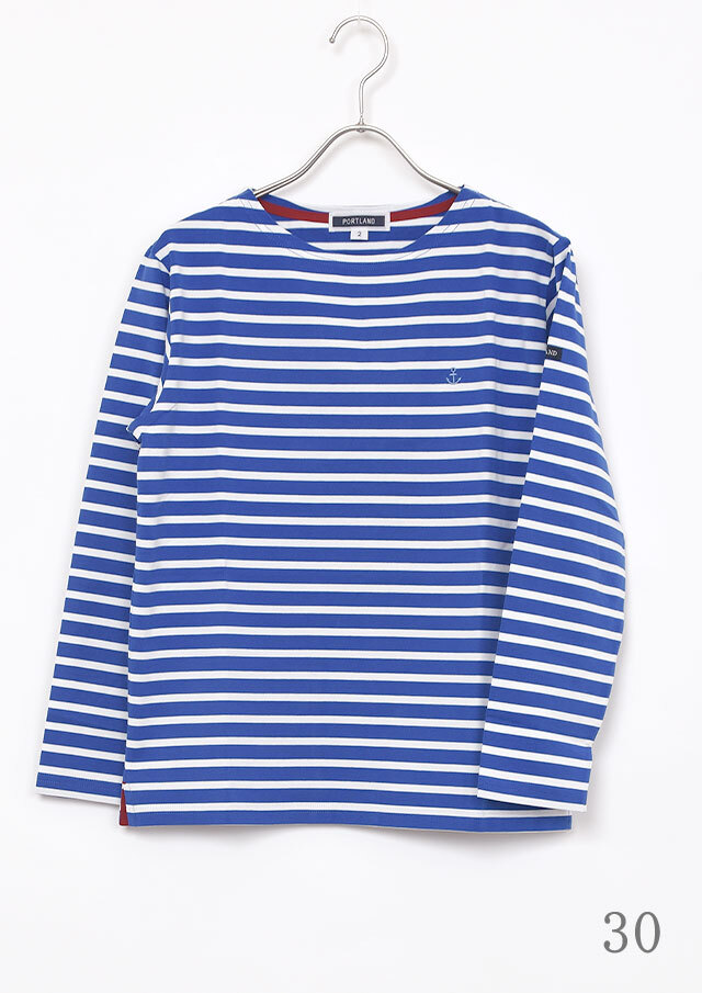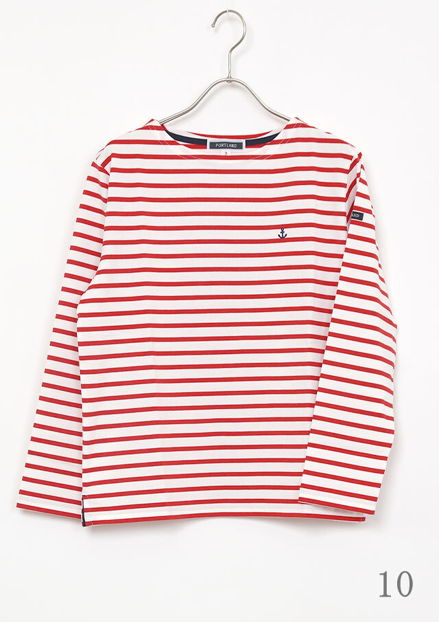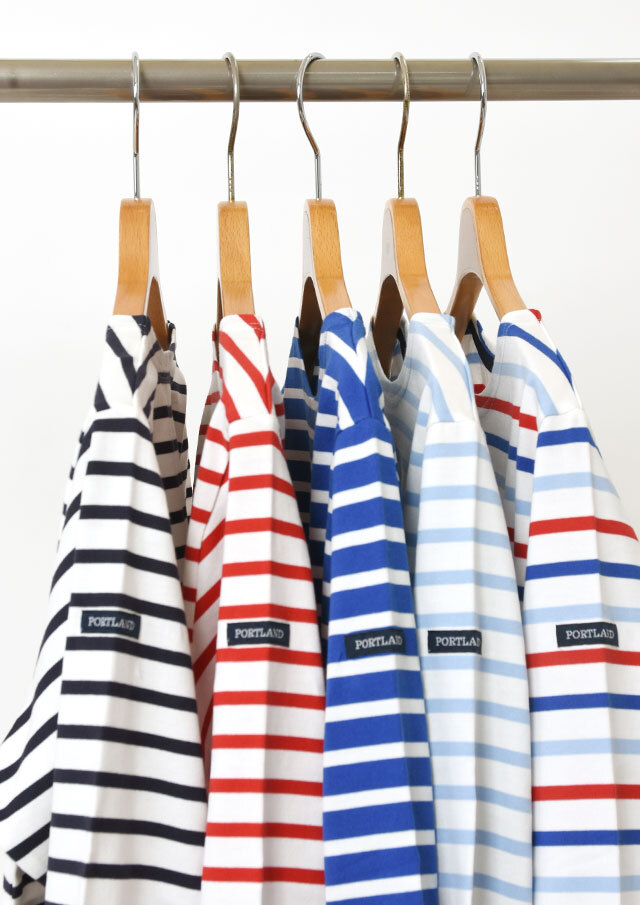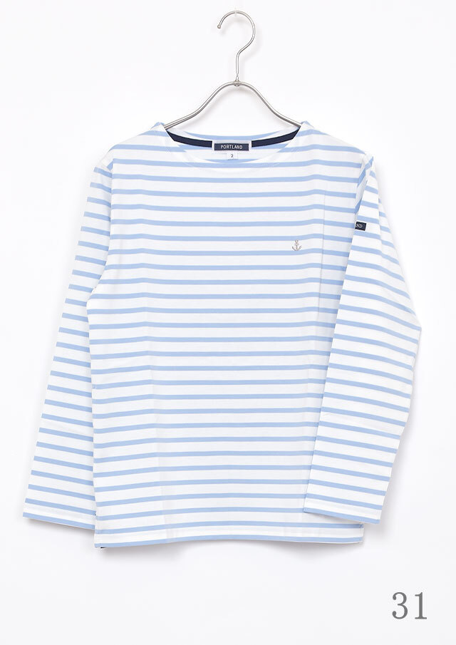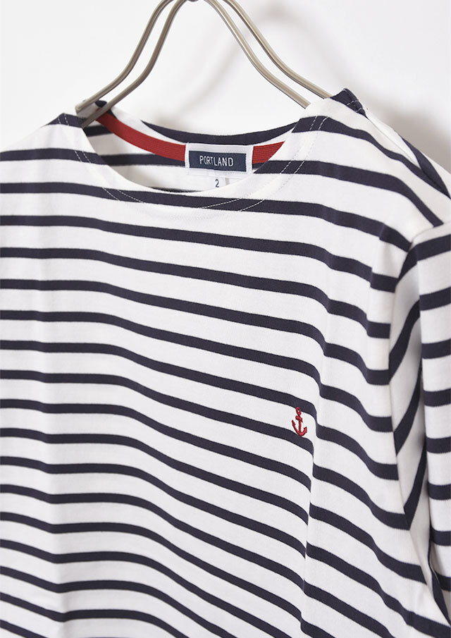 ポートランド定番アイテムのボーダーカットソー。綿100%の40/2天竺素材を使用。重ね着しやすい九分袖デザインで、季節の変わり目からロングシーズン活躍。今季はマリンテイストを感じる爽やかなカラー展開で、コーディネートの主役にもアクセントにもなるアイテムです。左胸にはおなじみのイカリ刺繍と、袖に付いたネームタグもポイントです。