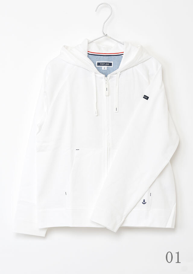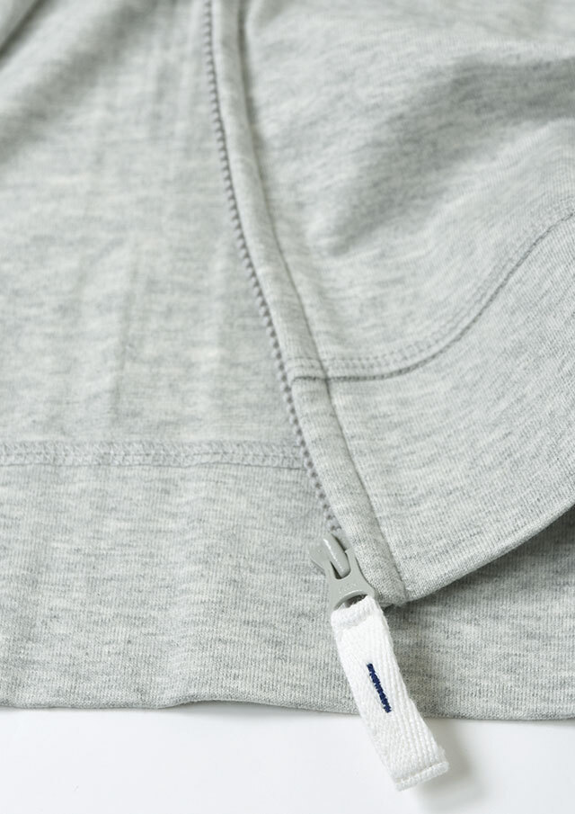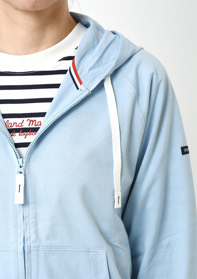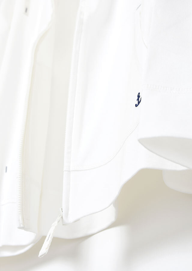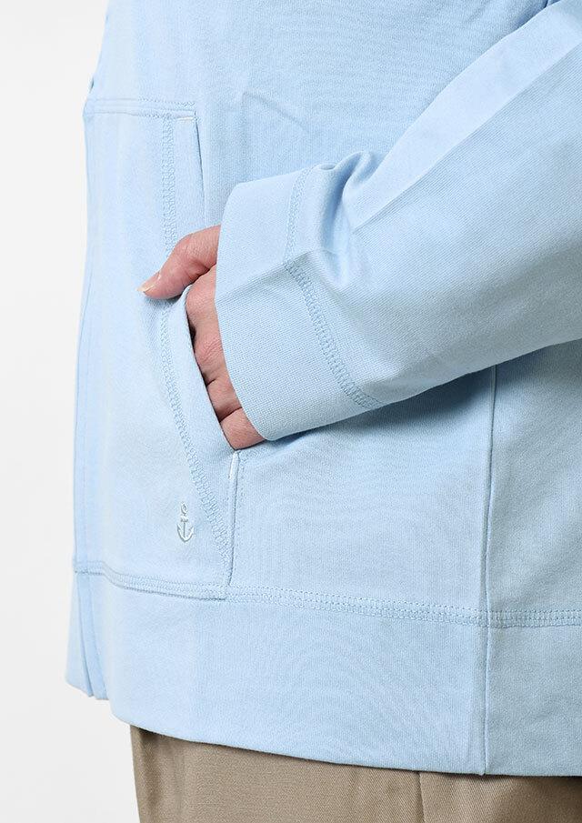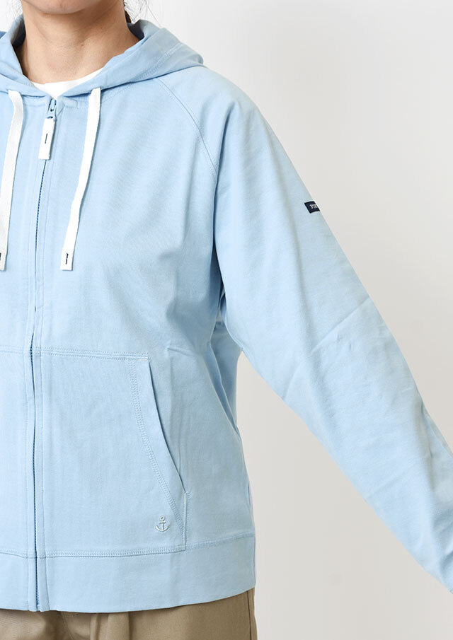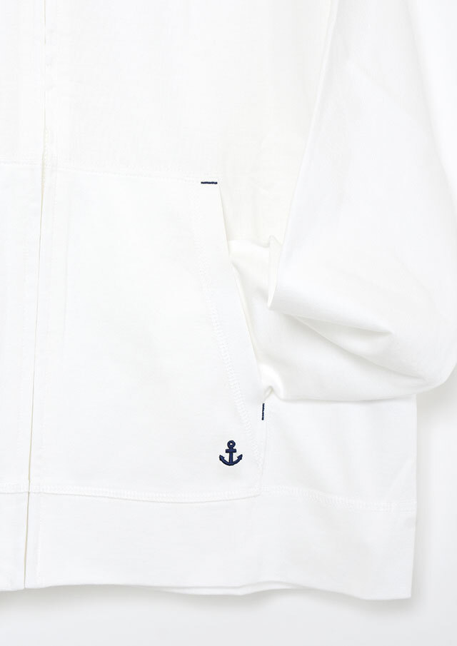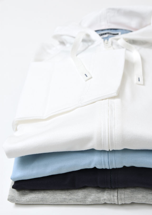 綿100%・40/2天竺素材を使用した、スタンダードなZIPフーディー。やわらかな風合いで、季節を問わず着回しやすいベーシックアイテム。シンプルなデザインの中に、襟ぐり裏のトリコロールテープ、左袖のネームや左ポケットのイカリ刺繍がさりげないアクセントに。カジュアルスタイルに欠かせない、ワードローブの定番としておすすめの一枚です◎
