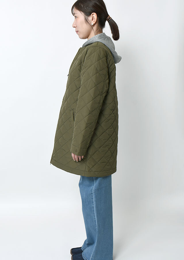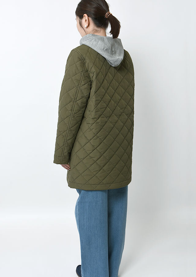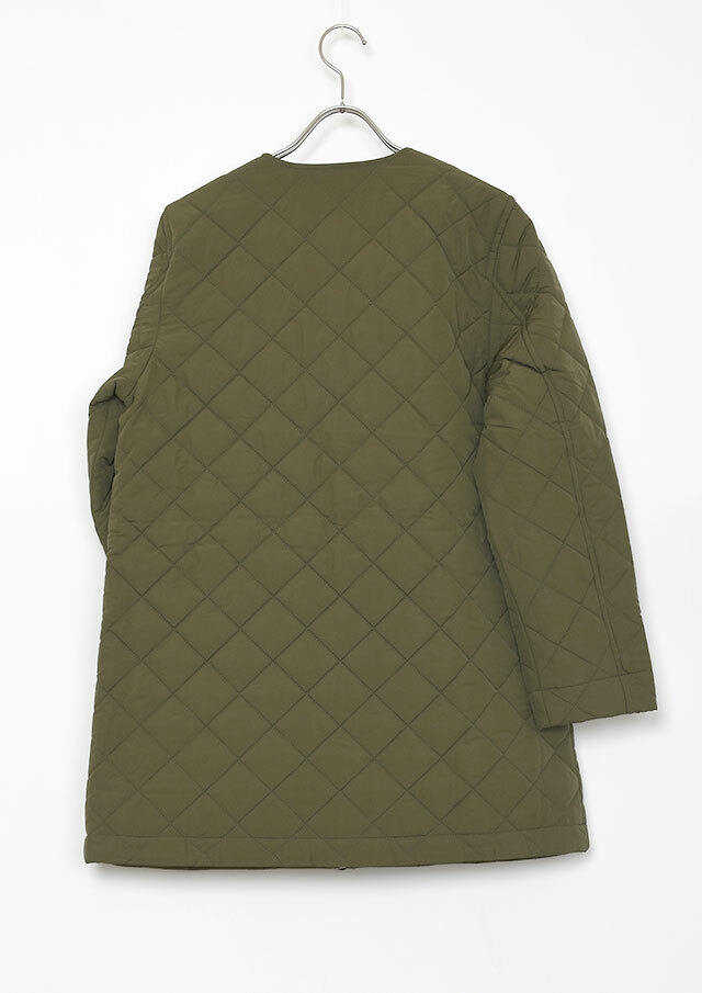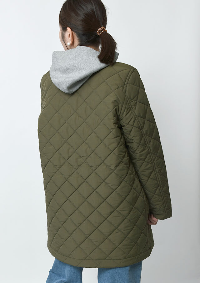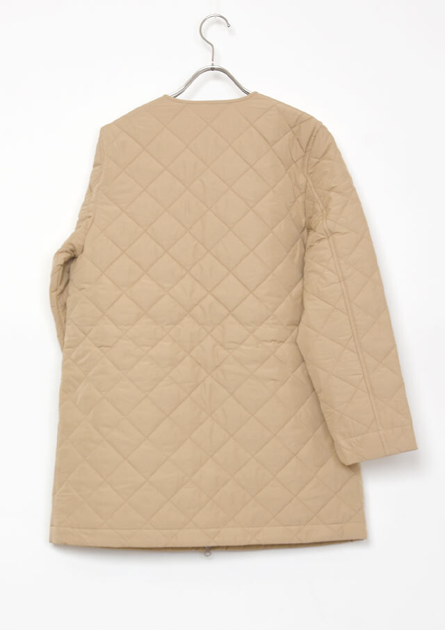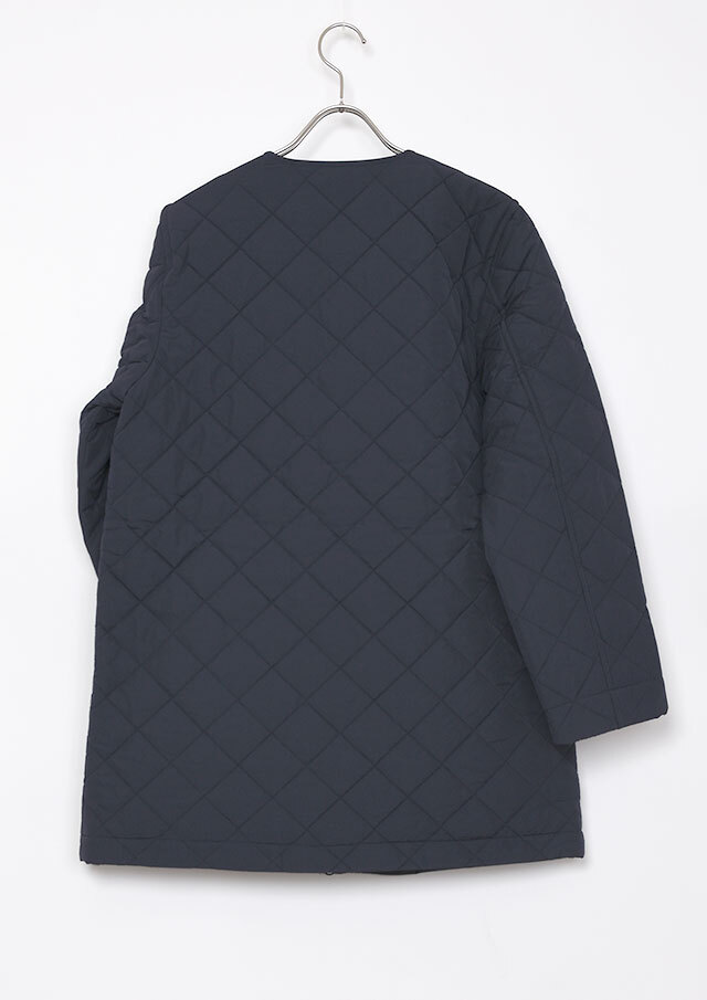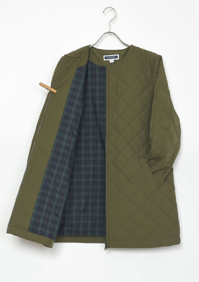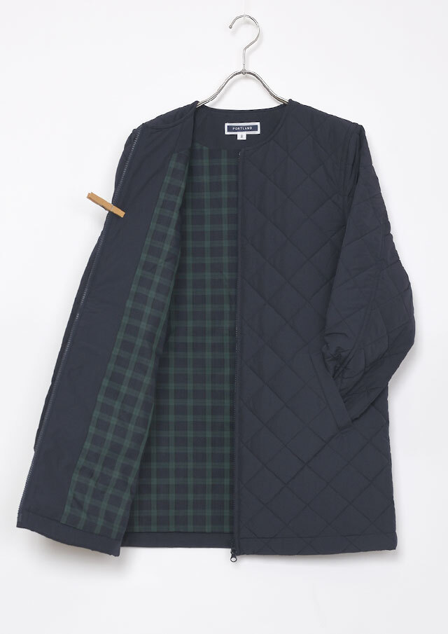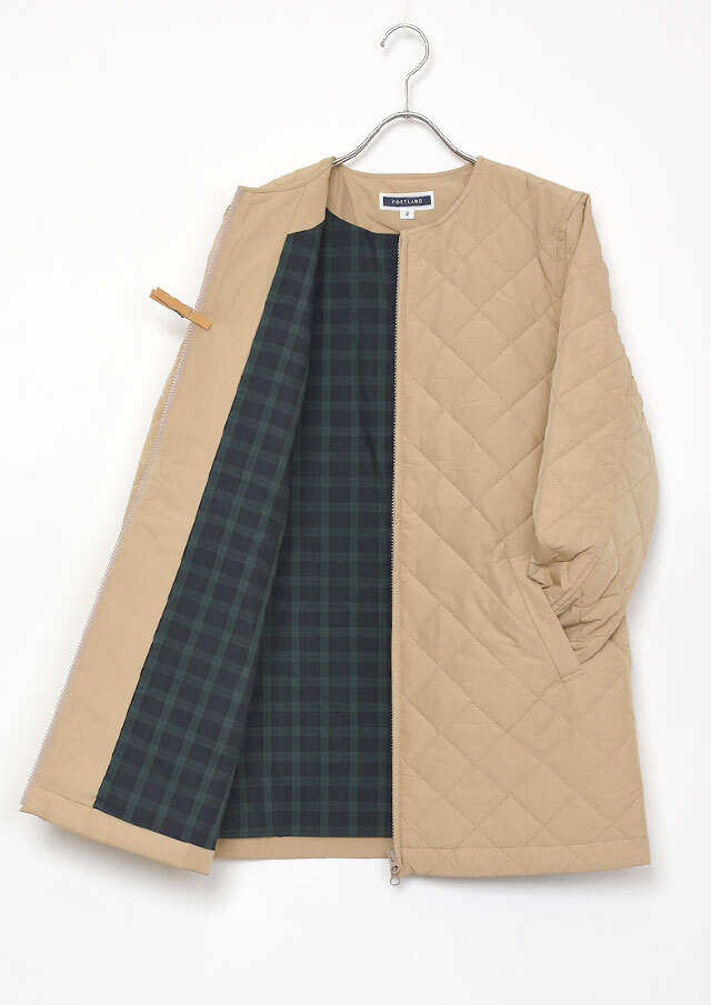 上品かつカジュアルな中綿スクエアキルトのノーカラーコート。軽やかで暖かく、普段使いからお出かけまで幅広く活躍します◎顔まわりがすっきり見えるノーカラーデザインは、フード付きのパーカーやタートルネックとのレイヤードにもぴったり。さっと羽織るだけで、こなれた印象に仕上がります。ブラックウォッチ柄の裏地もポイント。
