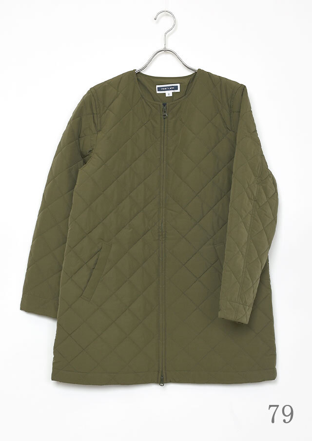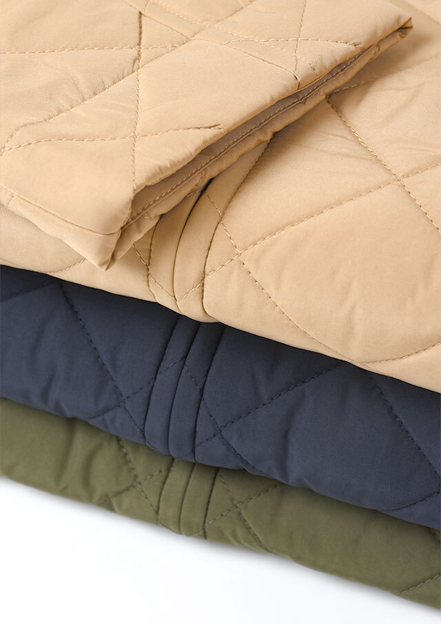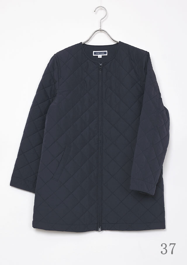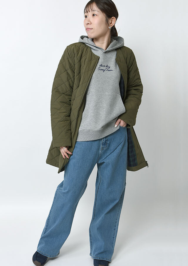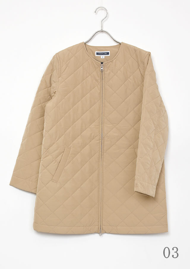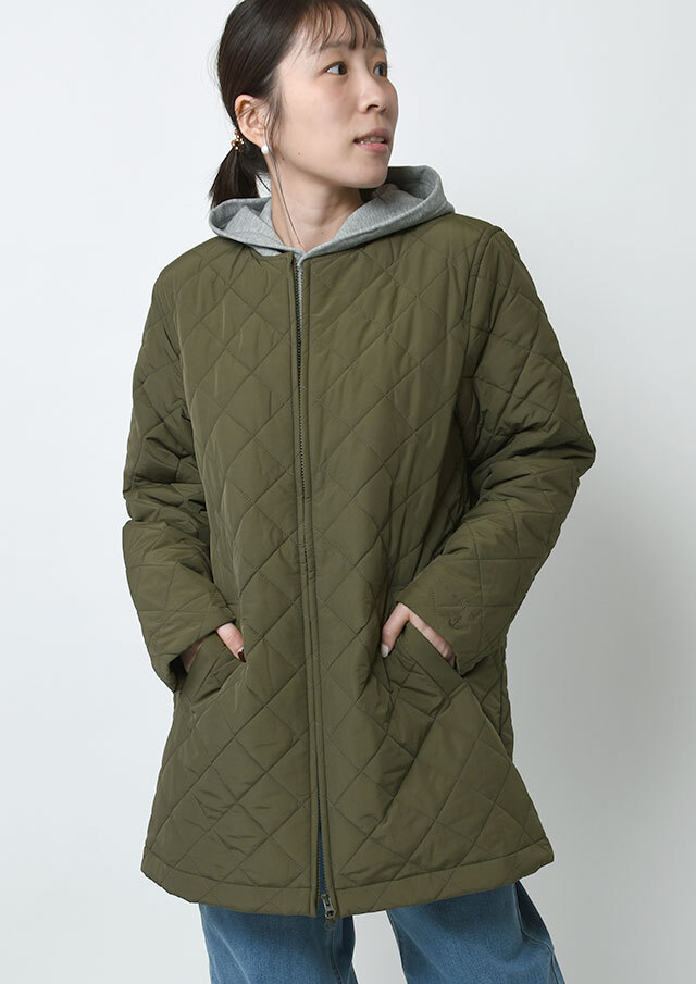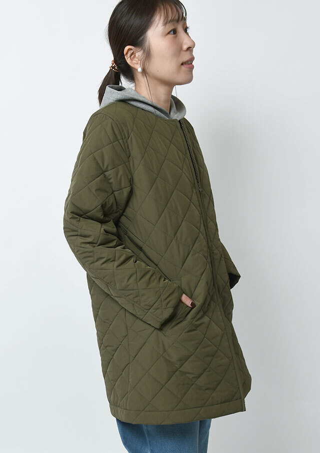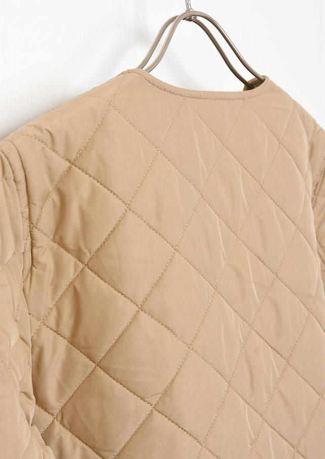 上品かつカジュアルな中綿スクエアキルトのノーカラーコート。軽やかで暖かく、普段使いからお出かけまで幅広く活躍します◎顔まわりがすっきり見えるノーカラーデザインは、フード付きのパーカーやタートルネックとのレイヤードにもぴったり。さっと羽織るだけで、こなれた印象に仕上がります。ブラックウォッチ柄の裏地もポイント。