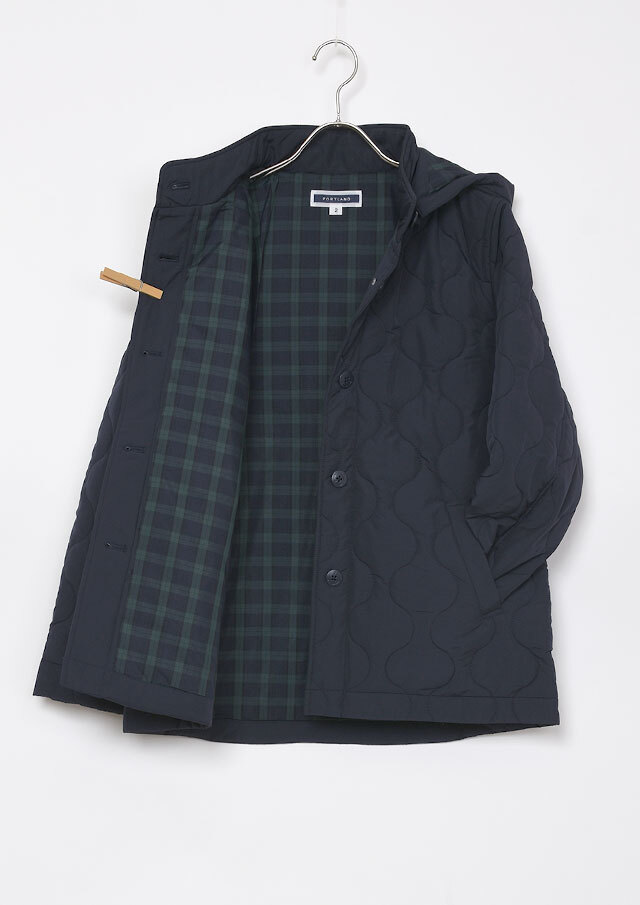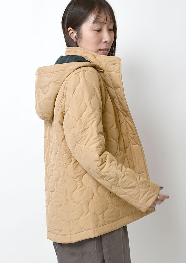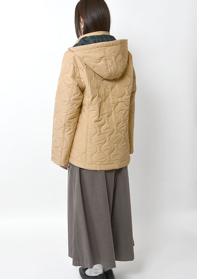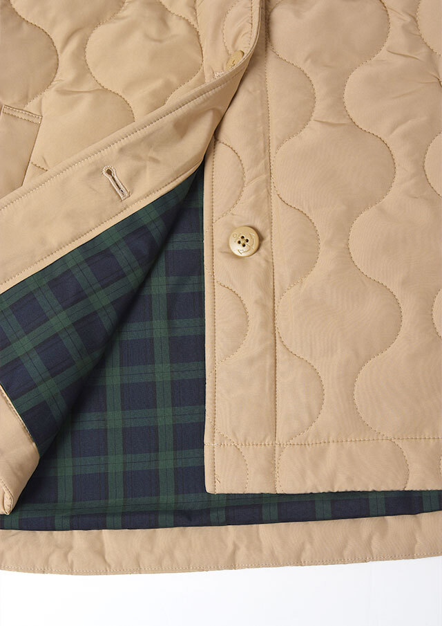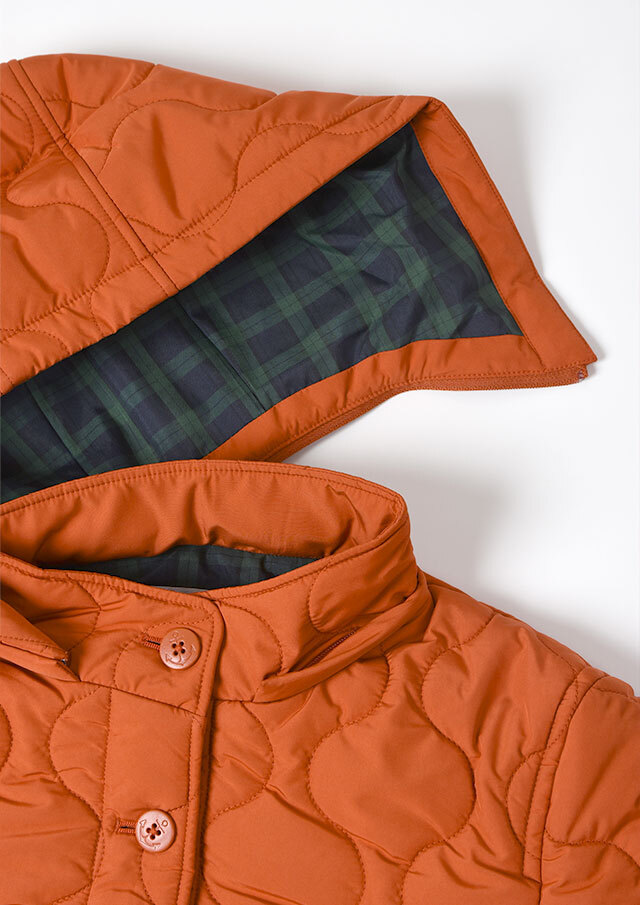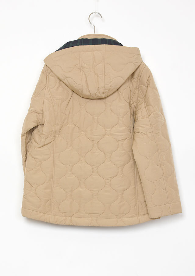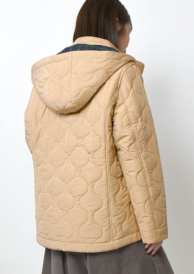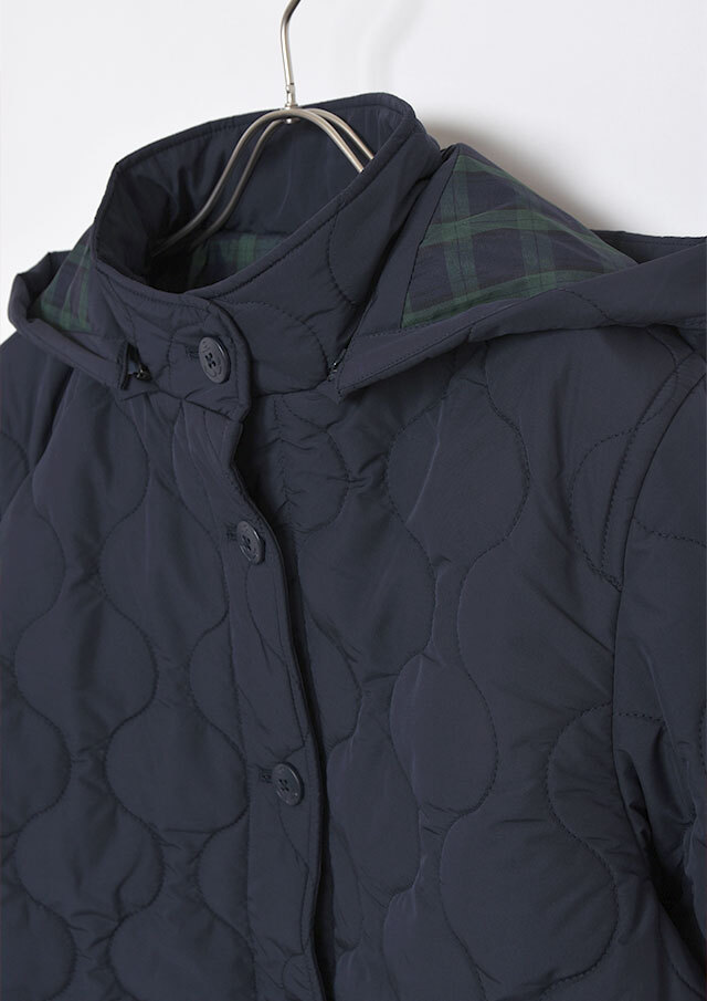 軽やかな着心地でしっかり暖かい、中綿ウェーブキルトのフード付きジャケット。中綿入りで防寒性も◎、裏地には上品なブラックウォッチ柄を採用し、脱いだときにもさりげないおしゃれを演出します。フードはファスナーで着脱可能。外せばスタンドカラーデザインで、シーンや気分に合わせて着こなしをアレンジできます。カジュアルからきれいめまで、幅広いスタイルに馴染む一着です。