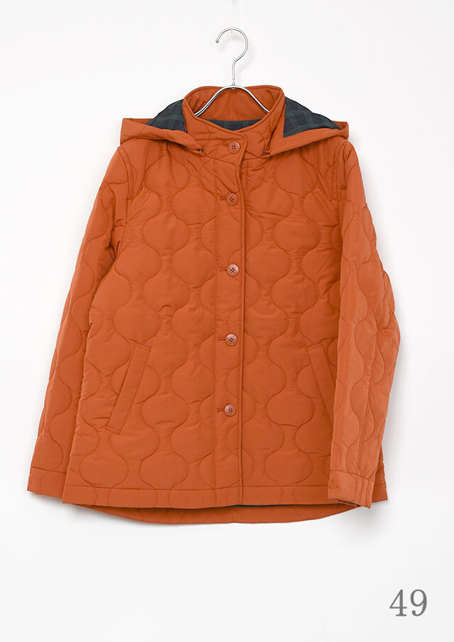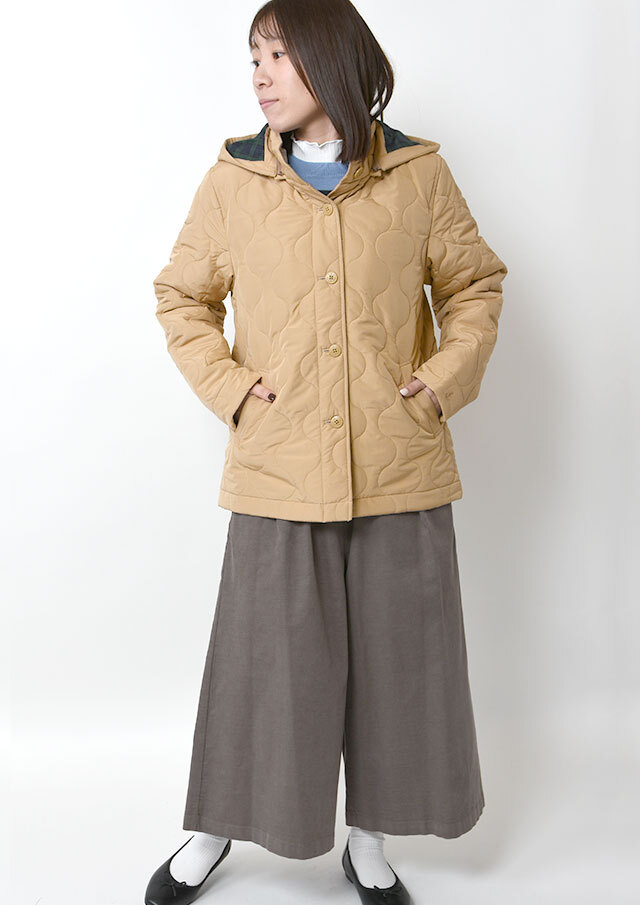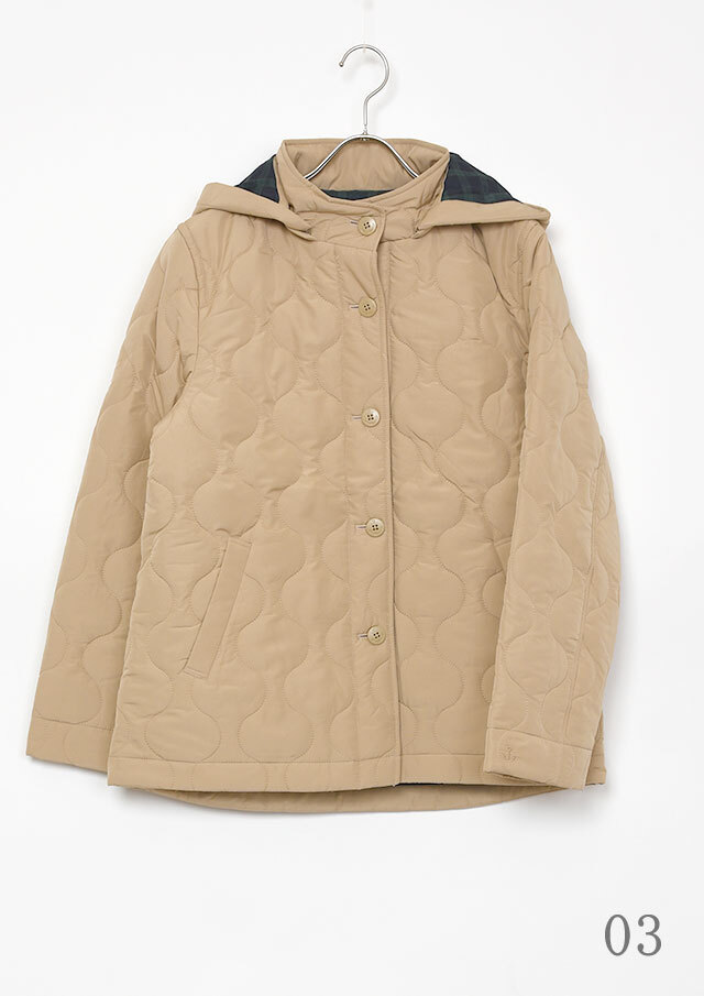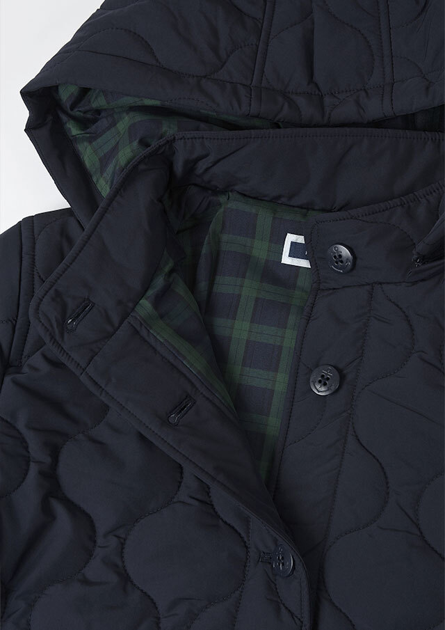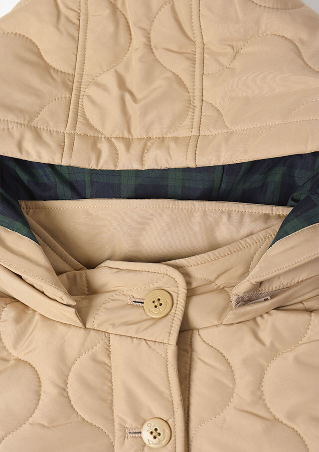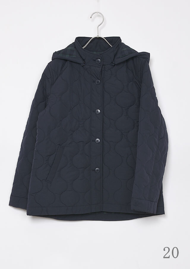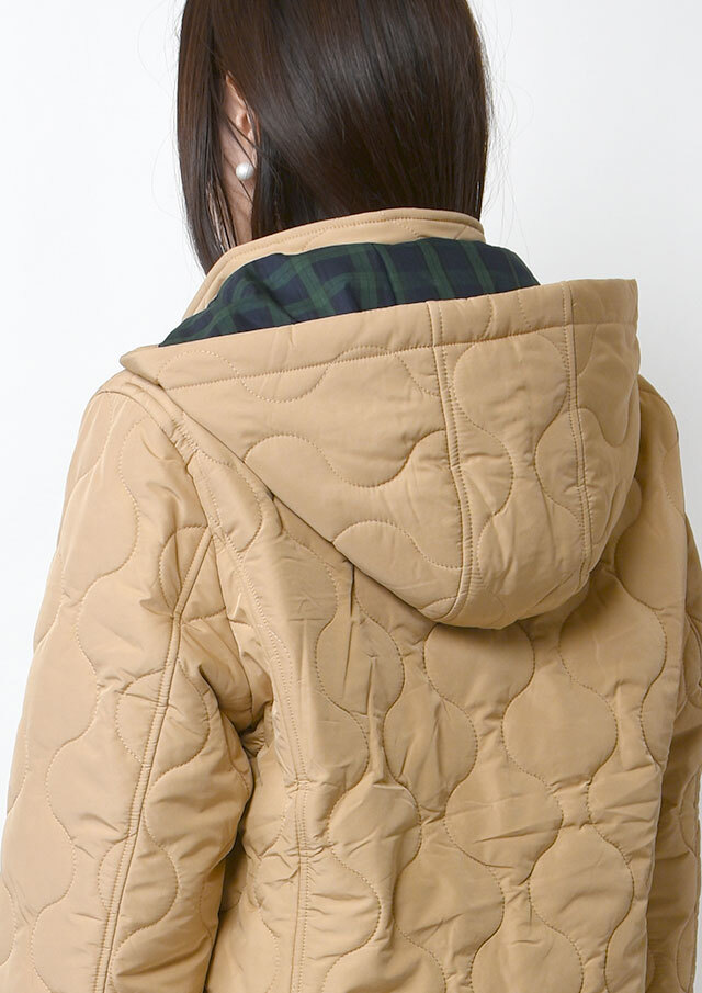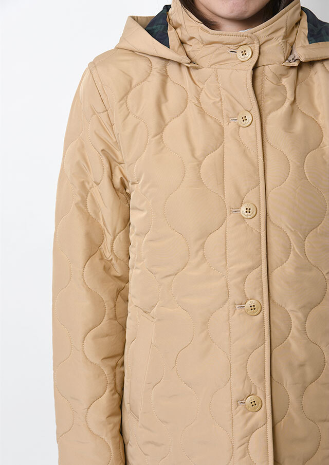 軽やかな着心地でしっかり暖かい、中綿ウェーブキルトのフード付きジャケット。中綿入りで防寒性も◎、裏地には上品なブラックウォッチ柄を採用し、脱いだときにもさりげないおしゃれを演出します。フードはファスナーで着脱可能。外せばスタンドカラーデザインで、シーンや気分に合わせて着こなしをアレンジできます。カジュアルからきれいめまで、幅広いスタイルに馴染む一着です。