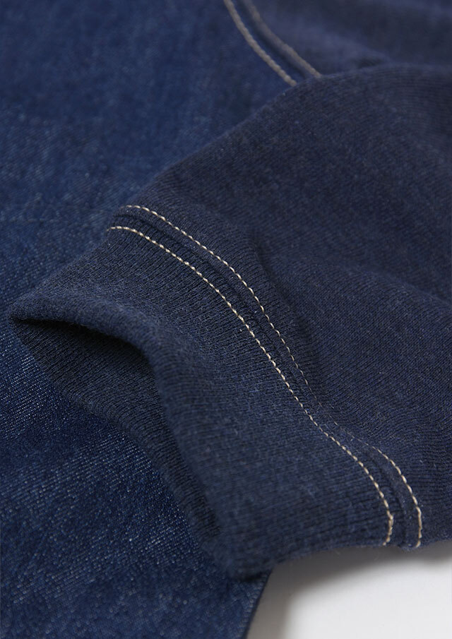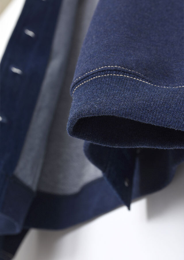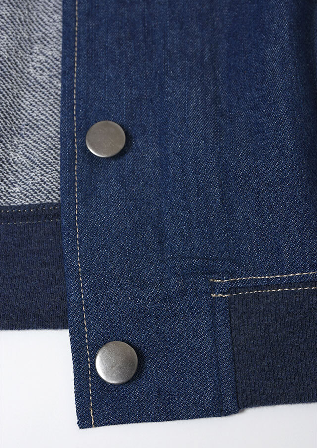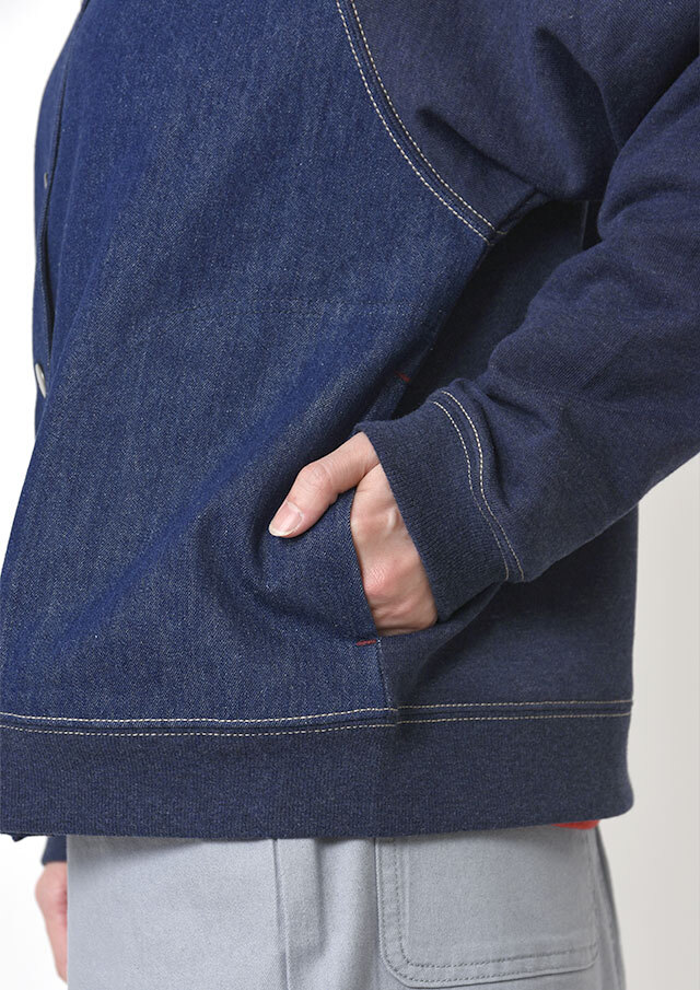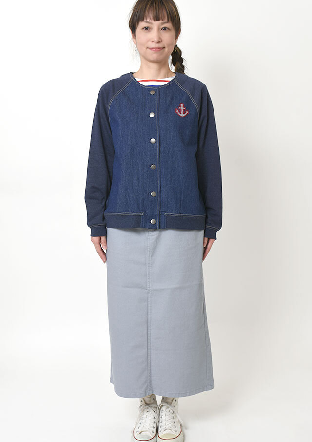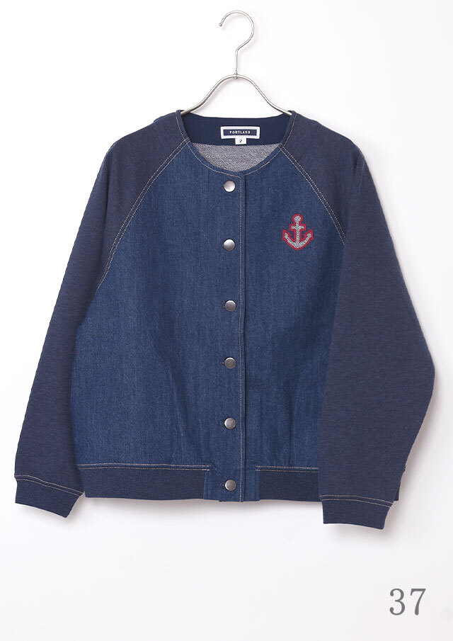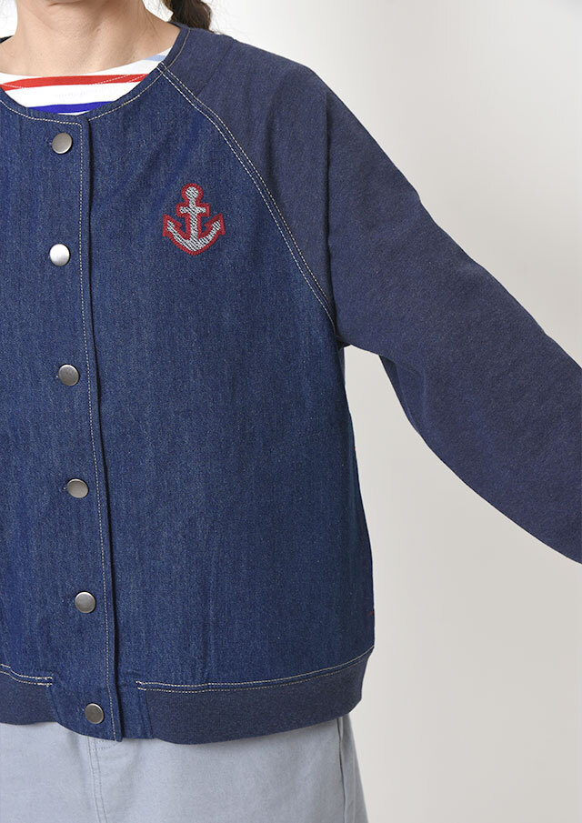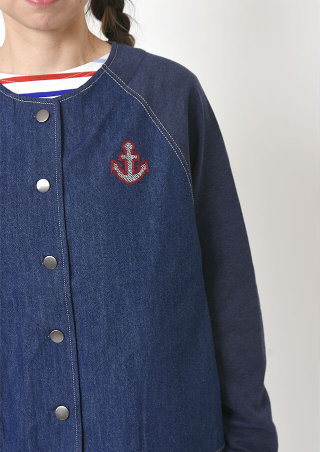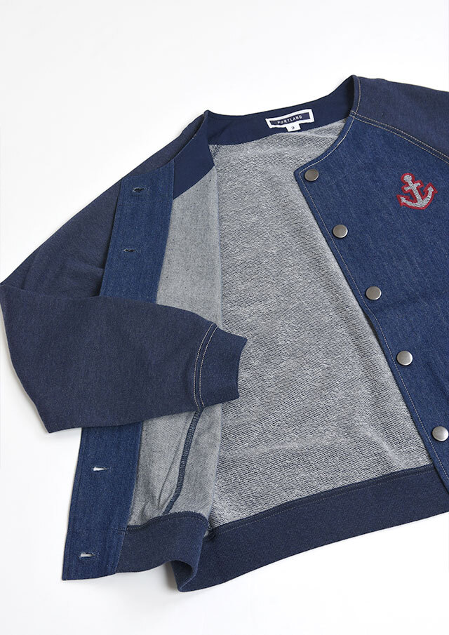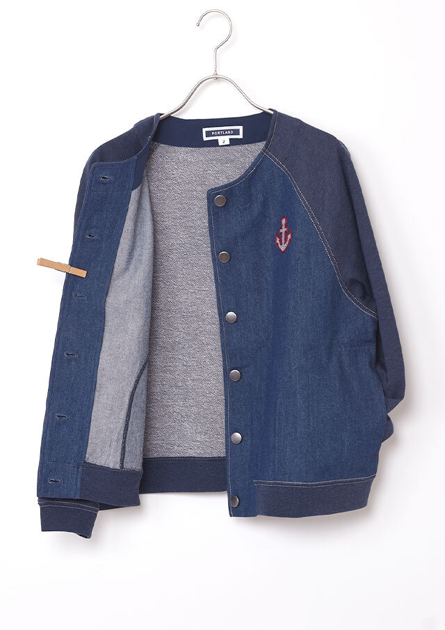 前身頃に軽やかなライトデニム、後身頃と袖にはやわらかなデニム風裏毛生地を組み合わせた、異素材ドッキングデザインのブルゾン。見た目はデニムの雰囲気を楽しみながらも、裏毛ならではのしなやかさで着脱時のごわつきを軽減し、袖通しもスムーズで、動きやすく快適な着心地。左胸のイカリモチーフのアップリケもポイントです。