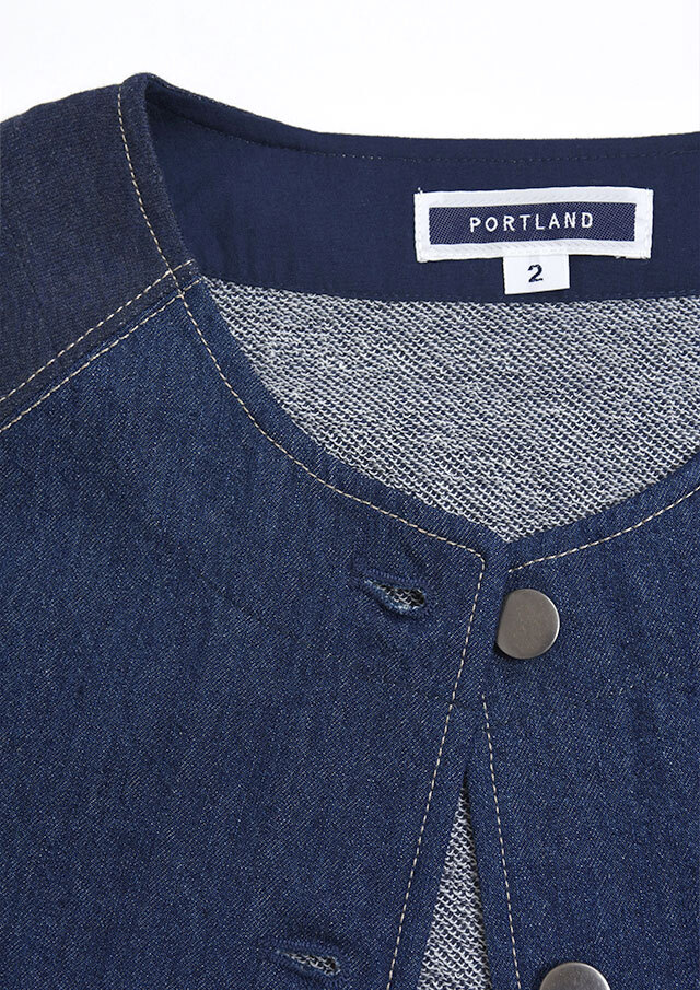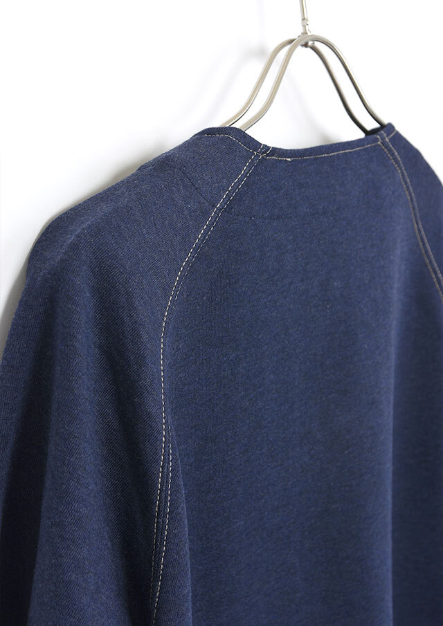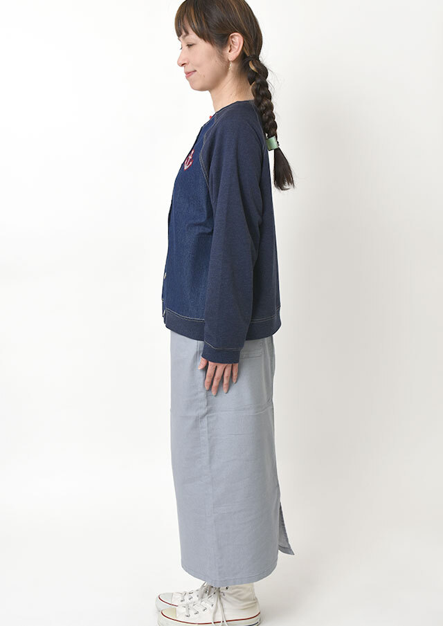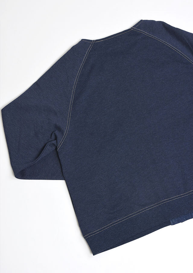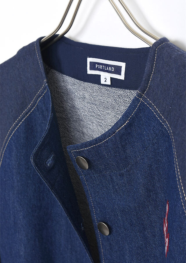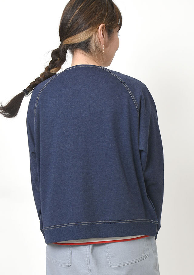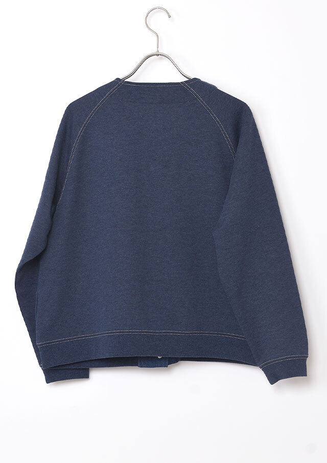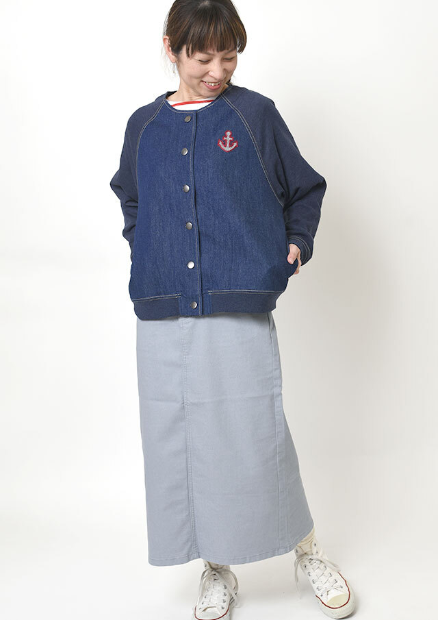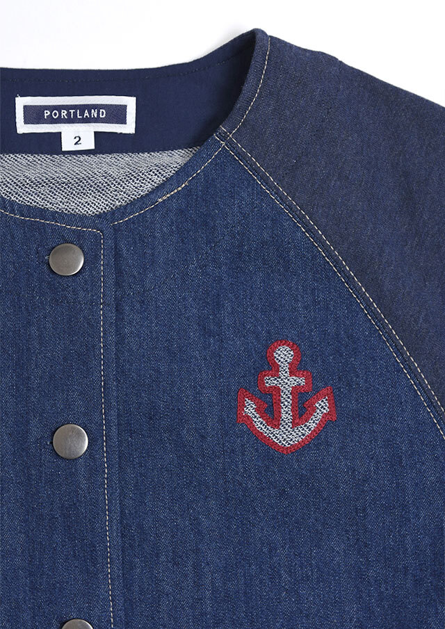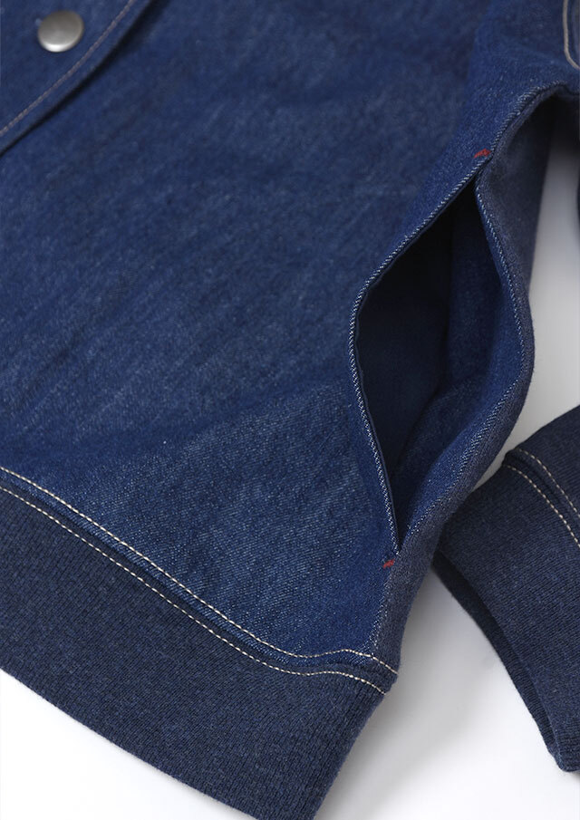 前身頃に軽やかなライトデニム、後身頃と袖にはやわらかなデニム風裏毛生地を組み合わせた、異素材ドッキングデザインのブルゾン。見た目はデニムの雰囲気を楽しみながらも、裏毛ならではのしなやかさで着脱時のごわつきを軽減し、袖通しもスムーズで、動きやすく快適な着心地。左胸のイカリモチーフのアップリケもポイントです。