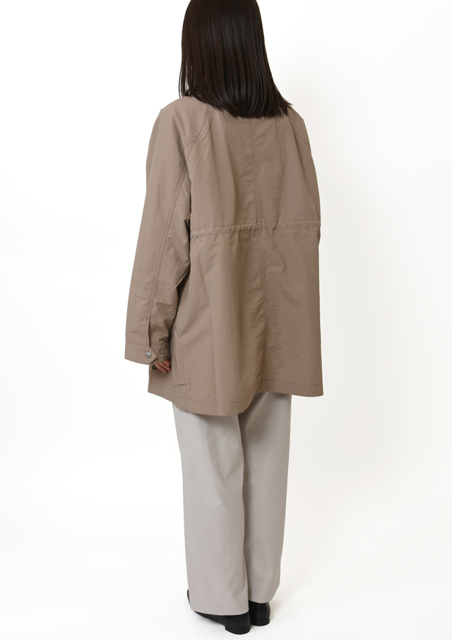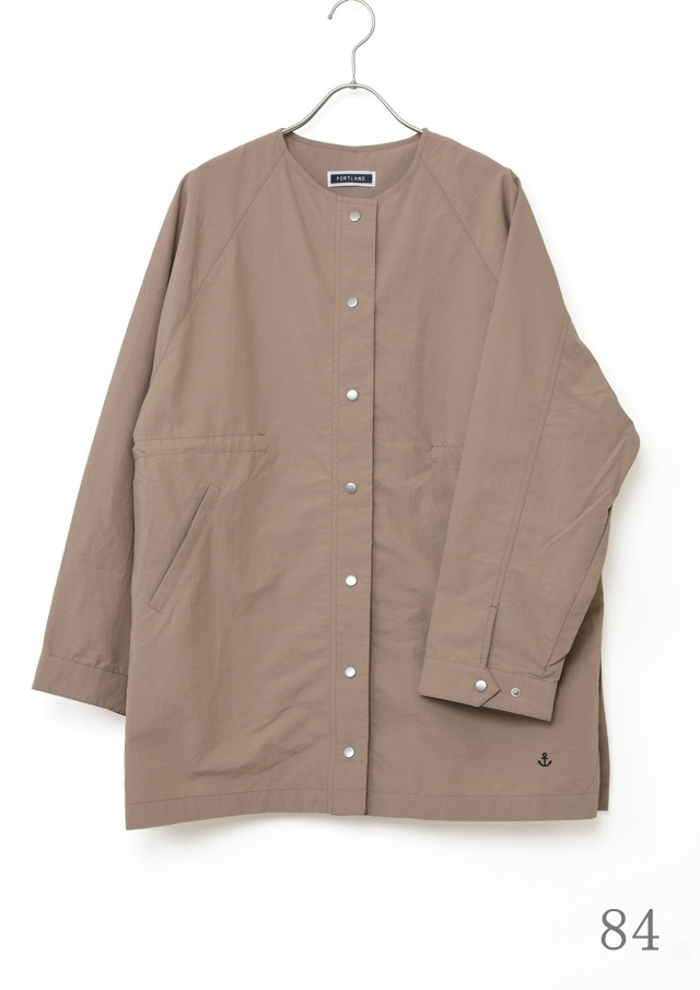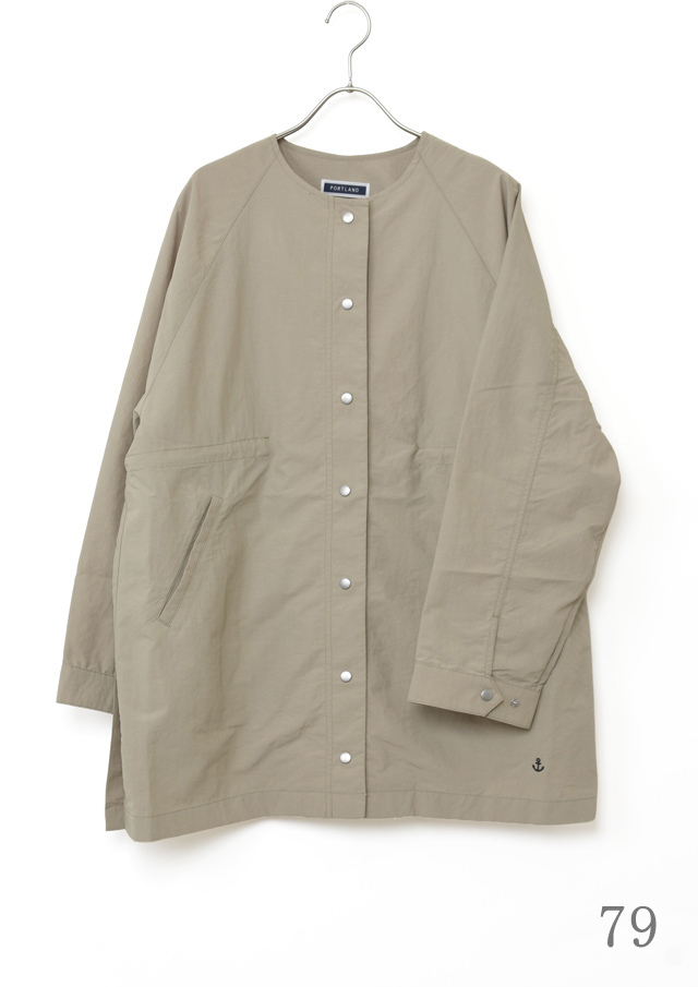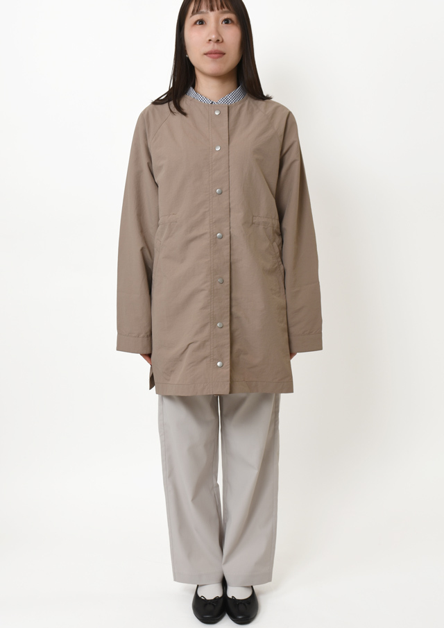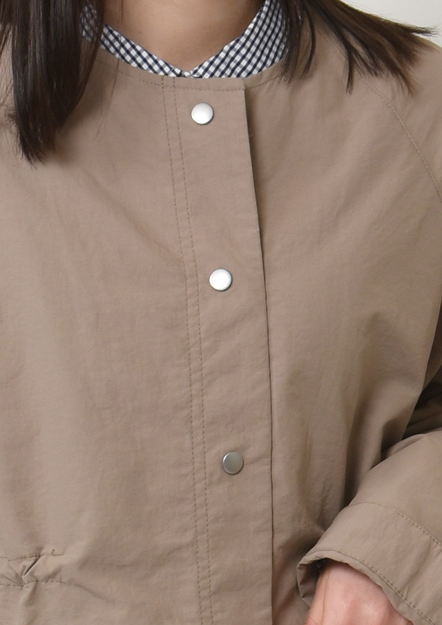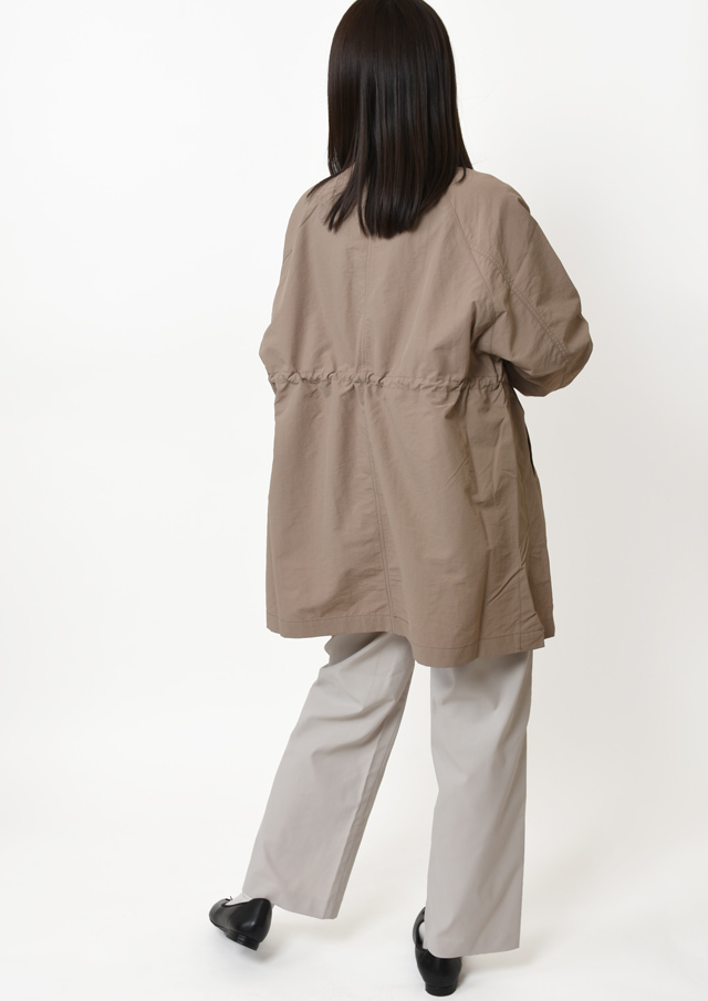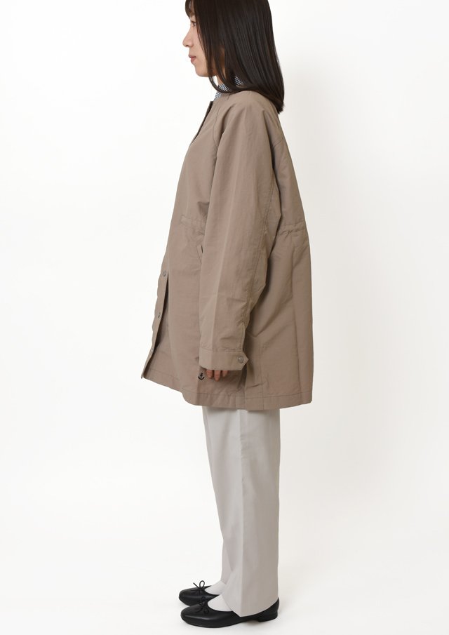 花粉が付きにくく、さっと払い落としやすい加工を施しているため、これからの季節のお出かけにも安心なノーカラーコート。ウエストにはドロストコードを施し、絞り具合でシルエットの変化を楽しめるデザインです。ノーカラーデザインなので、インナーやストールなど小物次第で襟元のレイヤードを楽しめます。ミドル丈で軽やかな印象に仕上がり、パンツはもちろんスカートスタイルとも好相性の一着です。
