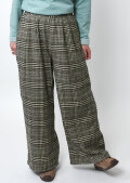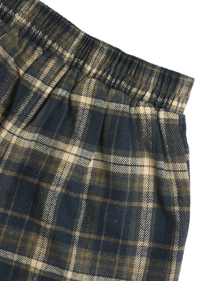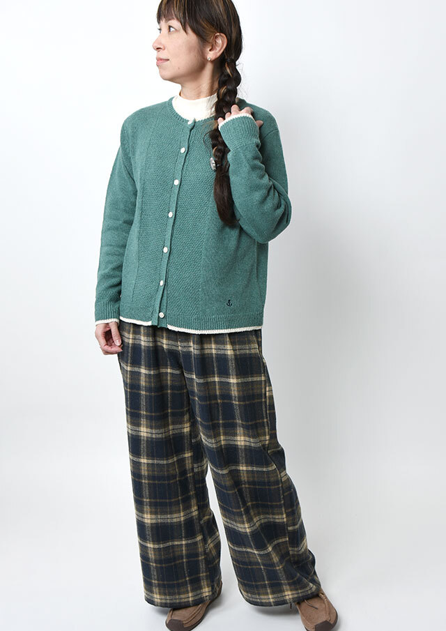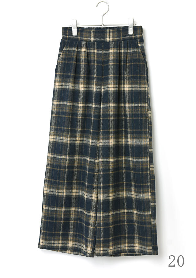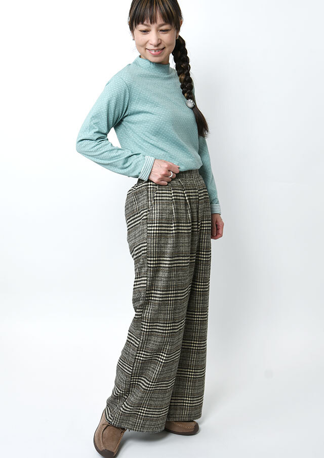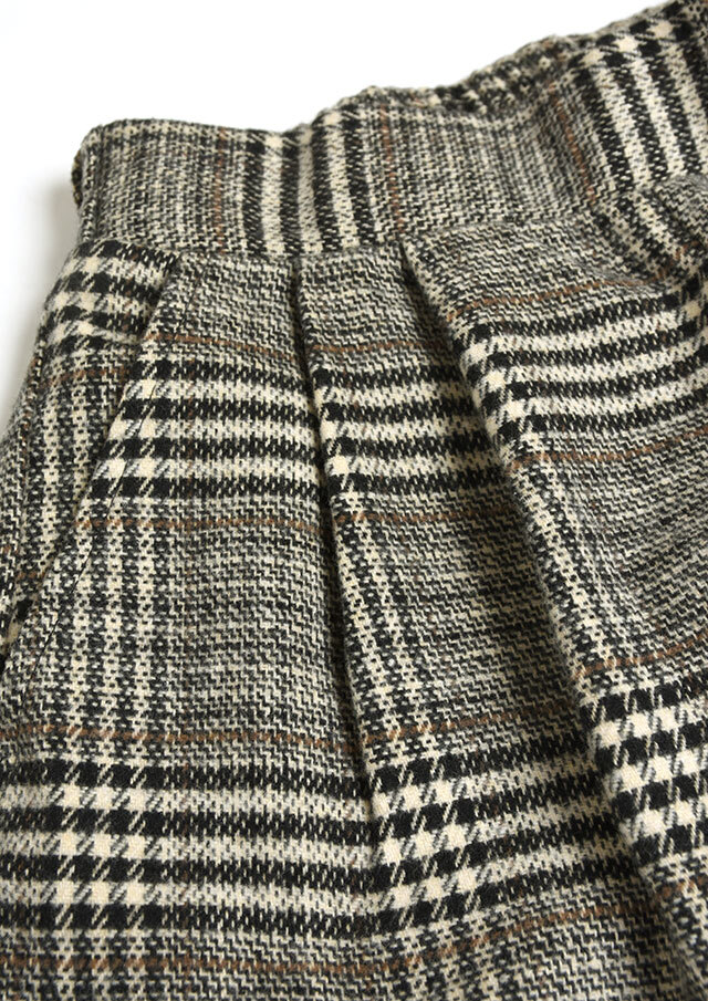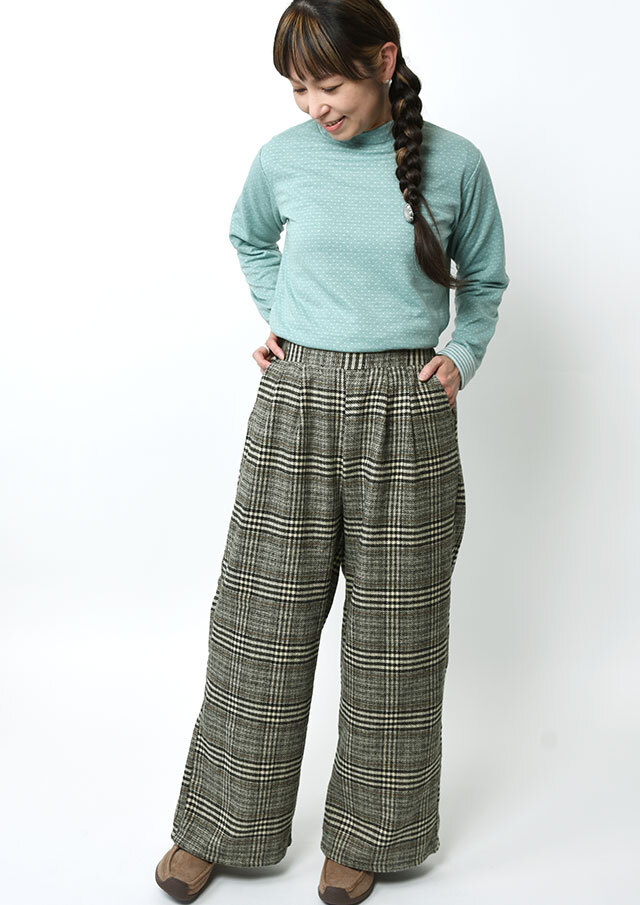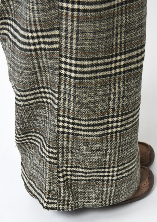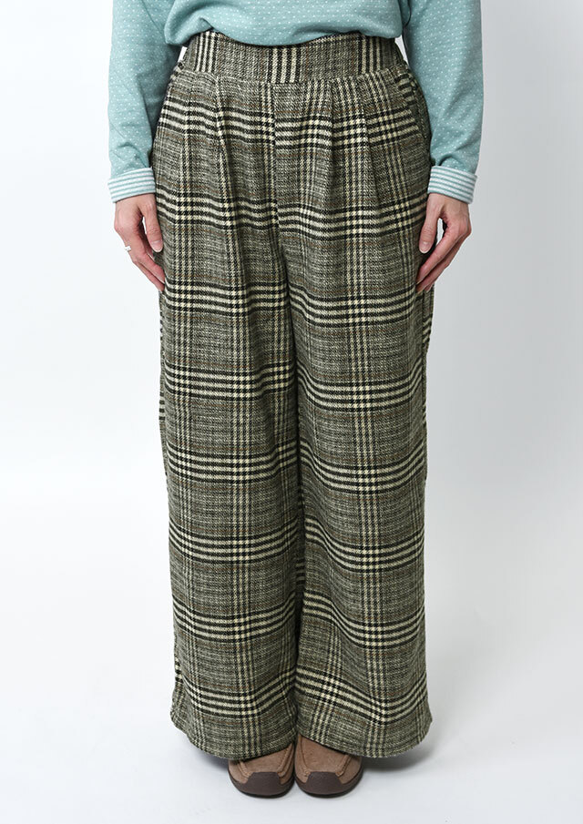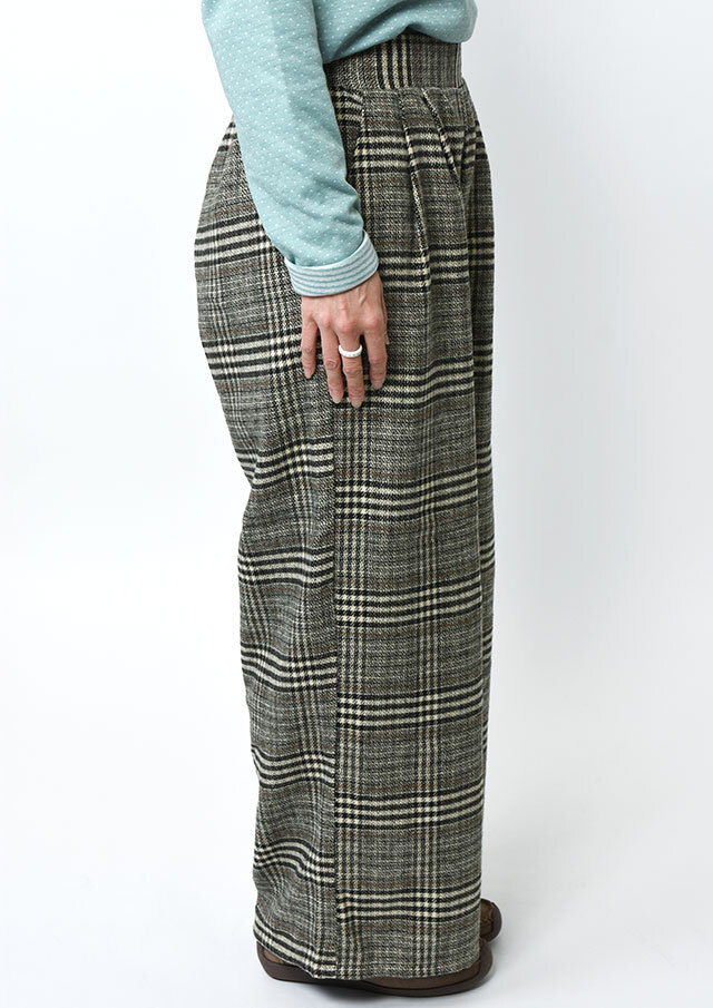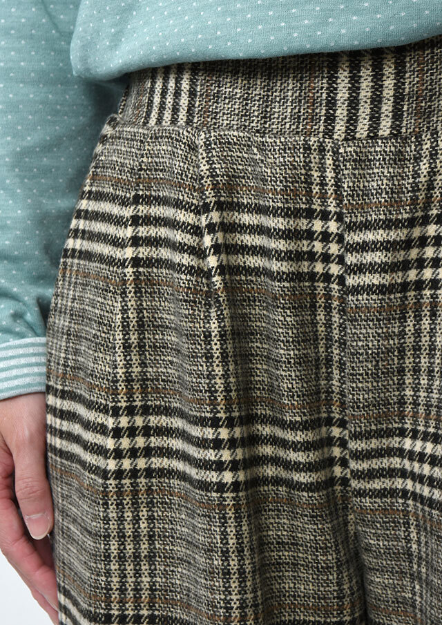 季節感たっぷりのフロント2タックのチェックパンツ。あたたかみのある起毛感が特徴の生地を使用し、秋冬のコーディネートにぴったりです。ウエストはプルオンタイプで穿き心地も快適。ゆとりのあるワイドシルエットが体のラインを拾わず、美しい落ち感を演出します。裏地付き(股下40cm)でデイリーにもお出かけにも活躍する一本です。