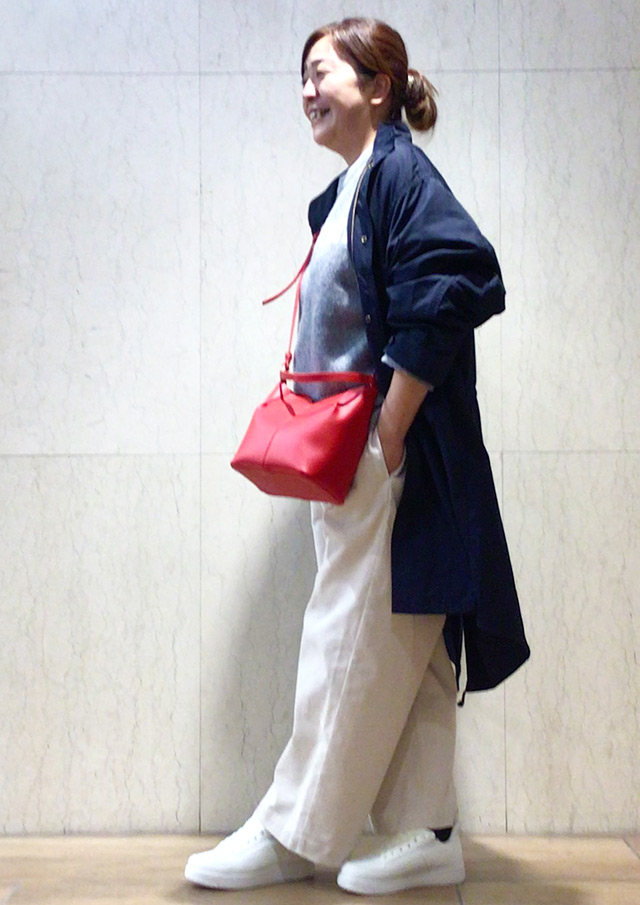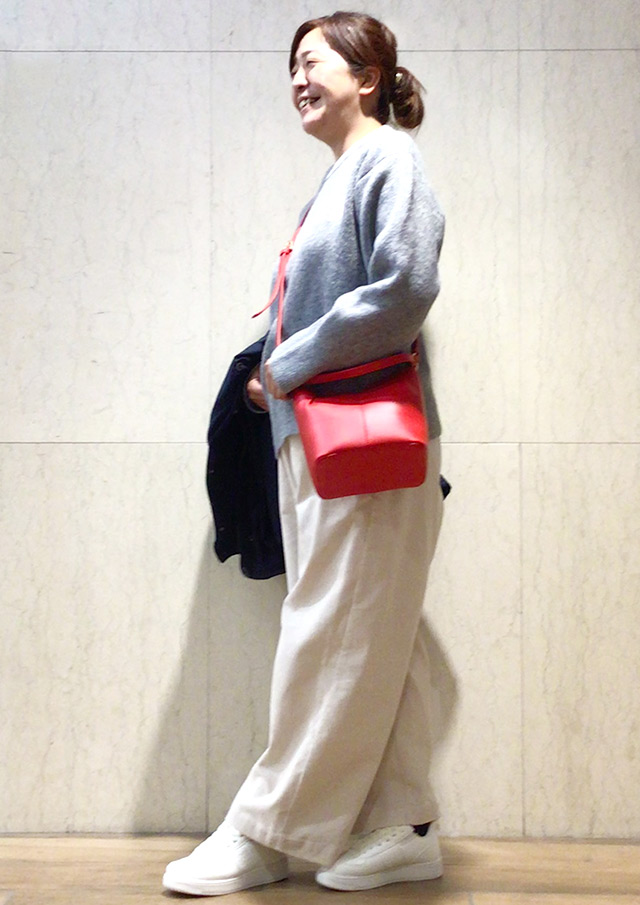 柔らかいニット×白ワイドパンツの組み合わせは、