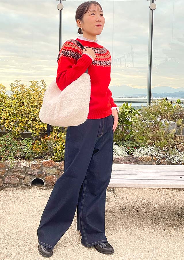 鮮やかなレッドが目を惹くノルディック柄ニットは、