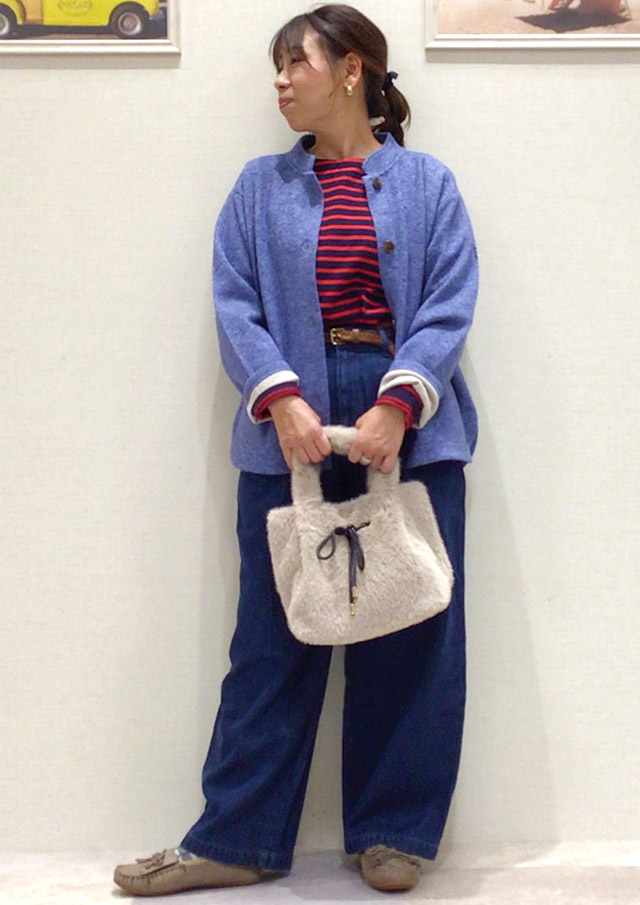 中にはネイビー×レッドのボーダーカットソーを合わせ、カラーリングと素材感を楽しむ冬コーデに♪