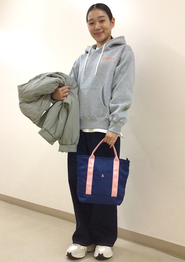優しいピンクの2wayバイカラーバッグで全体を柔らかく仕上げ、冬の公園散歩にも◎♪