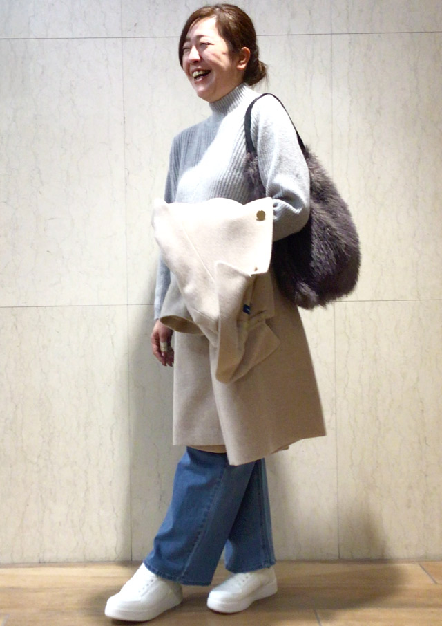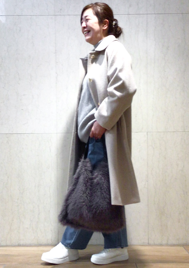 見た目以上の収納力が自慢のファーバッグと、キレイめロングコートを合わせたら、
