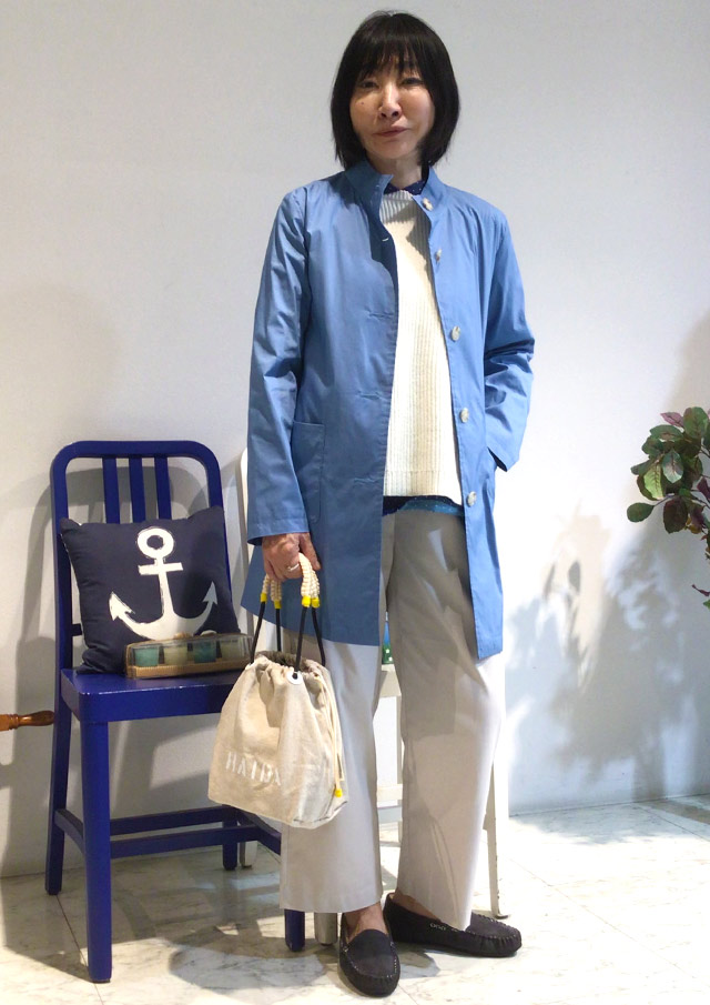 主役は、春らしいブルーのコート。