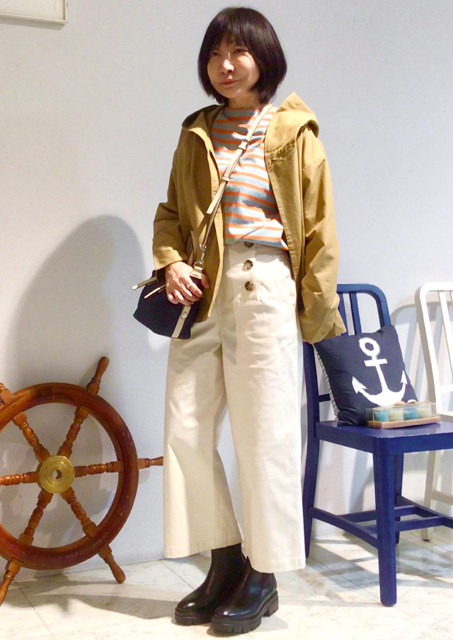 ショート丈のフードブルゾンに、マリンディテールが効いたワイドパンツを合わせた、ベージュやホワイトを基調にした少しボーイッシュな春コーデ。