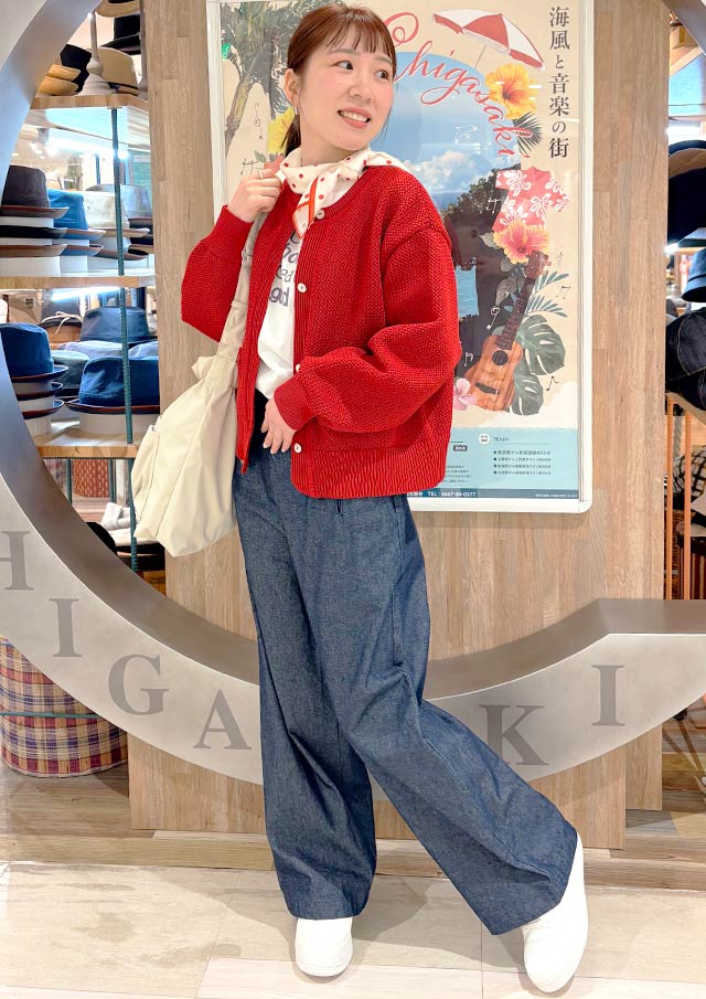 ロゴプリントTシャツに赤のカーディガンをプラスして、春らしい爽やかな配色に🎶