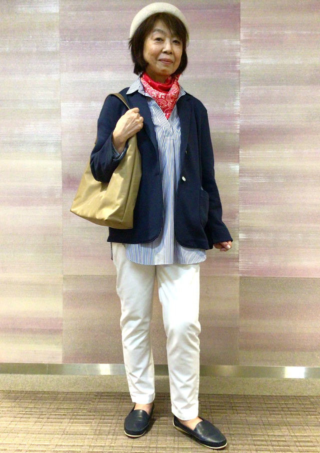 オフホワイトのチノパンで軽やかさを出し、赤のバンダナを差し色にしてアクセントをプラス✨