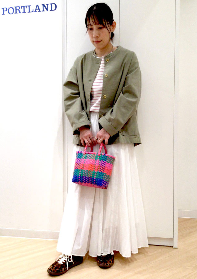 甘めな白×ピンクのボーダーに、あえて渋めのカーキを羽織って「こなれ感」をプラス。