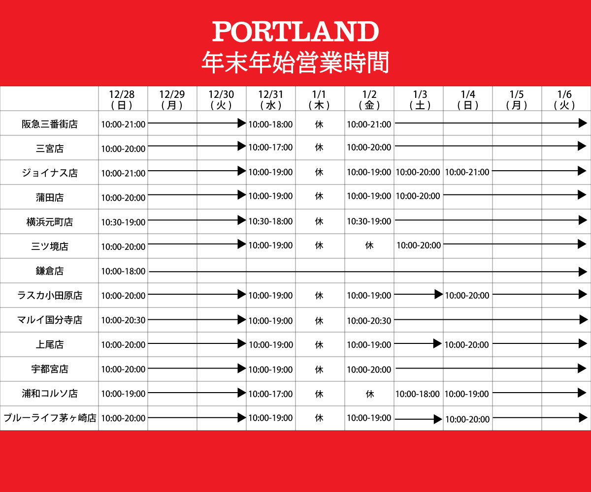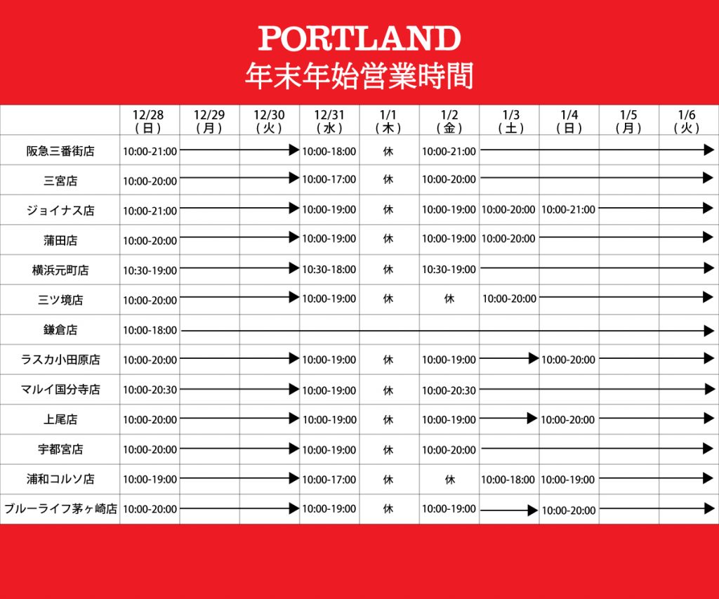 年末年始の営業時間のお知らせ いつもポートランドをご利用いただき、誠にありがとうございます。2025年〜2026年の年末年始の営業時間につきまして、下記のとおりご案内申し上げます。お客様にはご不便・ご迷惑をおかけいたしますが、何卒ご理解賜りますようお願い申し上げます。 ※諸般の事情により、営業日・営業時間 等が変更になる場合がございます。 ■<PORTLAND SHOP LIST>